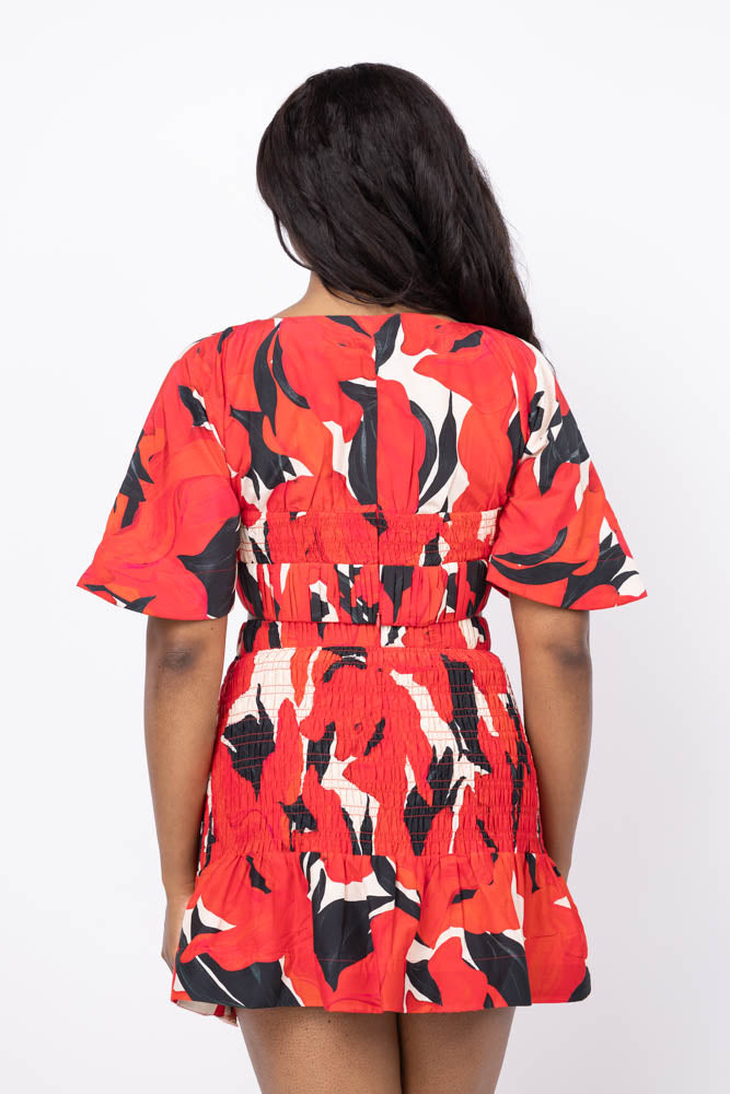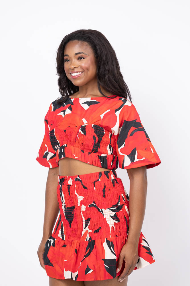 Elevate your wardrobe with the Amur Elle Smocked Cropped Top in Red Bloom. Crafted from a luxurious blend of cotton and silk, this top showcases a vibrant abstract print that adds artistic flair. The smocked bust offers a flattering fit, while the boatneck and short sleeves create a chic, effortless silhouette. Finished with a back zip closure for easy wear, this cropped style is perfect for making a stylish statement wherever you go.