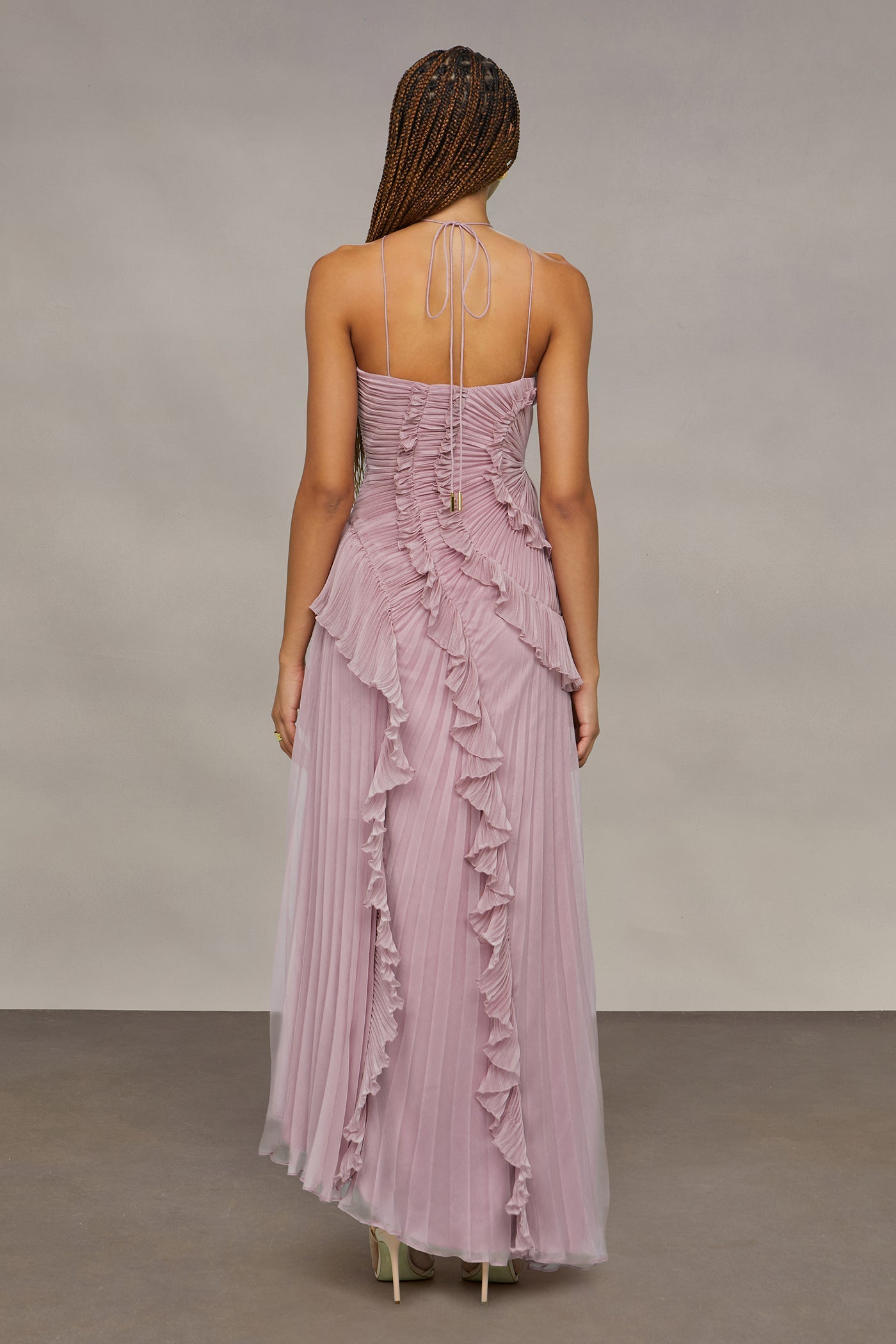 Drift into elegance with the AMUR Lorelie Halter Gown, a mesmerizing piece in dreamy dusty lilac. Inspired by the graceful movement of water lilies, intricate pleating adorns the bodice before flowing into delicate ruffles that echo gentle currents. The halter silhouette celebrates both form and fluidity, creating an enchanting silhouette perfect for those seeking a gown that's as poetic as it is stunning. Surrender to the romance of this aquatic-inspired design.