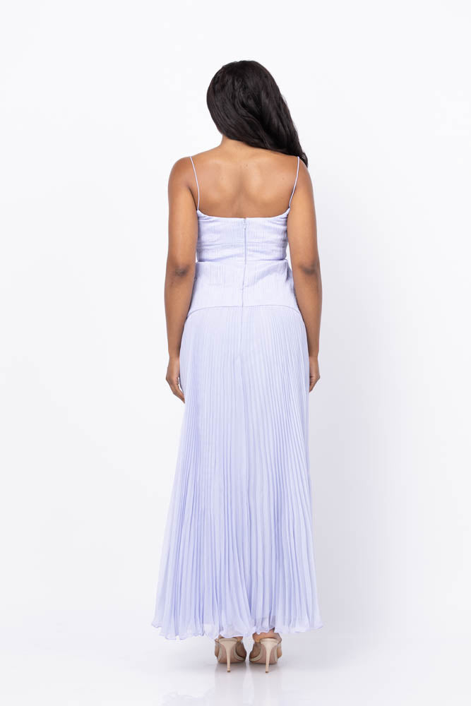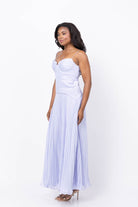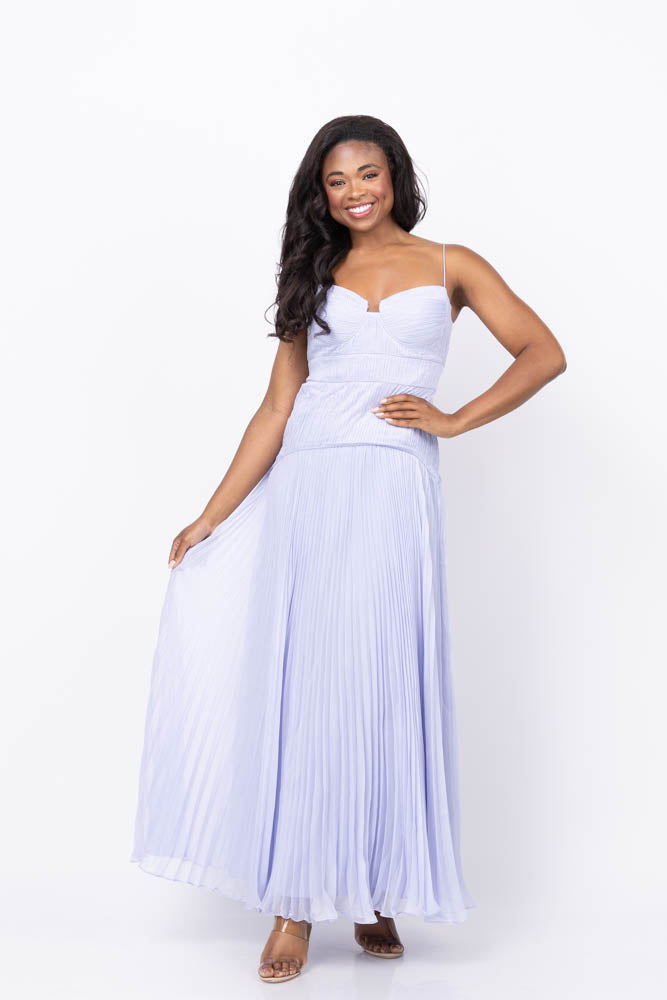 Crafted from lightweight crinkle chiffon with a silk-like feel, the AMUR Saylor Pleated Gown in Rain Cloud moves gracefully with every step. Its sculpted bust and slanted neckline create a flattering silhouette, while the full sunburst-pleated skirt adds elegant volume. This gown offers a fresh, modern twist on romantic style, perfect for making a memorable impression at any special occasion.