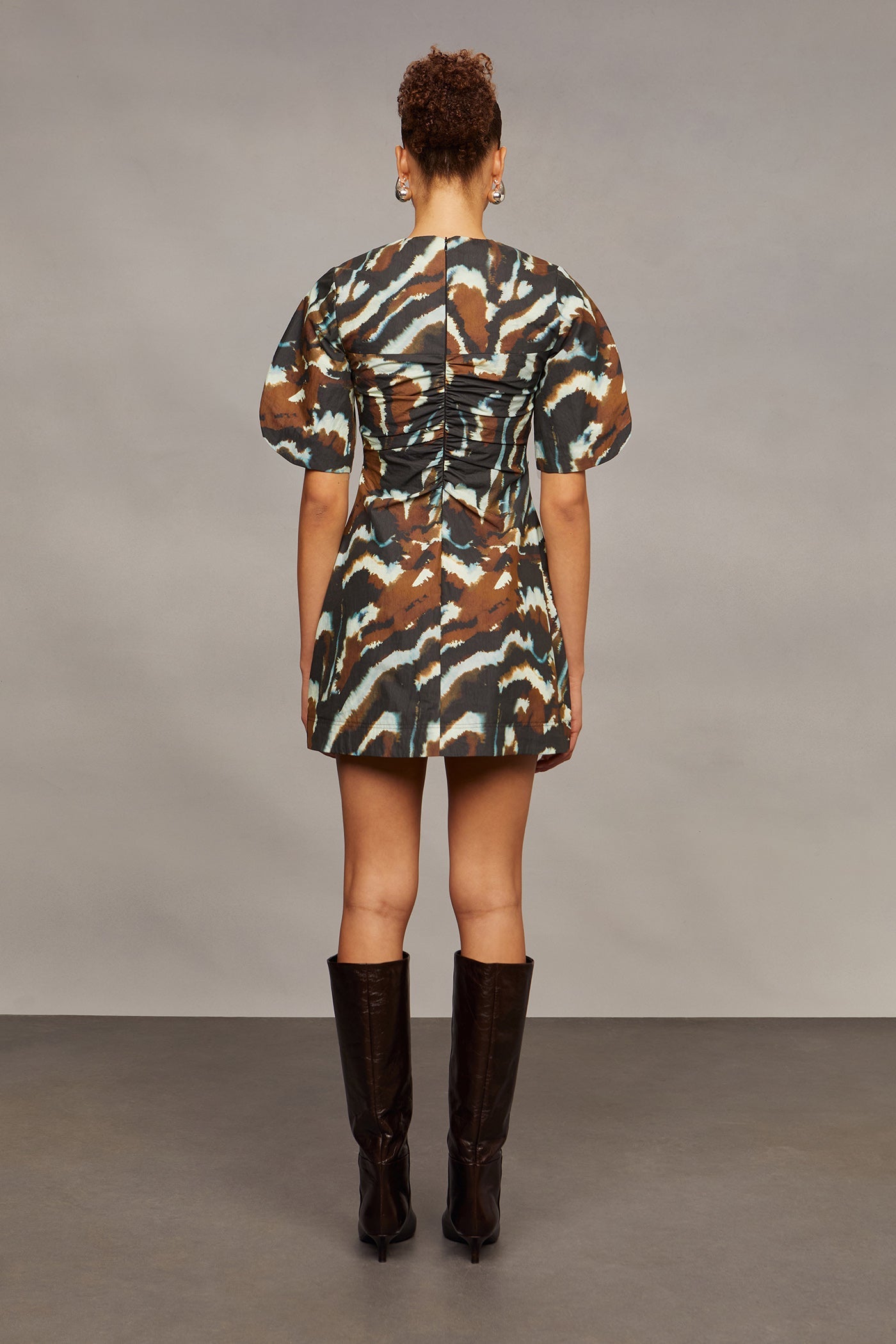 Make a lasting impression with the AMUR Tanner Puff Sleeve Mini in Aerial Terrain. Featuring a bold zebra-inspired abstract watercolor print, this mini dress showcases puffed sleeves and a ruched bodice that sculpt and define your shape. Structured yet playful, it’s designed to turn heads and elevate your style for any standout occasion.