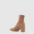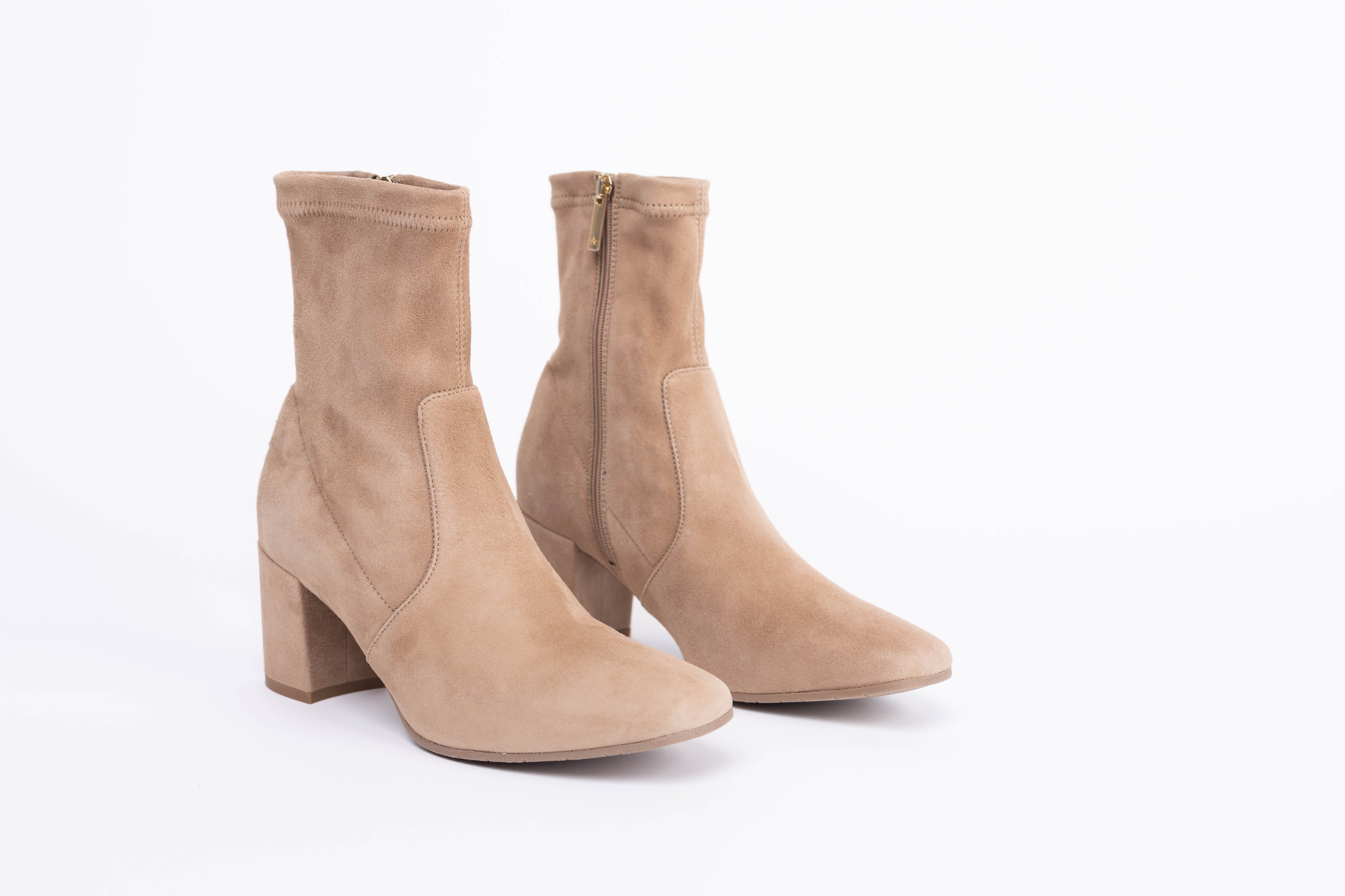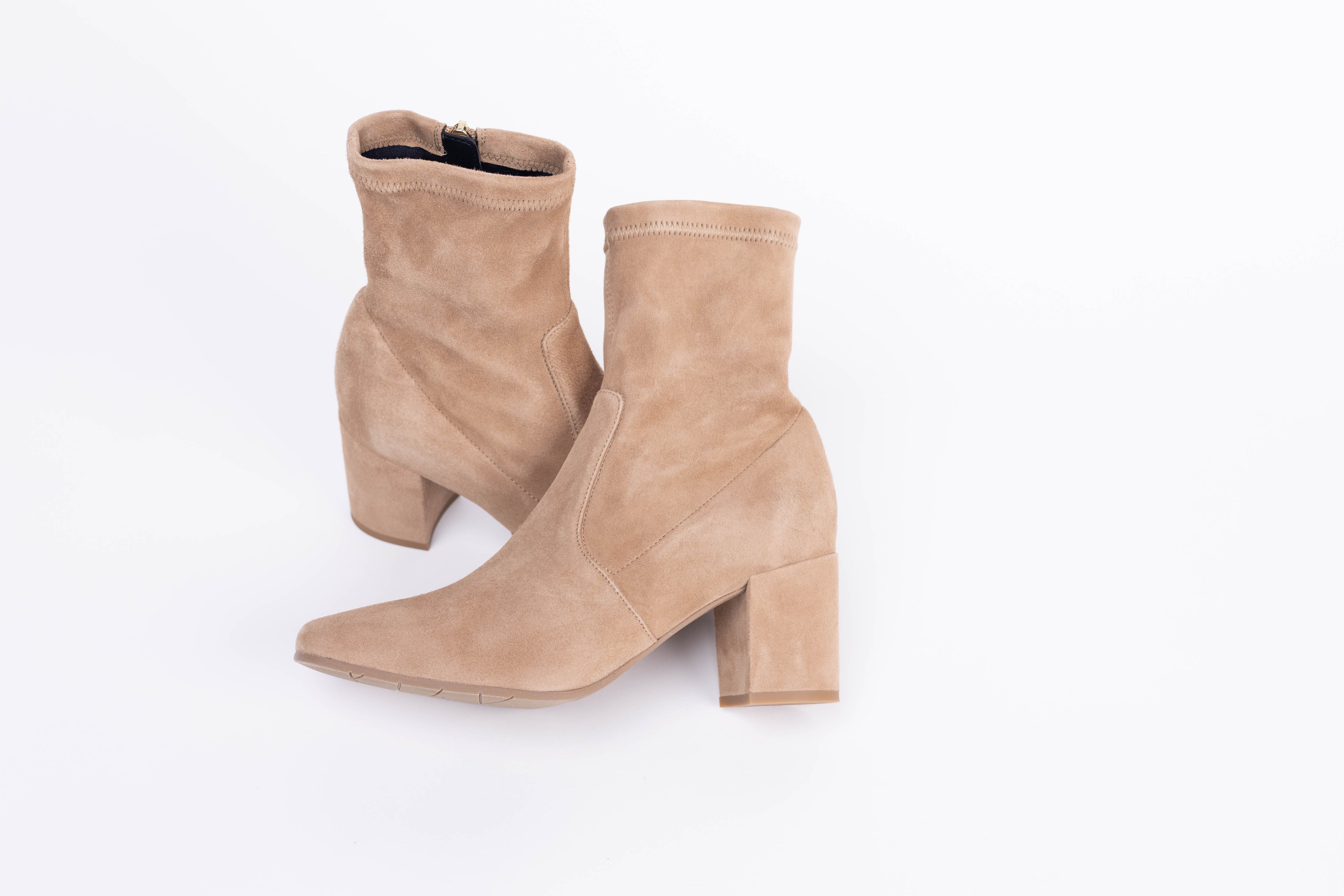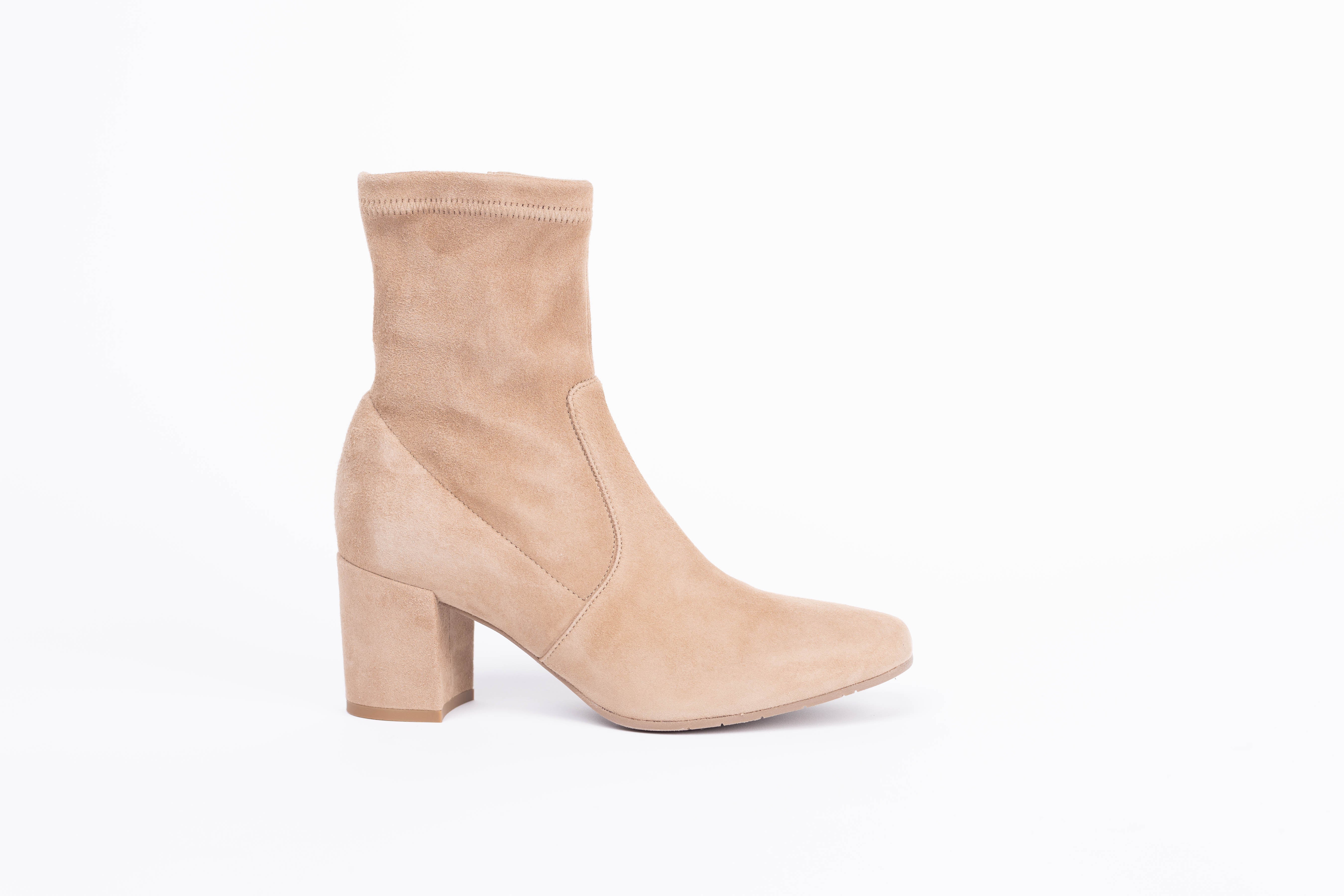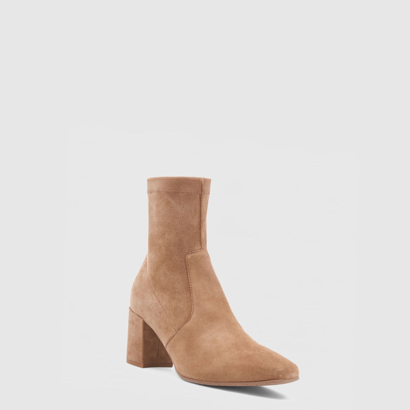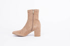 Elevate your transitional wardrobe with the Aquatalia Demetra Boots in Champagne Suede. Crafted from soft, water-resistant suede, these booties feature a square toe and geometric block heels for a modern, minimalist style. Their thermal lining ensures warmth and comfort, making them a chic yet practical choice for cooler days.