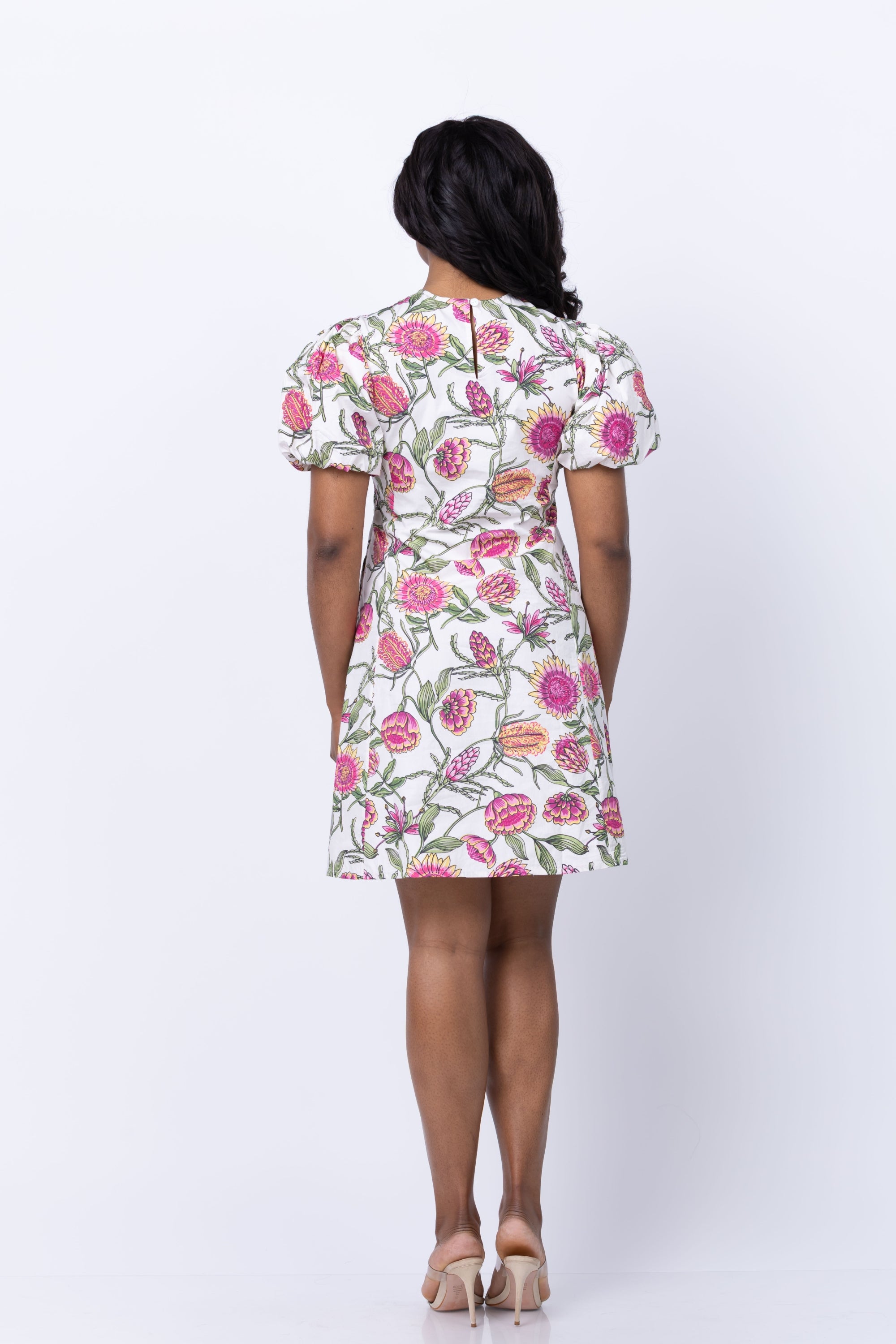 Indulge in the romantic and feminine style of the Banjanan Gracia Dress in Cypress. With puff sleeves and a delicate floral print, this dress is perfect for any occasion. Pair it with your favorite heels for a stunning and sophisticated look. Elevate your wardrobe with this must-have dress!