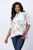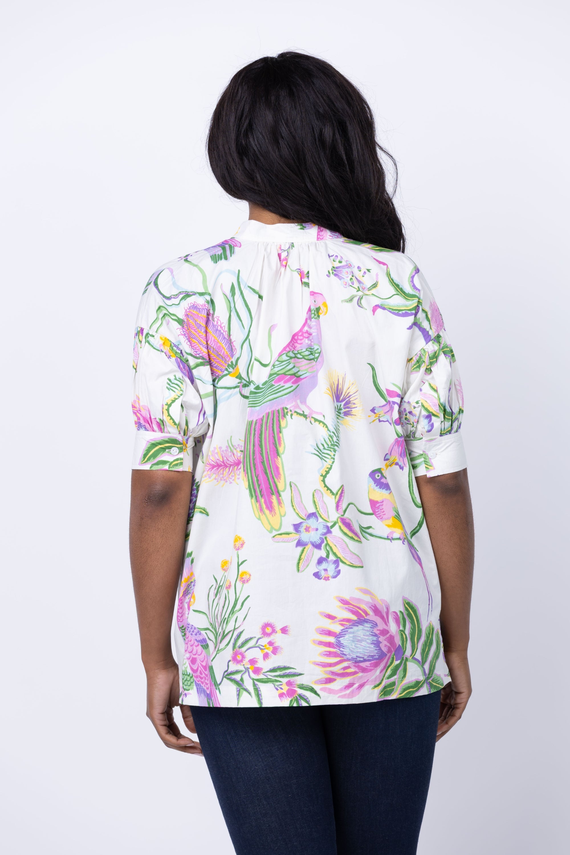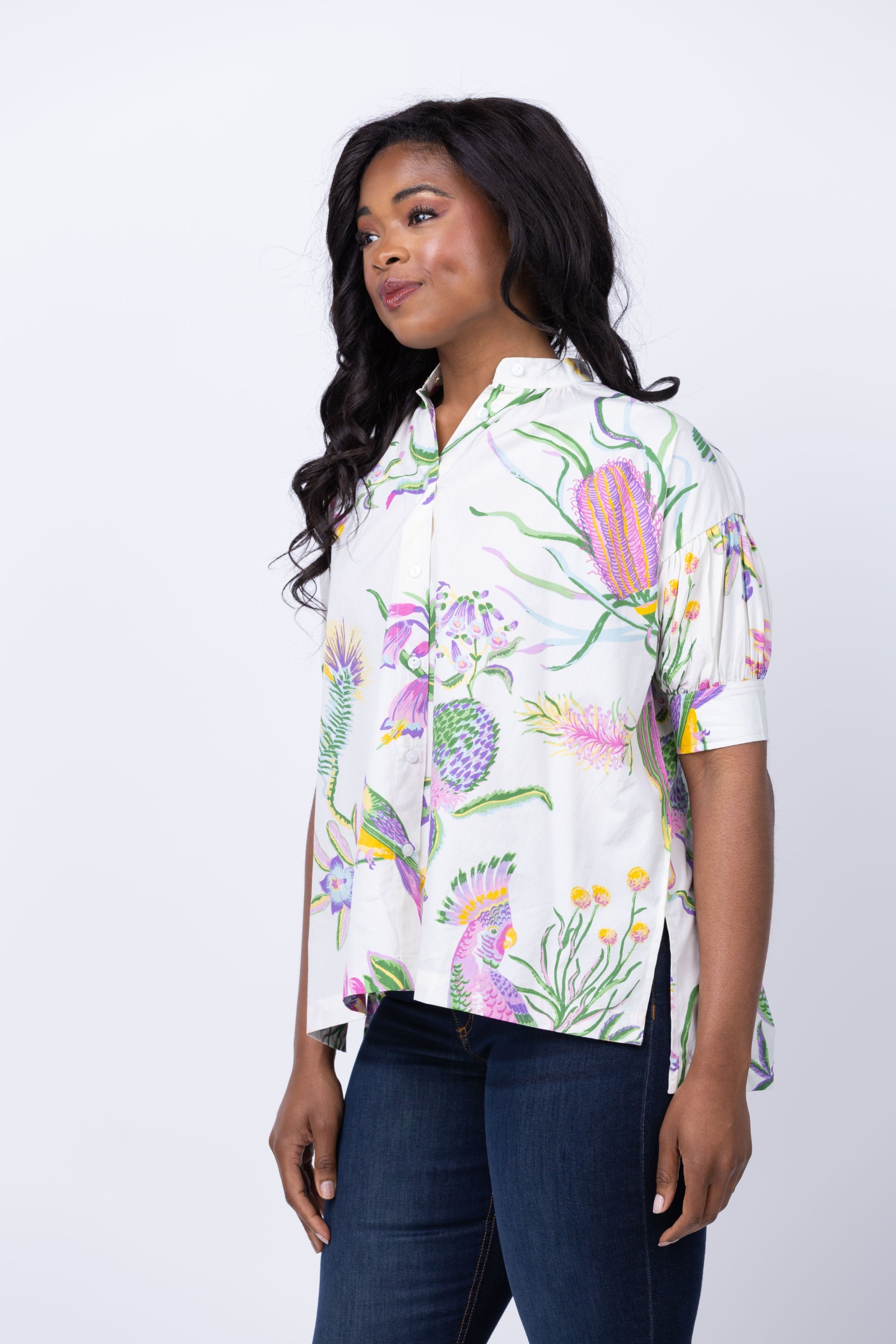 Introducing the Banjanan Ivy Shirt, a must-have for spring. This easy-fitting button-down features beautiful Australian-inspired prints and subtle topstitch details. Its crisp cotton poplin fabric and gentle gathers offer both comfort and movement.