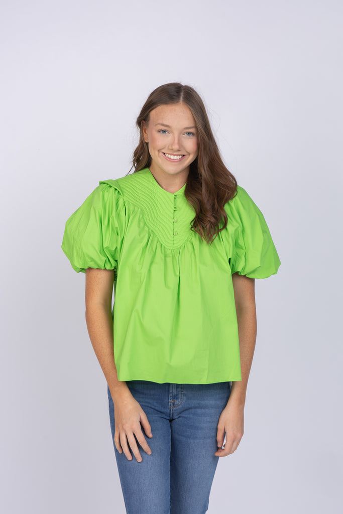 Light up your wardrobe with the Gilner Farrar Brynn Top in Green Apple Pop! This vibrant piece features a neon pop of color and puff sleeves that will be sure to turn heads. Make your statement with this must-have top!