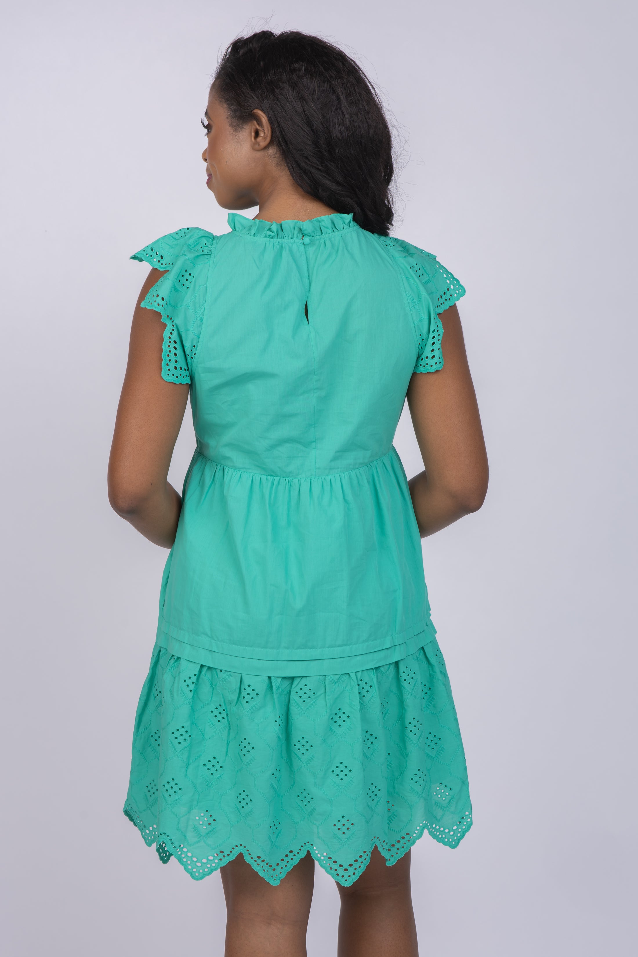 This Caballero dress offers a figure-flattering fit, with its high neckline and ruffled short sleeves. Its smocked bodice and one-tiered ruffle skirt with inseam pockets will have you turning heads. A keyhole opening in the back completes the look.