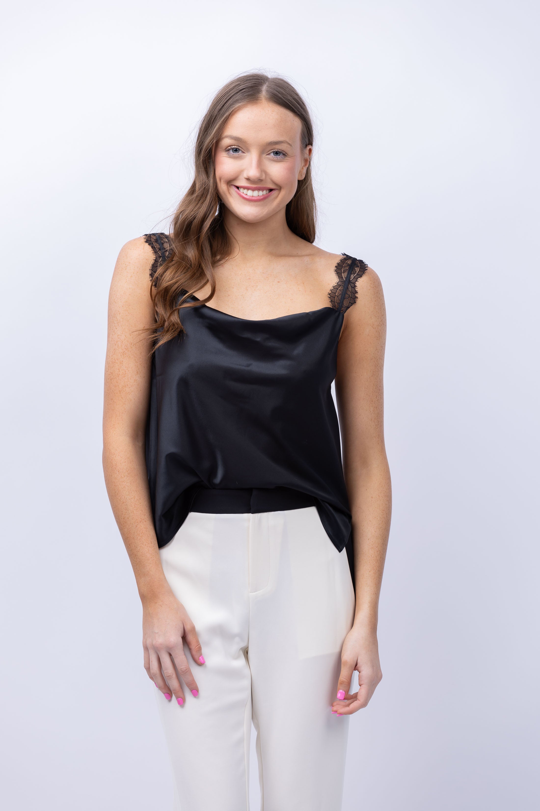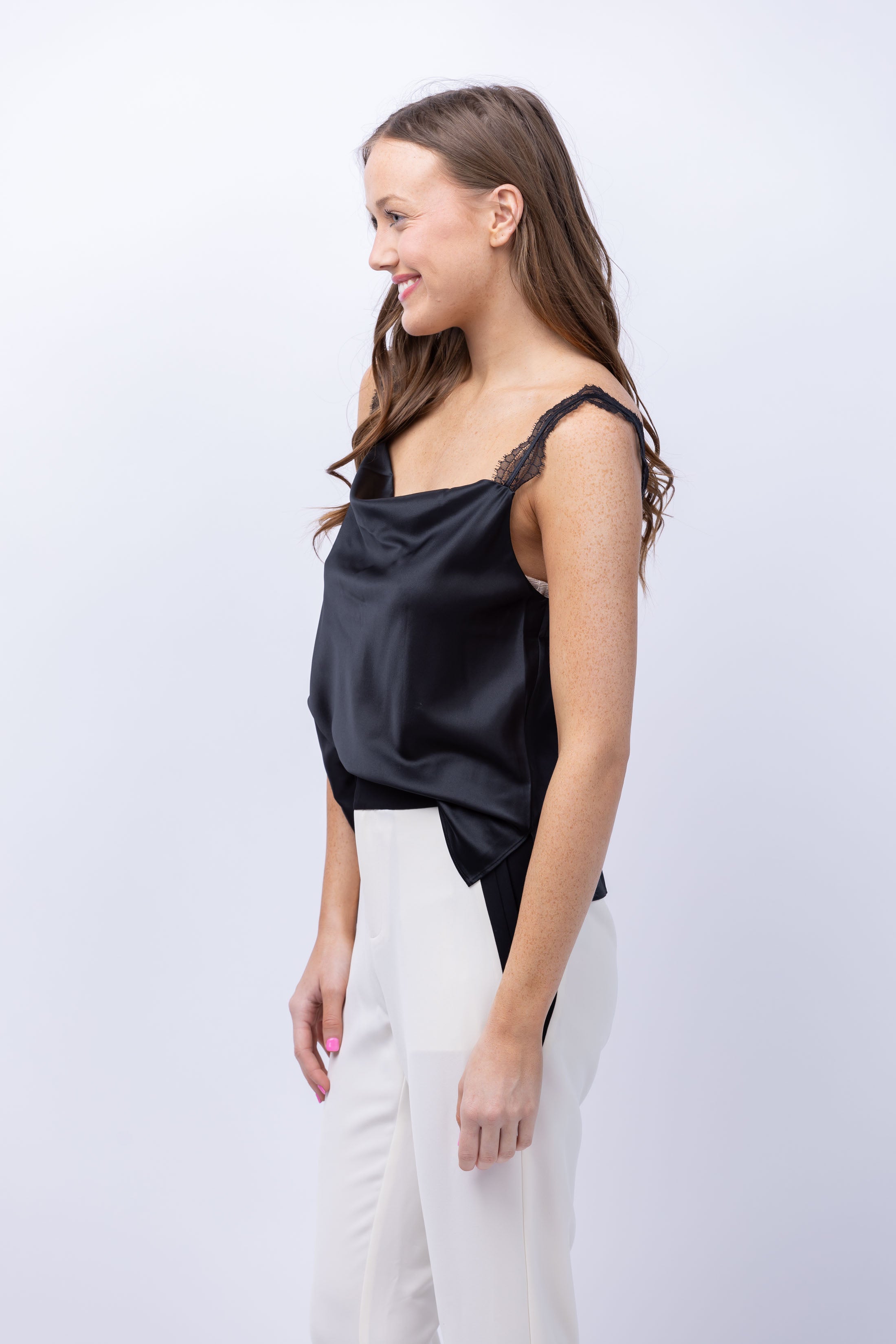 Elevate your style with the Cami NYC Florcita Cami in Black. This bra-friendly top features a cowl neck and delicate lace straps, adding a touch of elegance to any outfit. With side slits and a lightweight, unlined design, it's the perfect blend of comfort and sophistication. Make a statement and feel confident in this must-have piece!