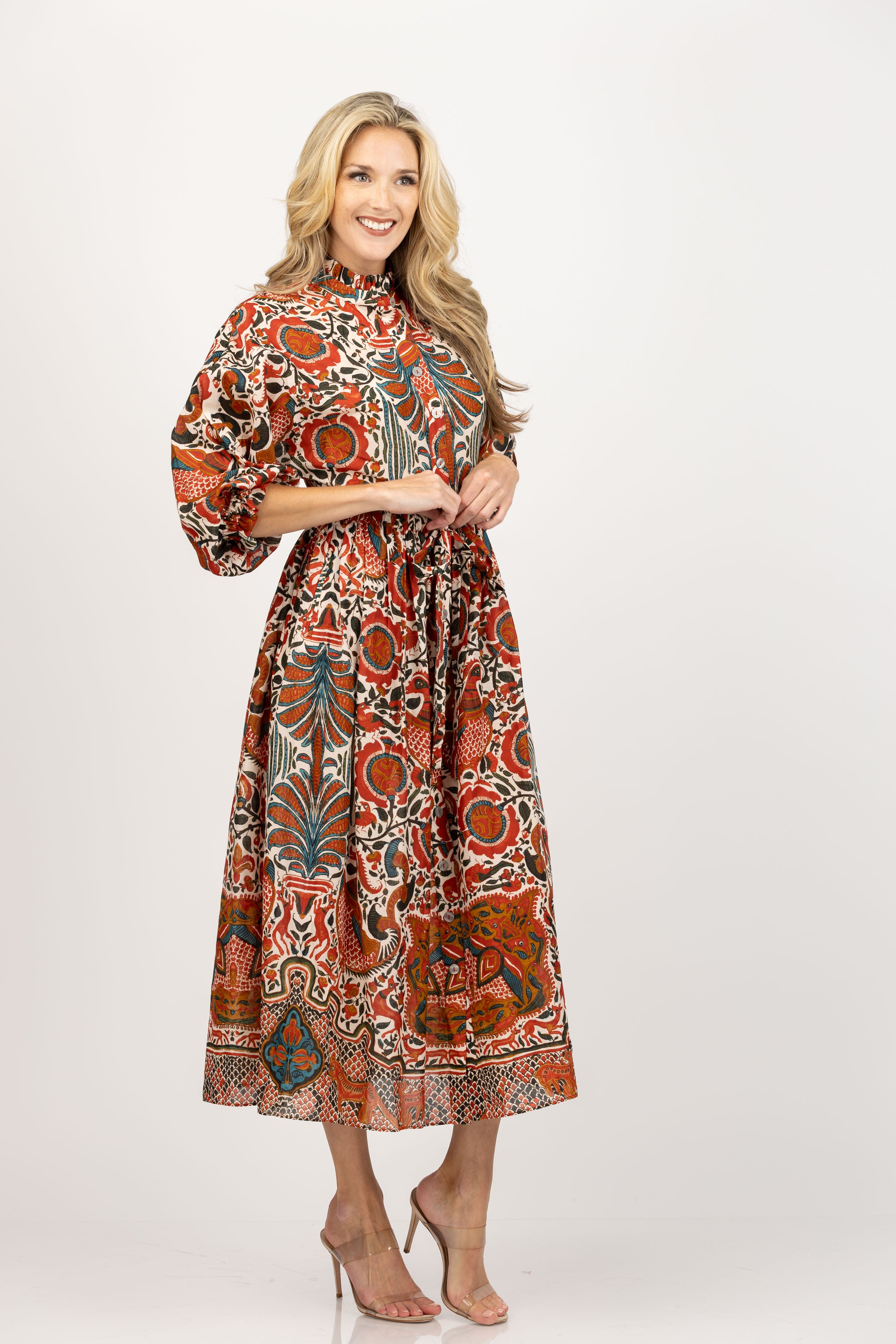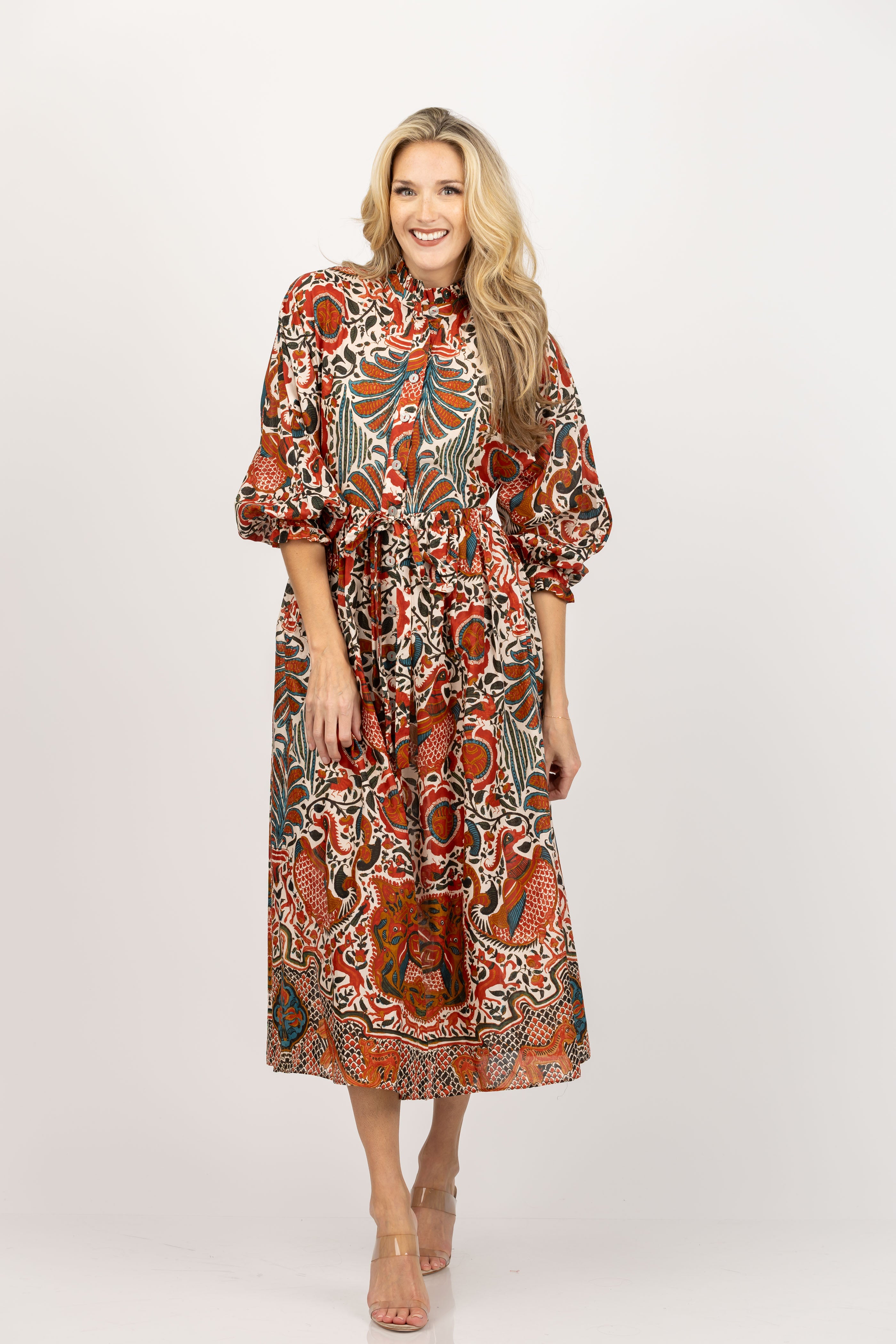Be effortlessly chic and comfortable in the Cara Cara Beatrice Dress! This turtledove Luxo dress features a functional drawstring at the waist for a flattering fit, dolman sleeves with charming ruffles at the cuffs and neckline, and a placed print for a unique touch. With a center front placket opening and functional buttons, this dress is both stylish and functional. The elastic back on the sleeve cuffs adds extra comfort. Upgrade your wardrobe with this must-have dress!