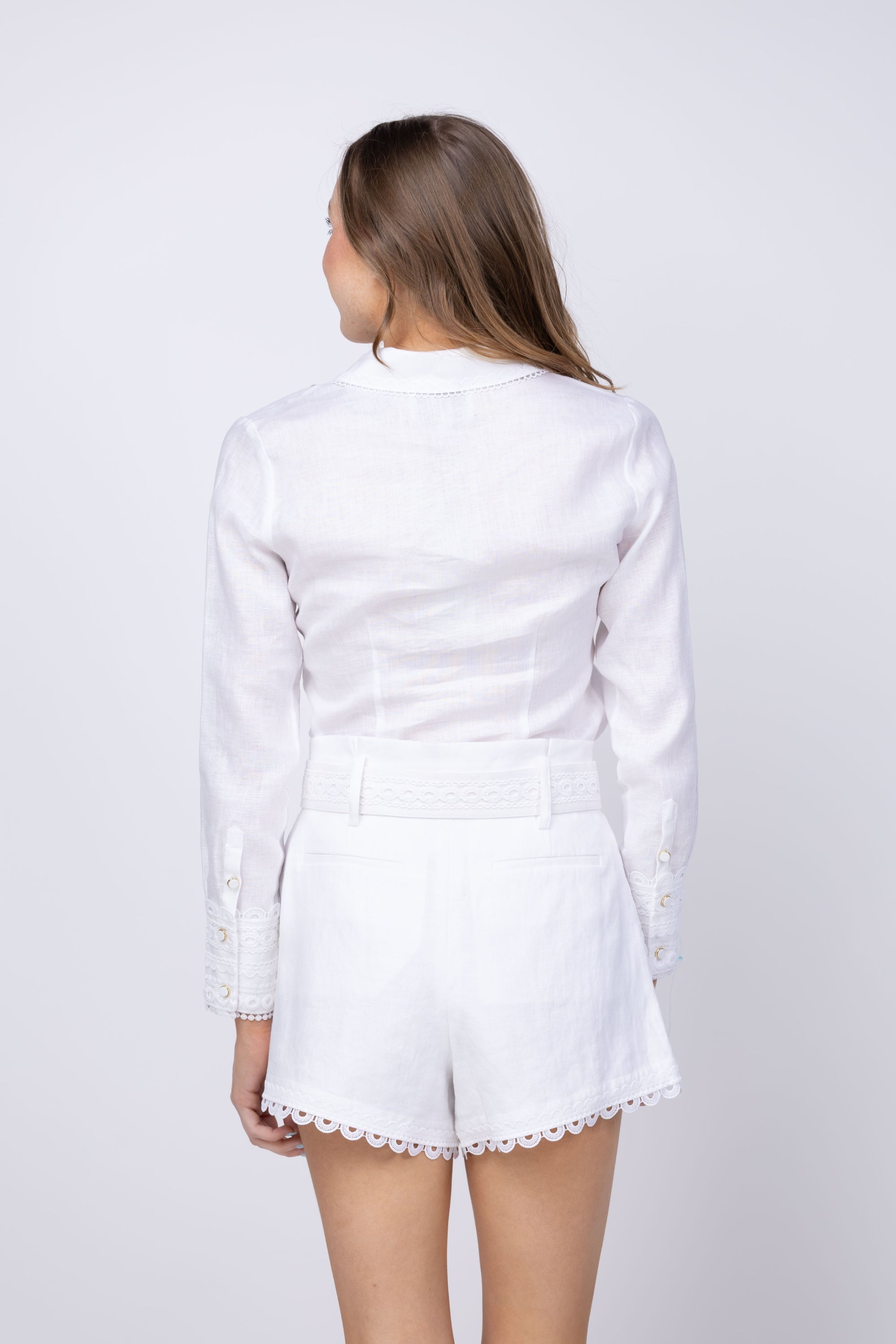 Elevate your everyday wardrobe with this classic button-down shirt featuring refined details. The elongated cuffs showcase a placket opening with two pleats, while delicate lace inserts run through the center front body panel, collar, and cuffs for an added touch of elegance. A center front placket button opening and tiny side slits at the hem complete the design. Unlined for a lightweight, breathable feel.