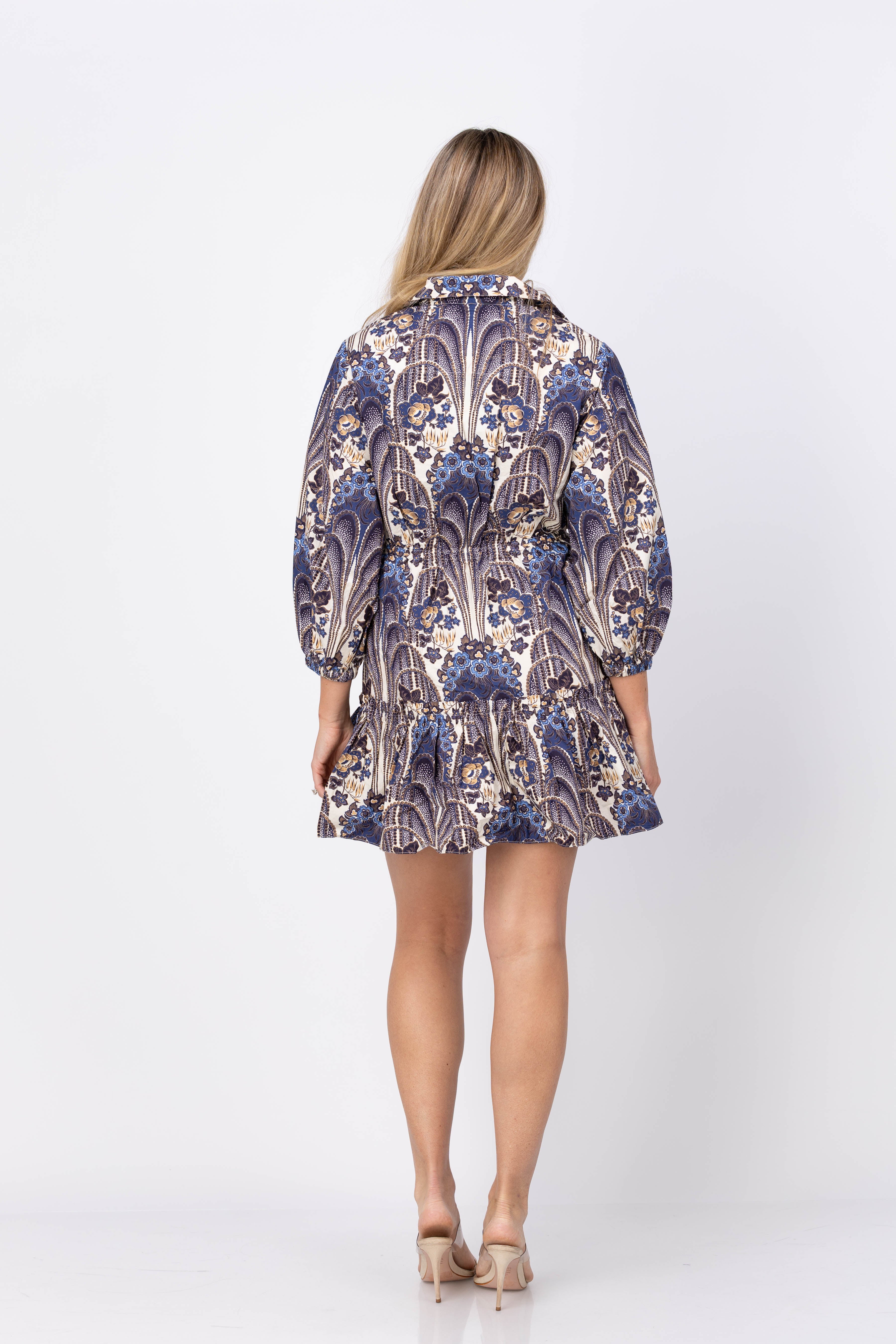 The Cara Cara Robin Dress in Fontaine Egret offers effortless style with a tent silhouette and self-tie cinch waist, flattering every figure. Its ruffle-tiered skirt, puffed sleeves, and collared neckline create a chic, versatile look perfect for any season. Wear it with heels and statement jewelry for elegant occasions or dress it down with a chunky knit and sneakers for casual comfort. The above-the-knee hem and easy fit make this unlined dress a go-to piece for your wardrobe. Embrace comfort and style in one flattering design.