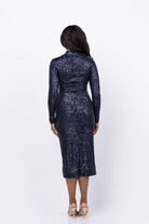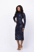 Elevate your evening style with the Cara Cara Ryan Dress in Midnight Sequins. This slim midi dress features a flattering turtleneck and fitted long sleeves, accentuating your silhouette with a draped waist and carefully placed shirring on the left side. Fully lined in breathable mesh, it ensures comfort while the invisible back zipper with hook-and-eye closure offers a sleek finish. Perfect for making a sophisticated statement at any event.