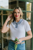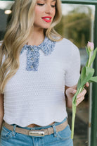 Discover understated elegance with the Central Park West Wren Scallop Edge Crochet Polo in Navy Combo. This textured crochet knit polo combines timeless appeal with modern sophistication. The woven scalloped collar and placket feature a striking contrasting pattern that adds visual interest without overwhelming your look. Short sleeves keep things breezy, while the cropped hemline flatters your silhouette and cinches at the waist for a refined, put-together appearance. Pair it with your favorite denim or dress it up for versatile styling that works from morning coffee to evening plans.