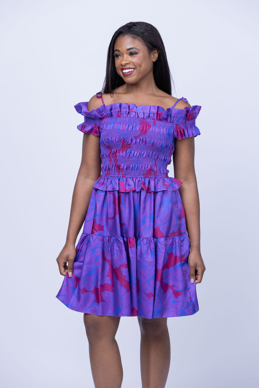 Fall in love with this stunning Christy Lynn Carlotta dress. Crafted from classic satin, it features flattering off-shoulder silhouette with elastic smocking thread at the bodice and sleeves for comfort, and adjustable self-tie straps. Turn heads with this vibrant bloom dress!