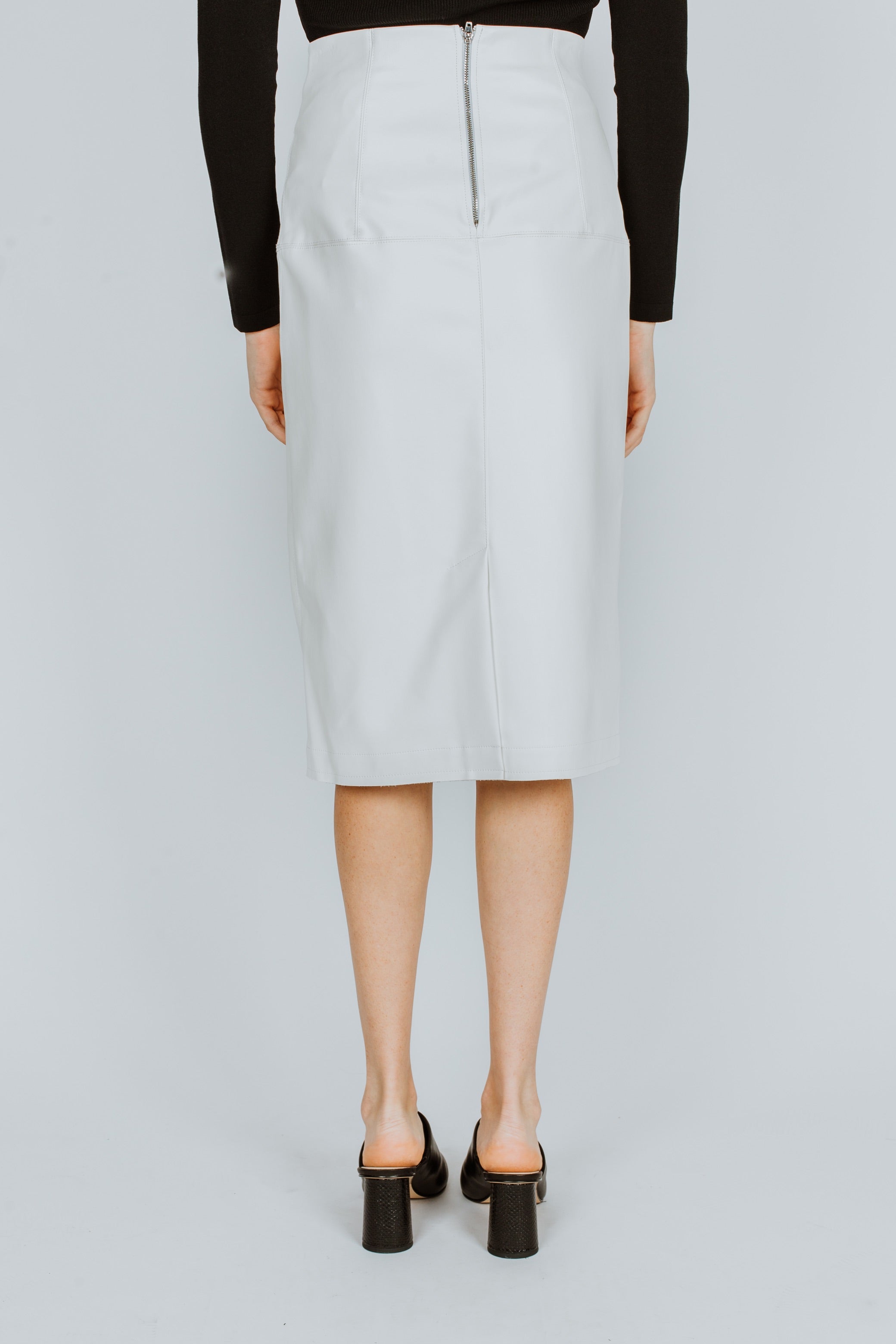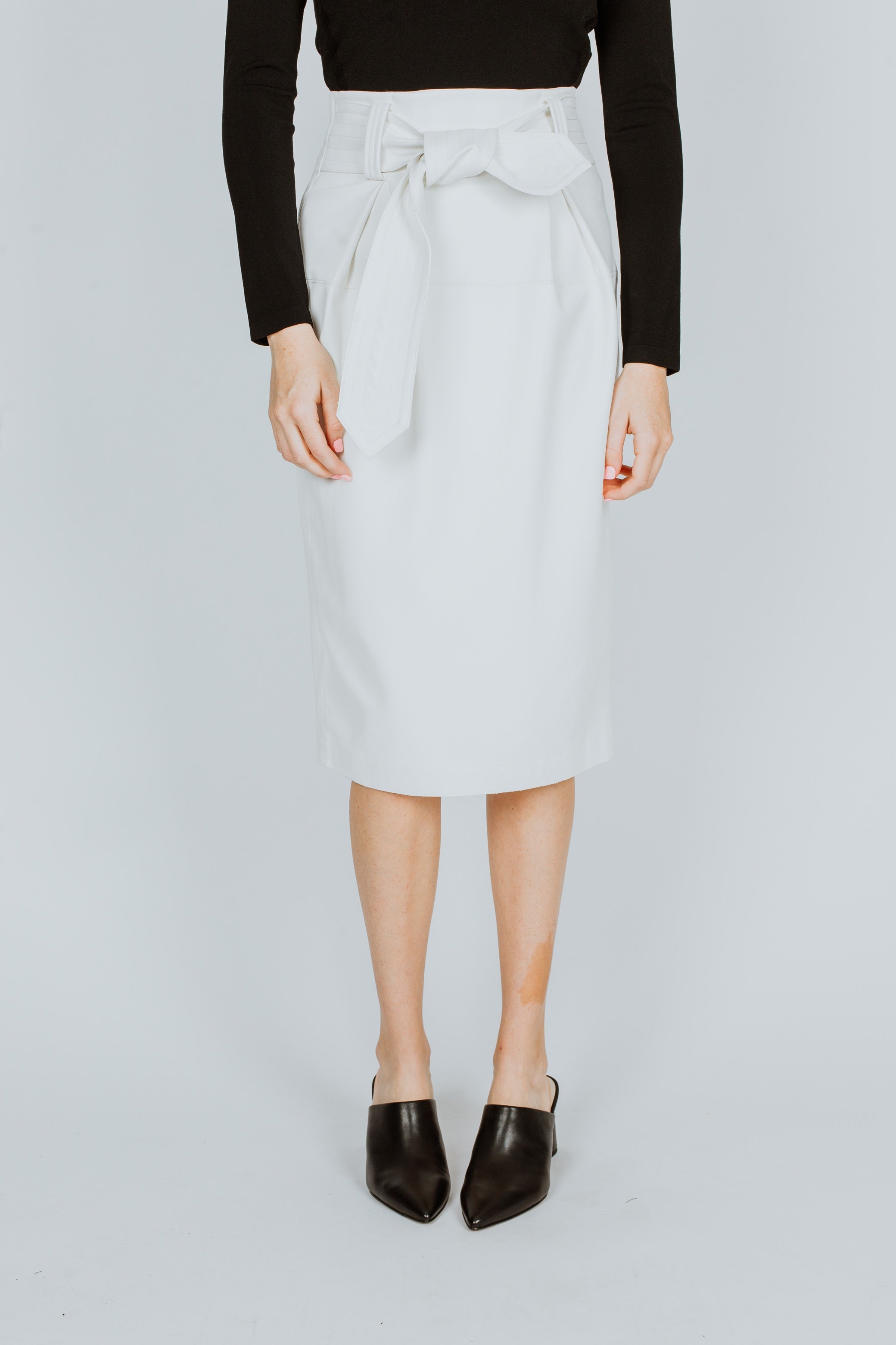 This skirt is perfect for dressing up or down, featuring a high-waisted, midi-length skirt with a connected self-tie belt. Â