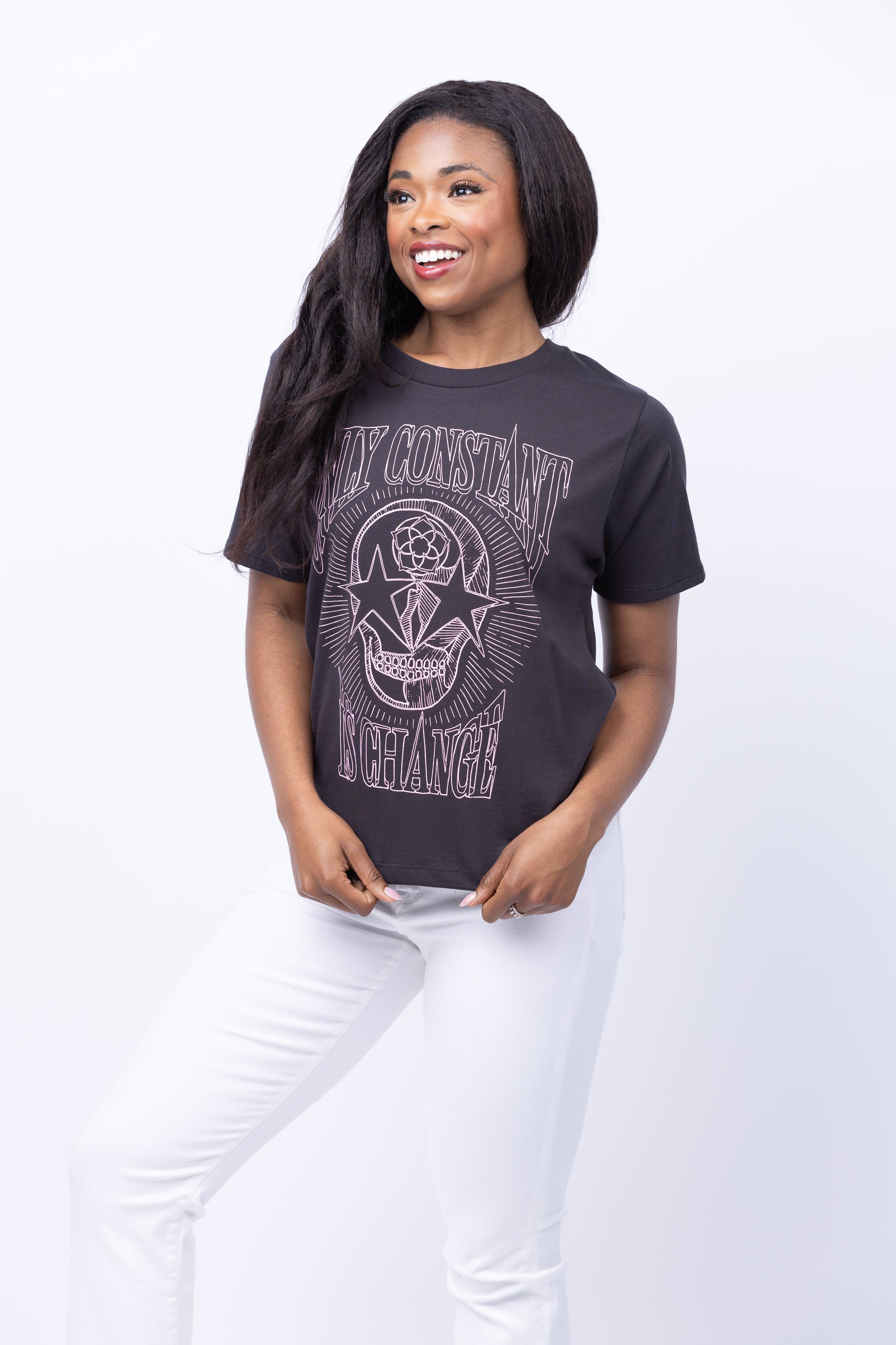 Discover the comfort and style of CHRLDR's Only Constant is Change t-shirt. With a casual graphic design, this tee is perfect for pairing with denim shorts or jeans and sneakers. Embrace change and make a statement with this bold and versatile piece.