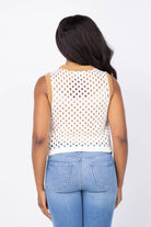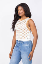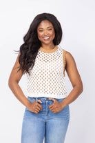 The Cleobella Bronwyn Sweater Top blends artisanal craftsmanship with breathable comfort, hand-crocheted from 100% cotton yarn. Its open-knit design, accented by rich brown rib detailing at the armholes and neckline, adds sophisticated texture to any outfit. This versatile piece is perfect for layering or wearing alone, making it a sustainable and stylish addition to your wardrobe.