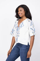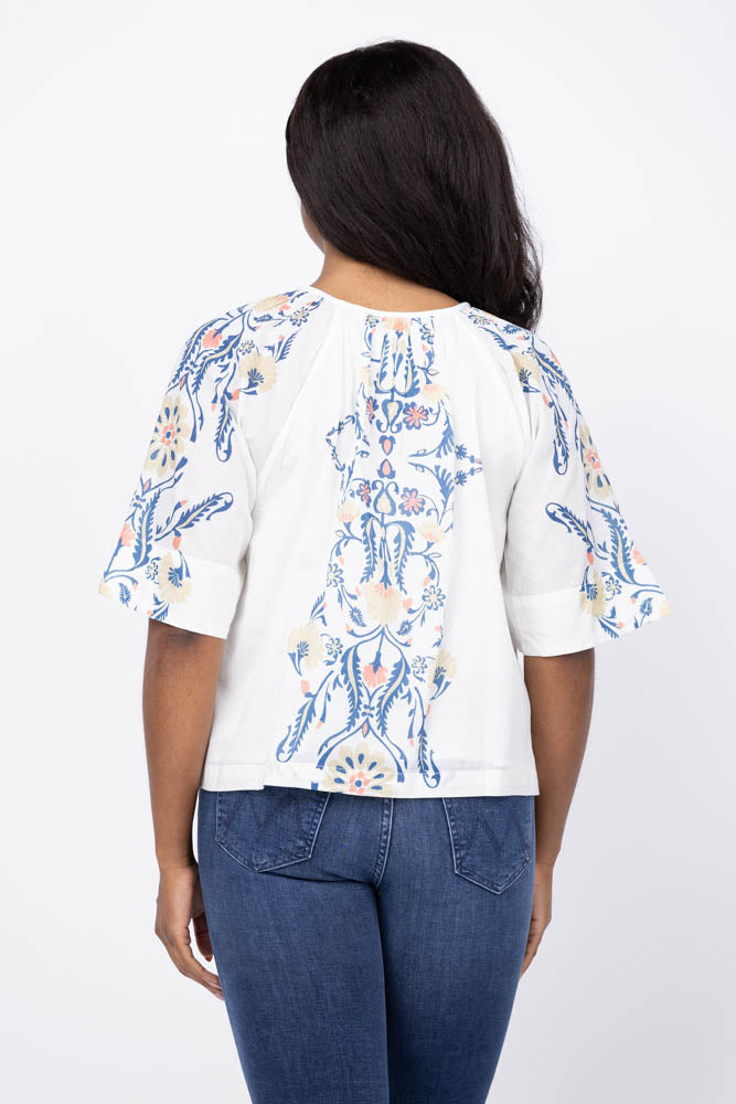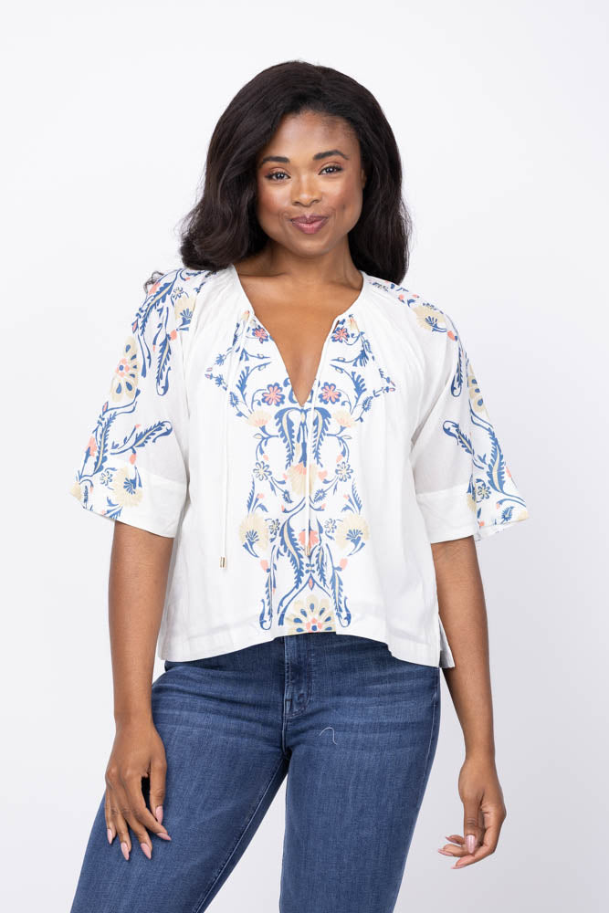 The Cleobella Jocelyn Blouse in Monaco Print features a flattering v-neck design, making it an elegant choice for any wardrobe. Its lightweight fabric and versatile style make it perfect as a transitional piece, easily pairing with layers for cooler days or worn alone when the weather warms. Elevate your everyday look with this effortlessly chic blouse.
