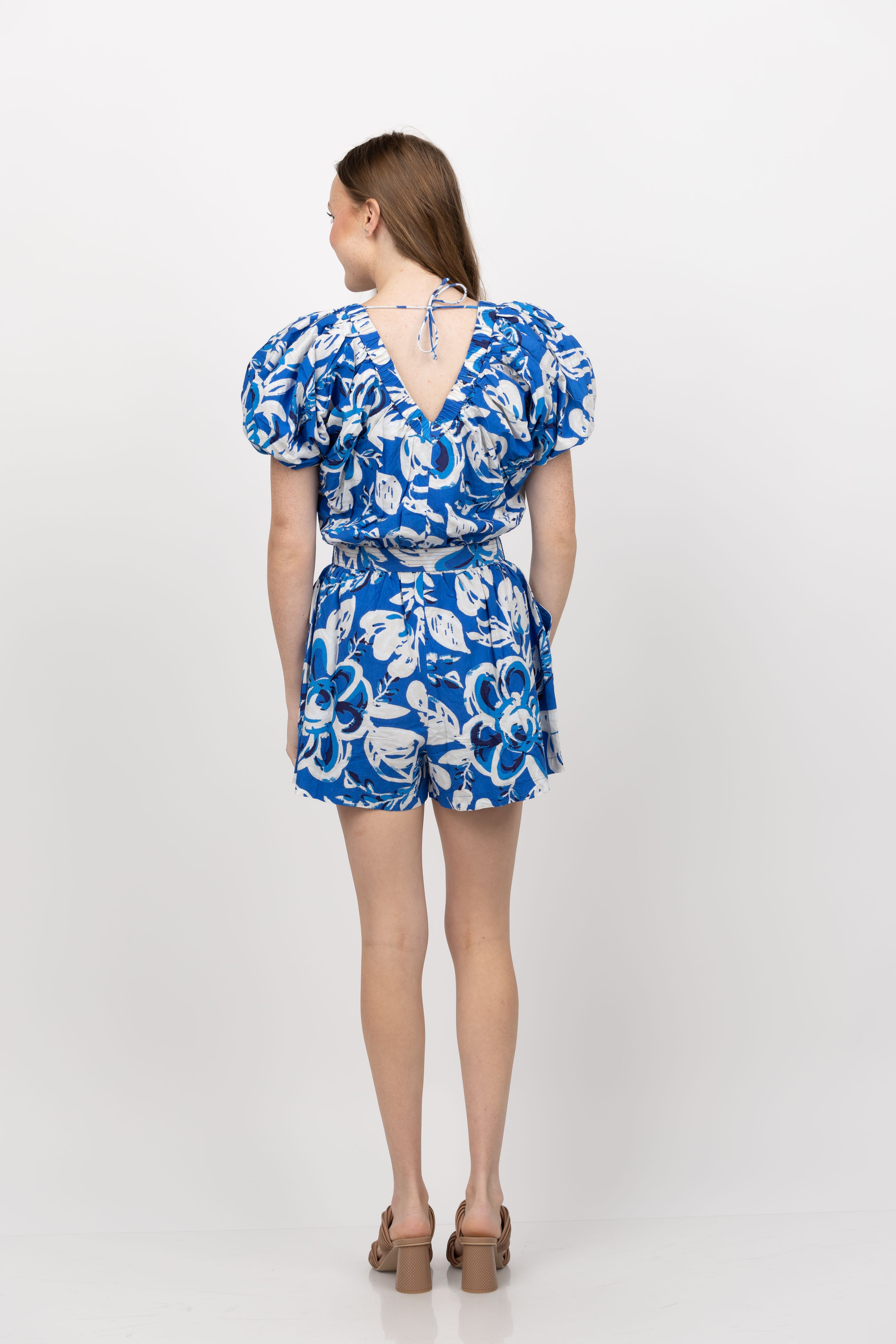 Upgrade your summer wardrobe with the Cleobella Thalia Romper! Its short puff sleeves and belted waist create a flattering silhouette, while the blue abstract floral print adds a touch of whimsy. The V neckline with a tie back adds a playful touch. Perfect for picnics, vacations, and beyond!