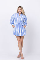 The Cleobella Tiana Mini Dress in Vecchio Stripe Print Blue is ethically handmade from a breathable 70% cotton and 30% linen blend. Featuring a button-down design with a hidden placket, pockets, and a collared shirt dress silhouette, it offers both style and practicality. The removable o-ring waist belt adds versatile shaping options. Pair with nude sandals for a polished, effortless look perfect for any occasion.