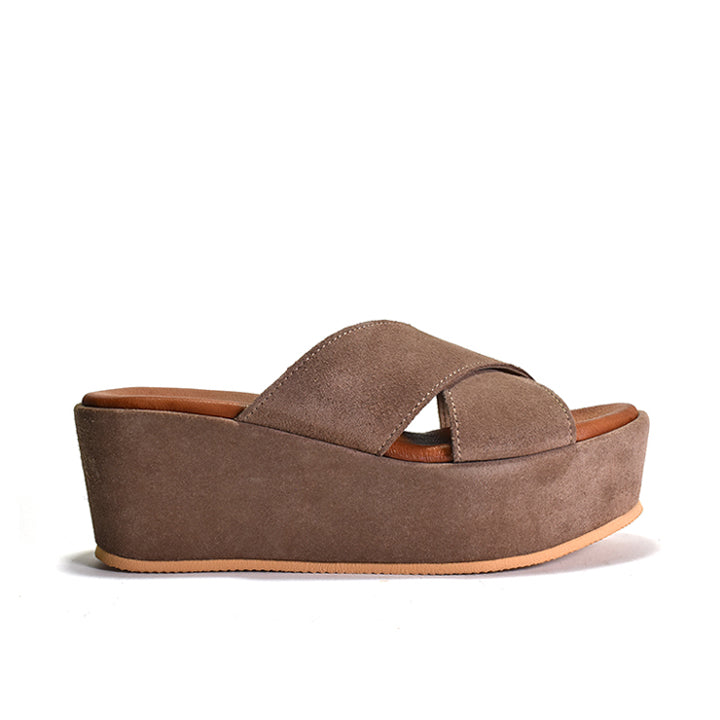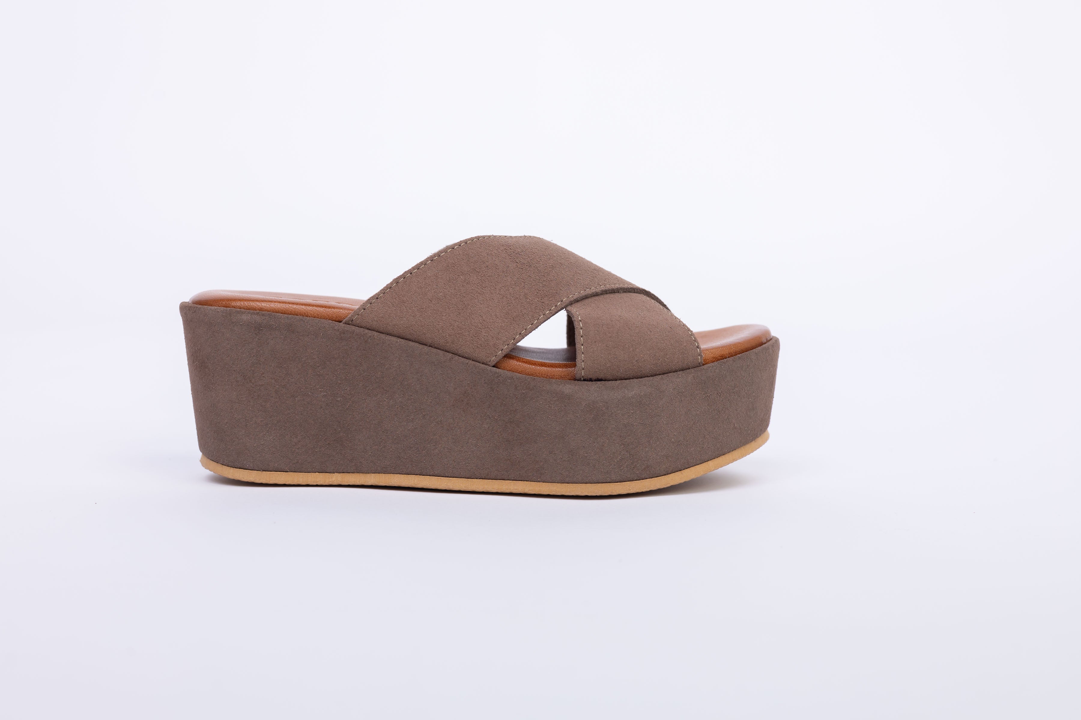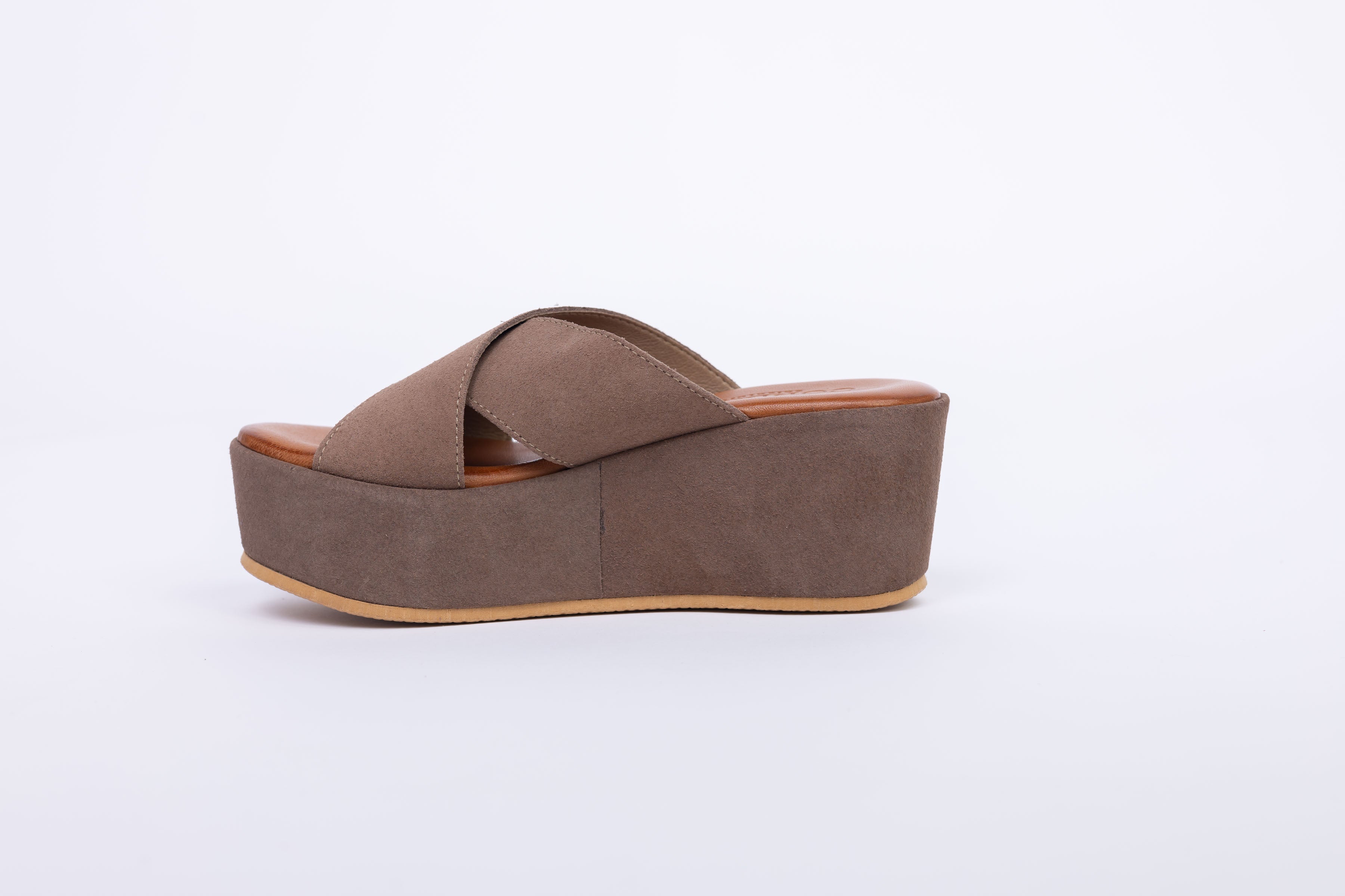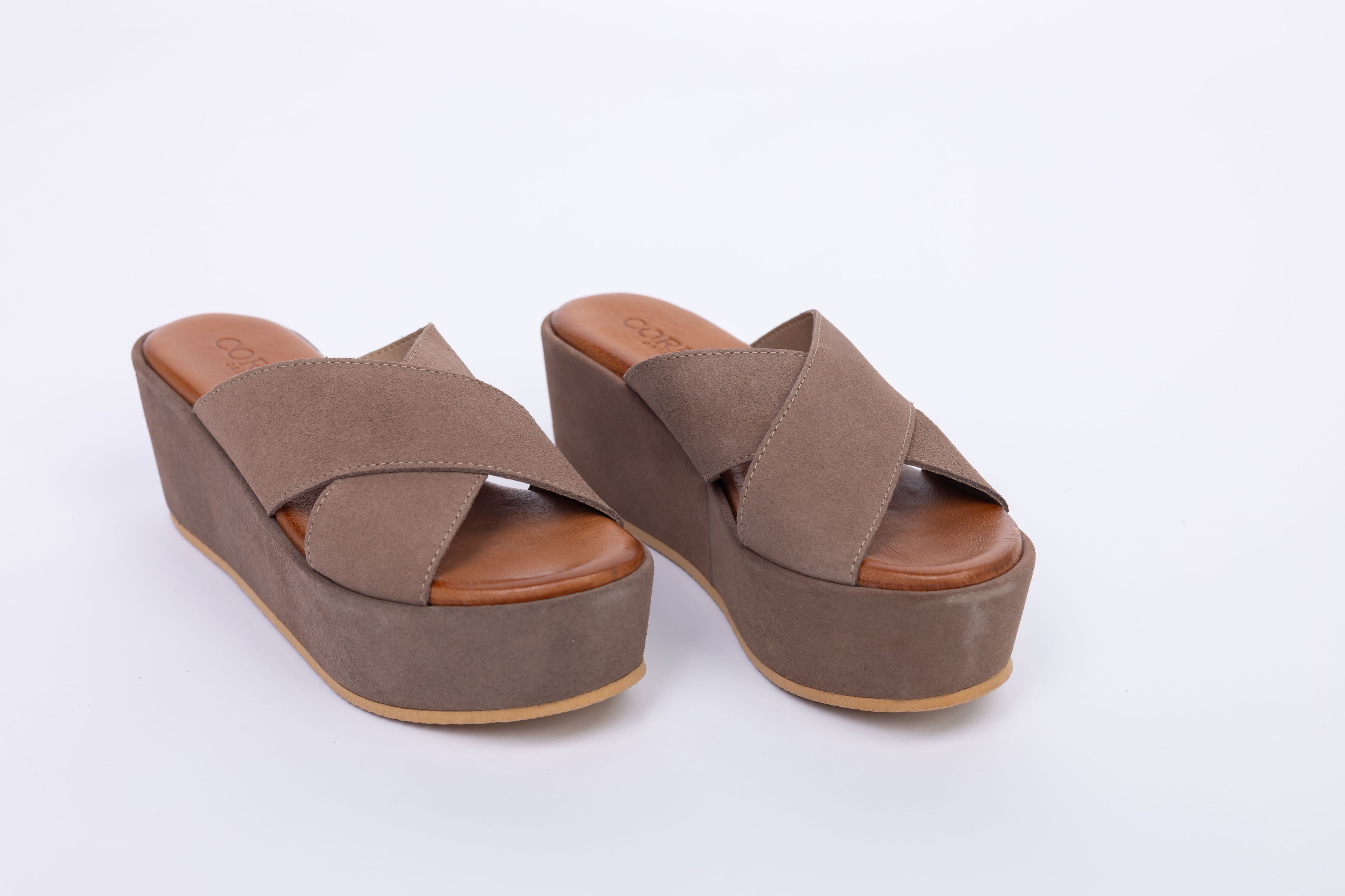 Experience the ultimate comfort and style with the Cordani Bella Sandal in Taupe. The criss-crossing suede straps provide a snug fit, while the luxurious suede wrapped platform adds a touch of elegance. With its oh-so-cushy insole padding and leather lining, your feet will be pampered all day long. Made in Spain.