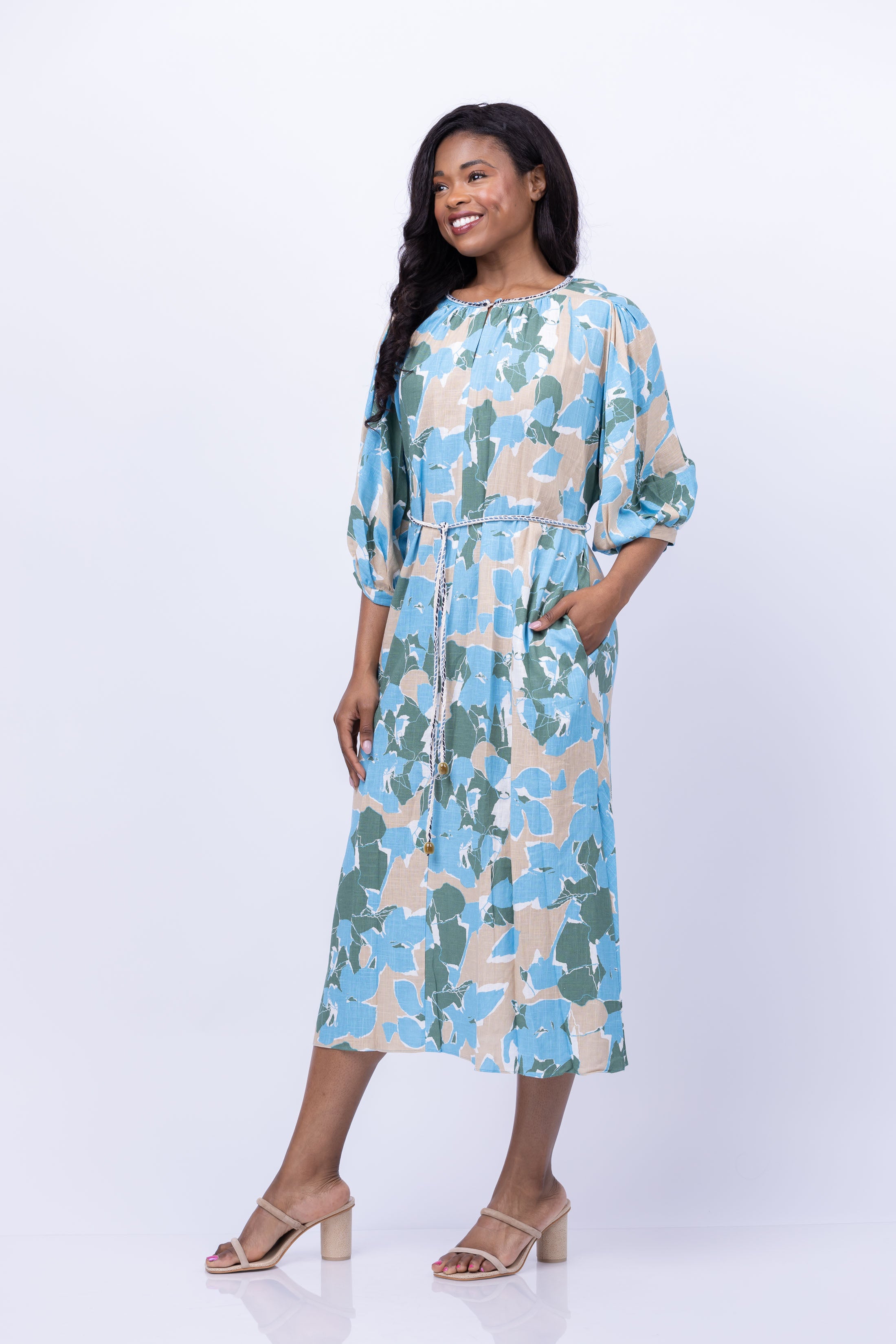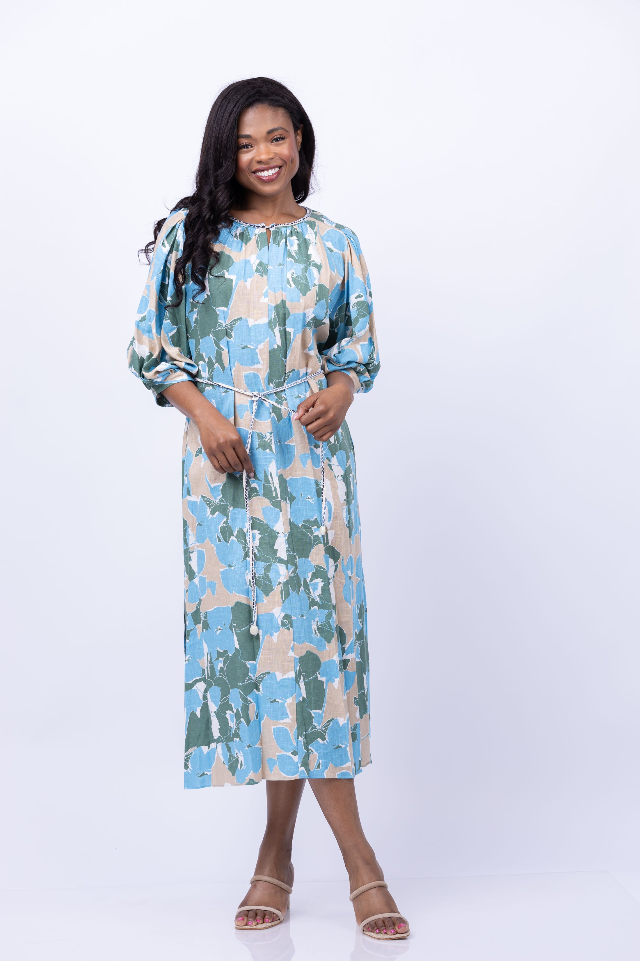 Elevate your wardrobe with the DVF Bambi Dress in Earth Floral. This stunning dress features a front keyhole with a button-and-loop closure, jewel neck, and three-quarter sleeves. The tie belt cinches at the waist, while the side slit adds a touch of flirtiness. The abstract floral print adds a modern and chic touch, making this dress a must-have for any fashion lover.