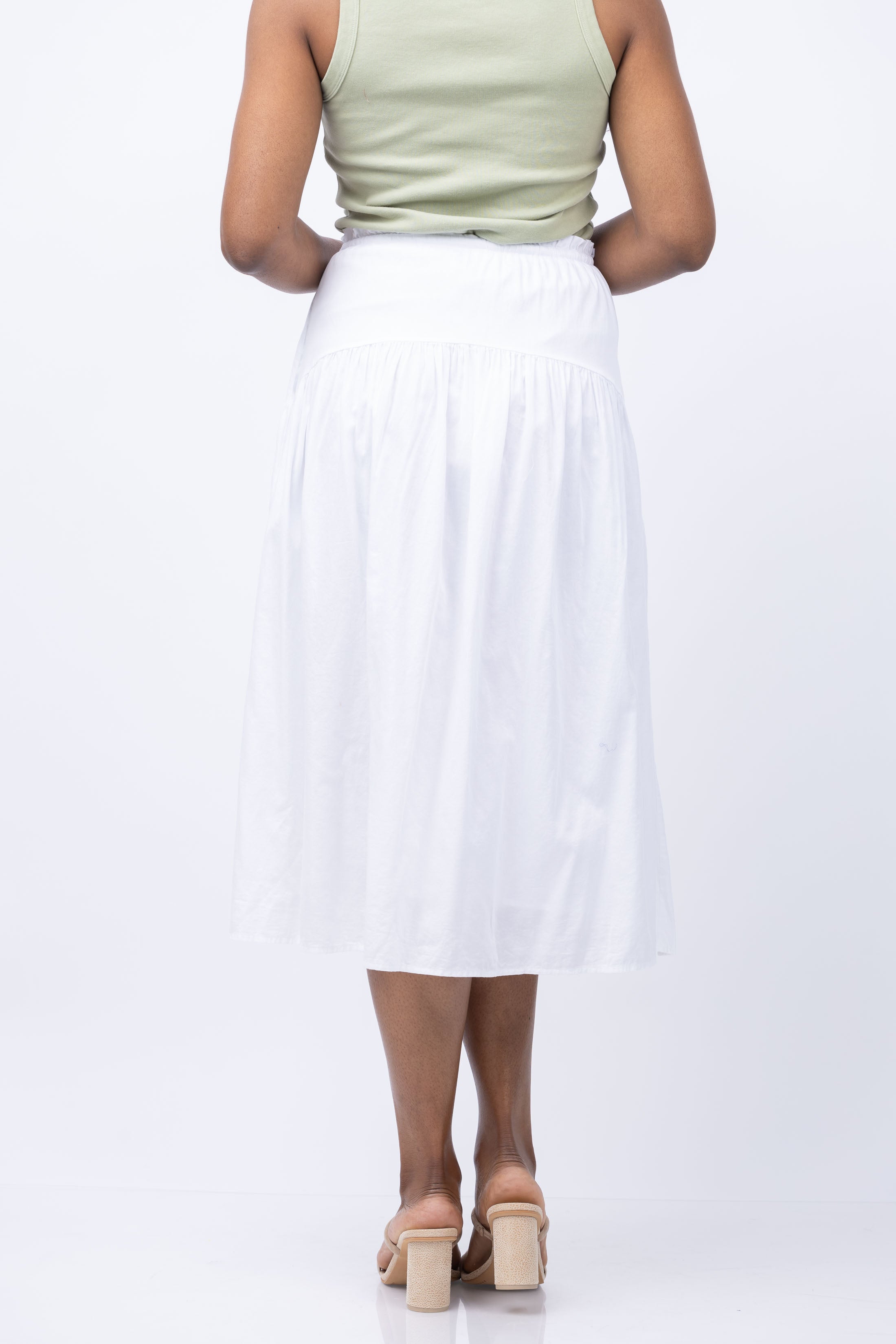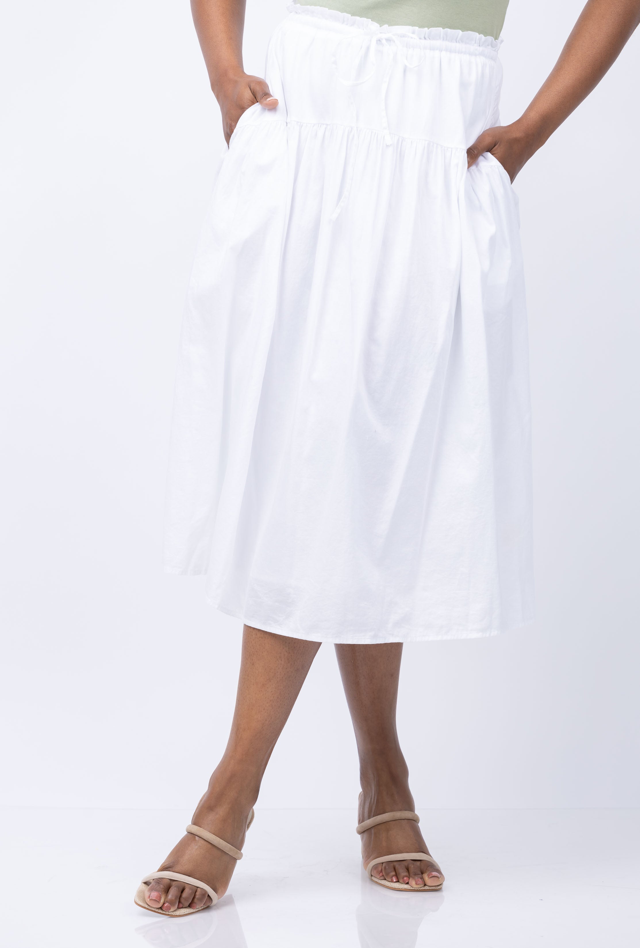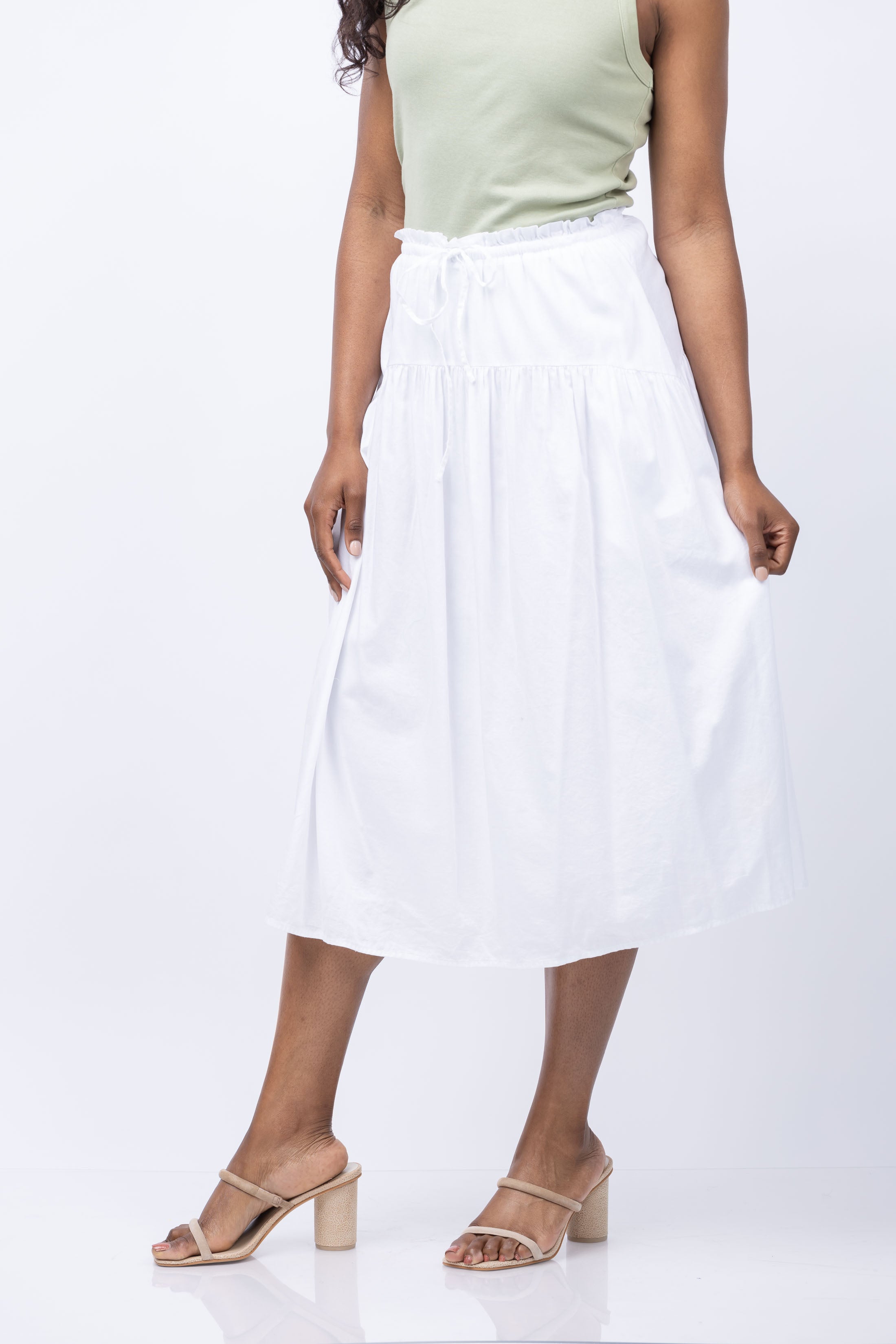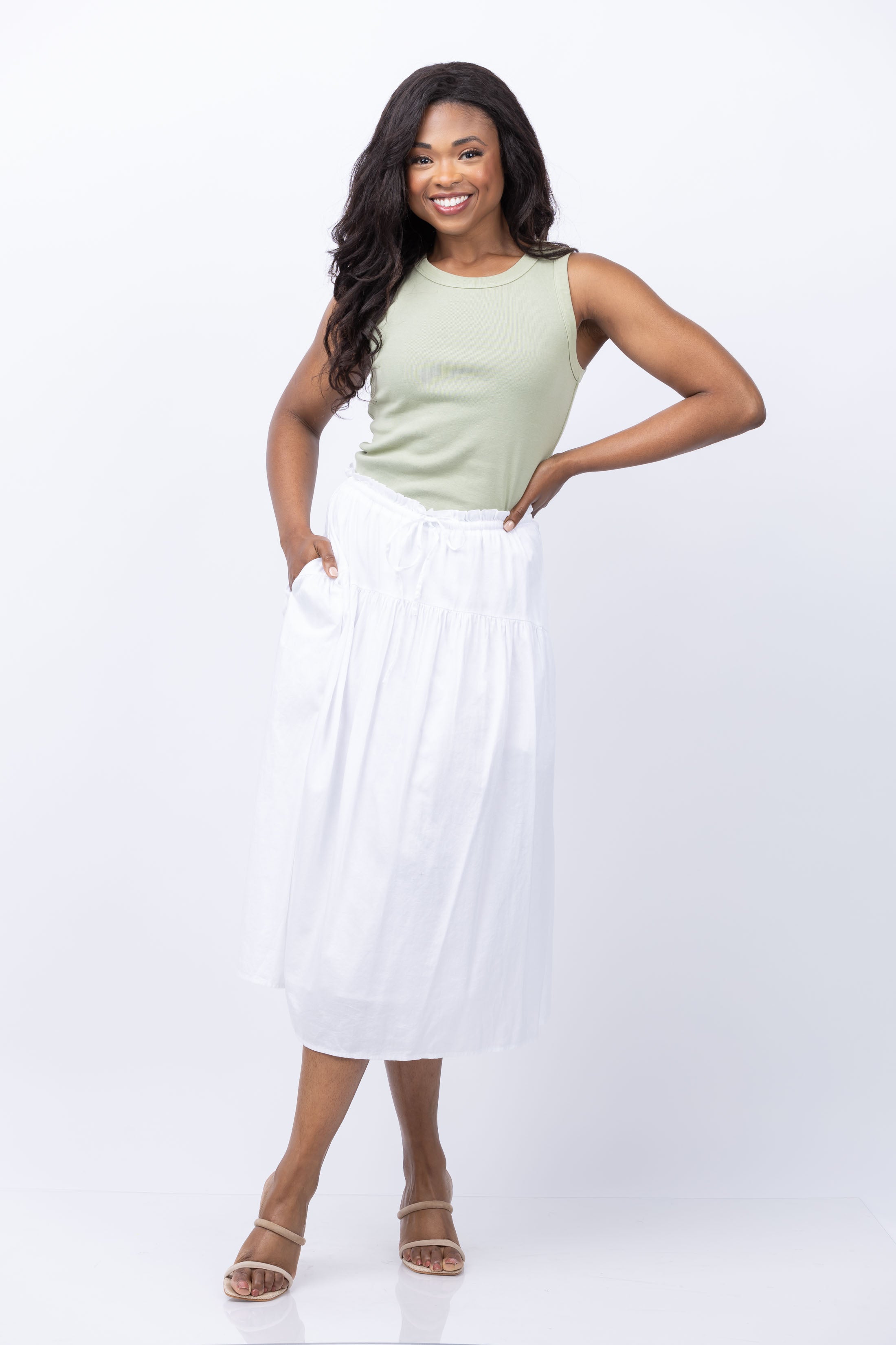 Elevate your summer style with the Dylan James Skirt in versatile white. Its midi length, drawstring waist, and lightweight lining make it perfect for warm weather wear. Pair with a tank top and sandals for a chic and comfortable look.