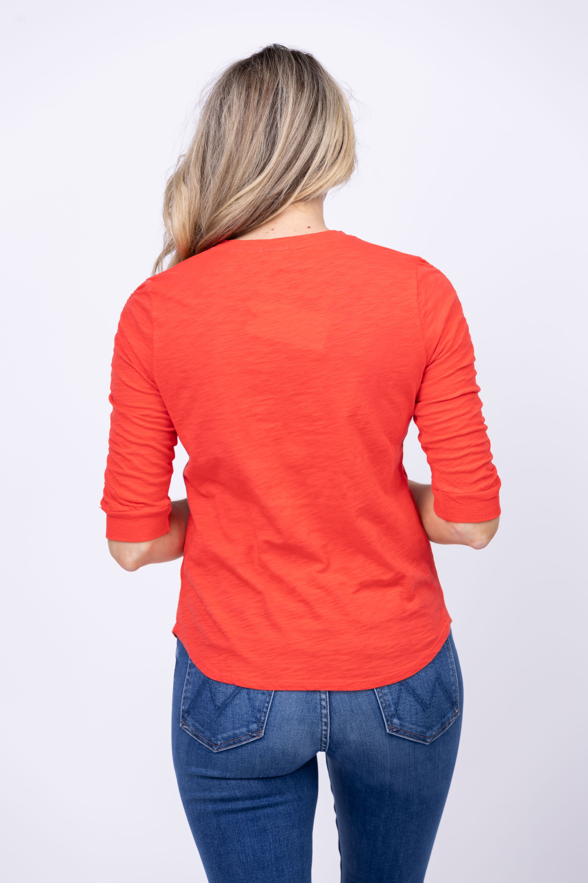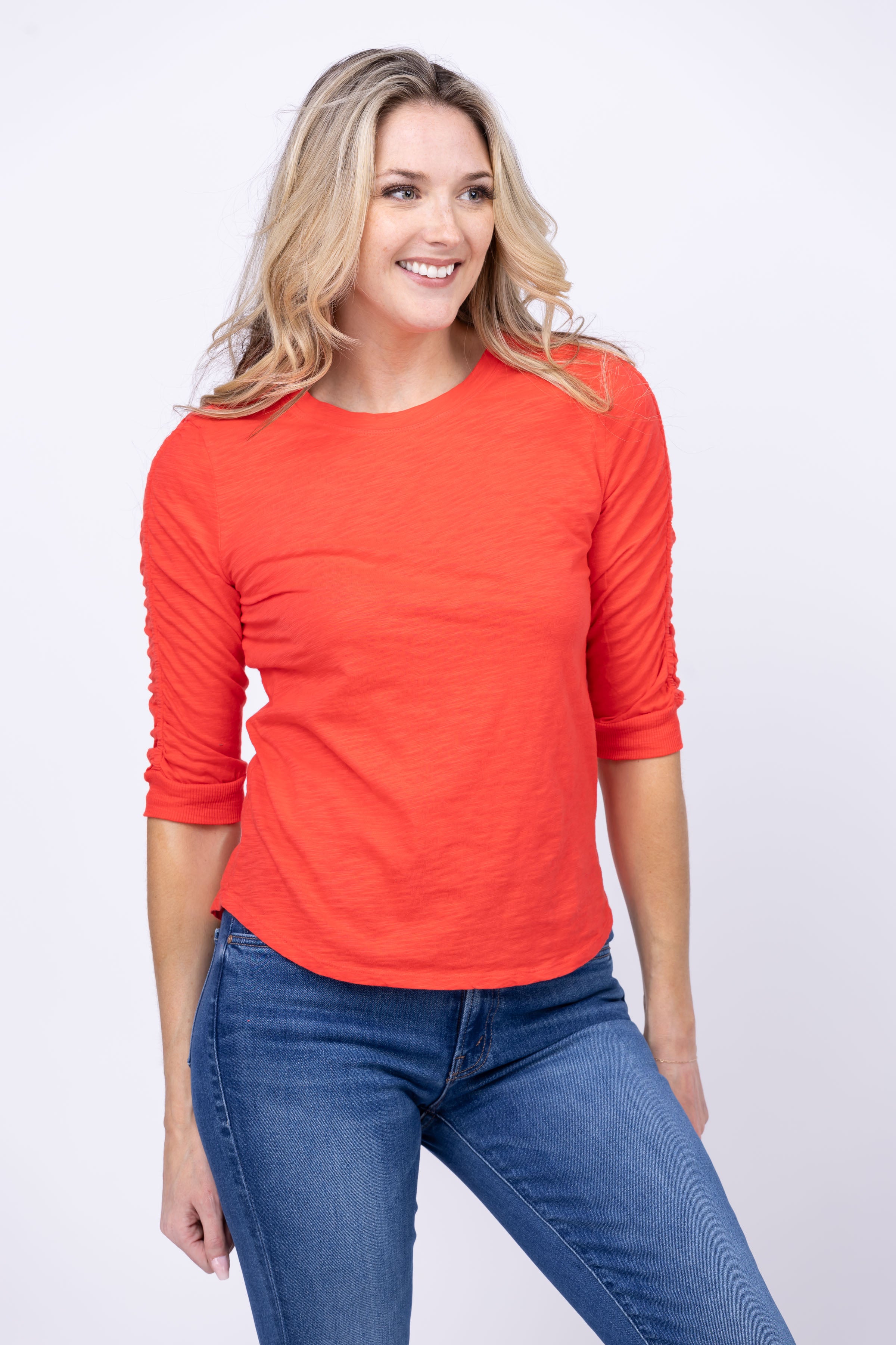 Introducing the Dylan Julia Knit in Poppy Red! Enhance your wardrobe with this easy tee featuring cinched and elbow length sleeves for a modern twist. The crewneck adds a touch of elegance, making it perfect for any occasion. Upgrade your style and feel confident in this must-have piece.