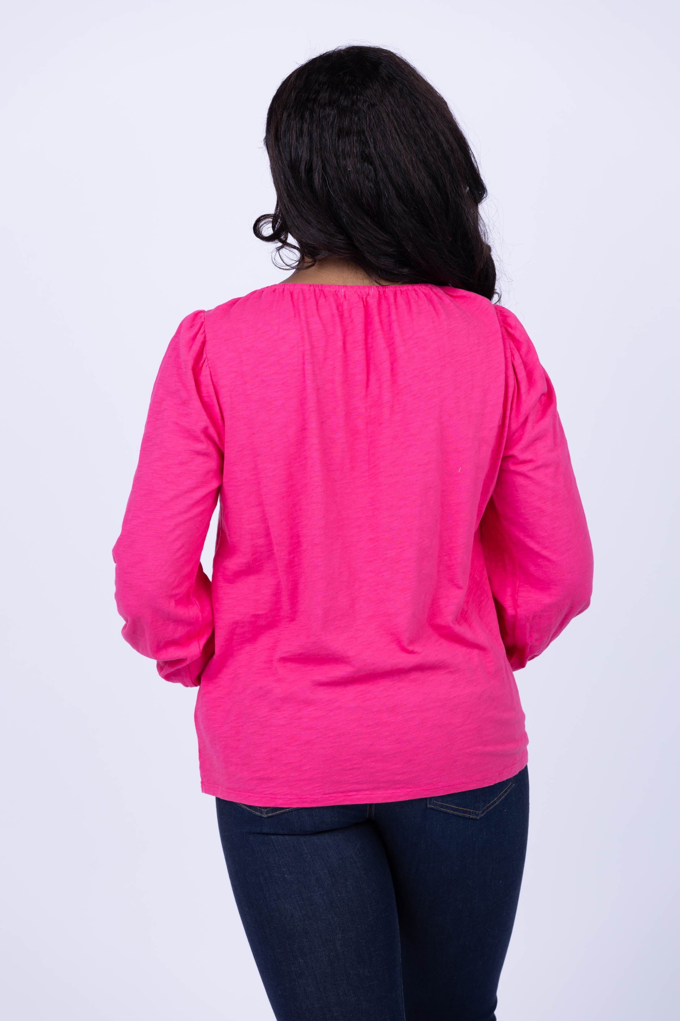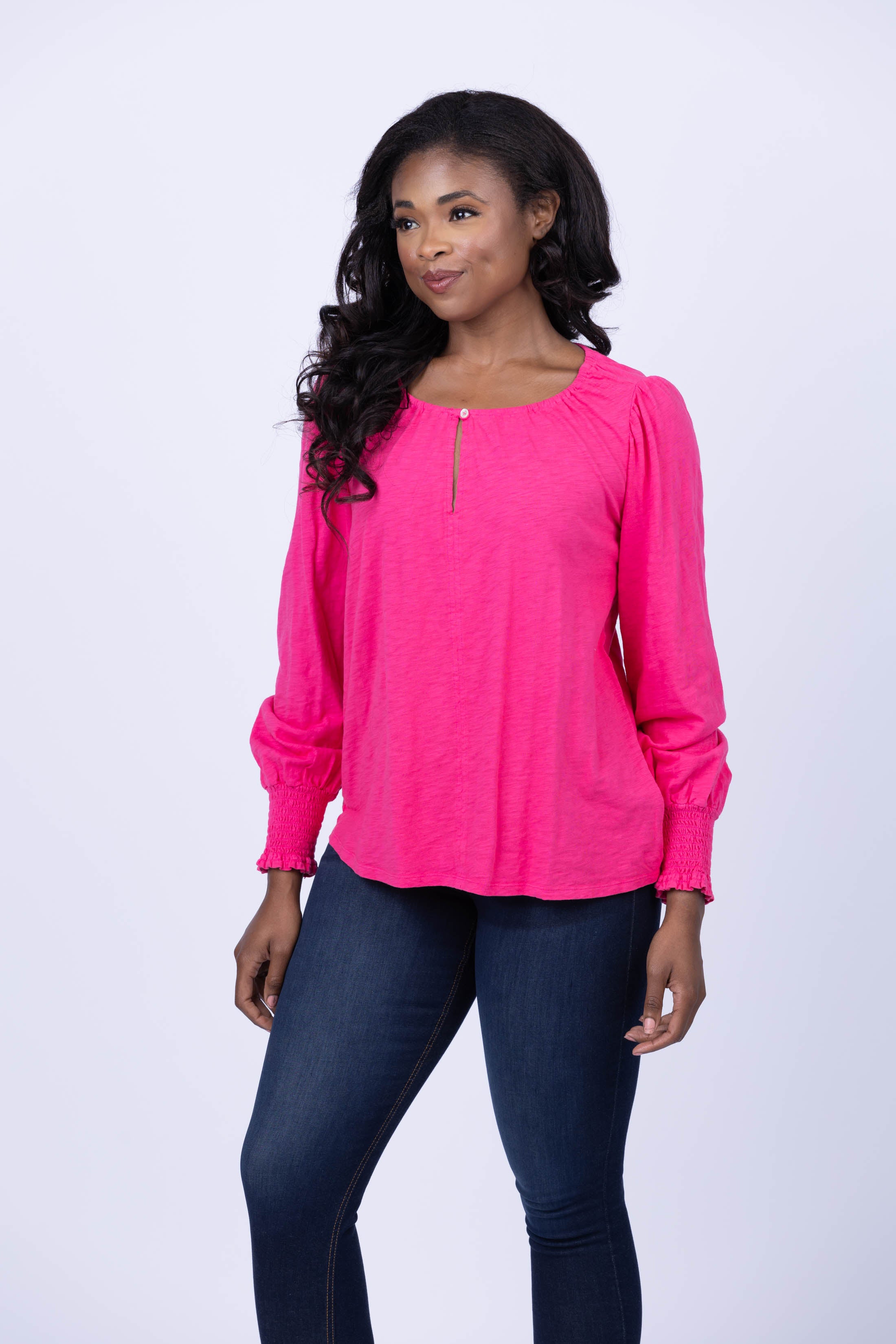 A fun pop of pink, this Dylan L/S Smock Sleeve Blouse in Fuchsia is the easy tshirt your wardrobe needs! Easily dress it up with gold jewelry and a fun sneaker for a vibrant outfit. Ready to make an impression? Get it now!