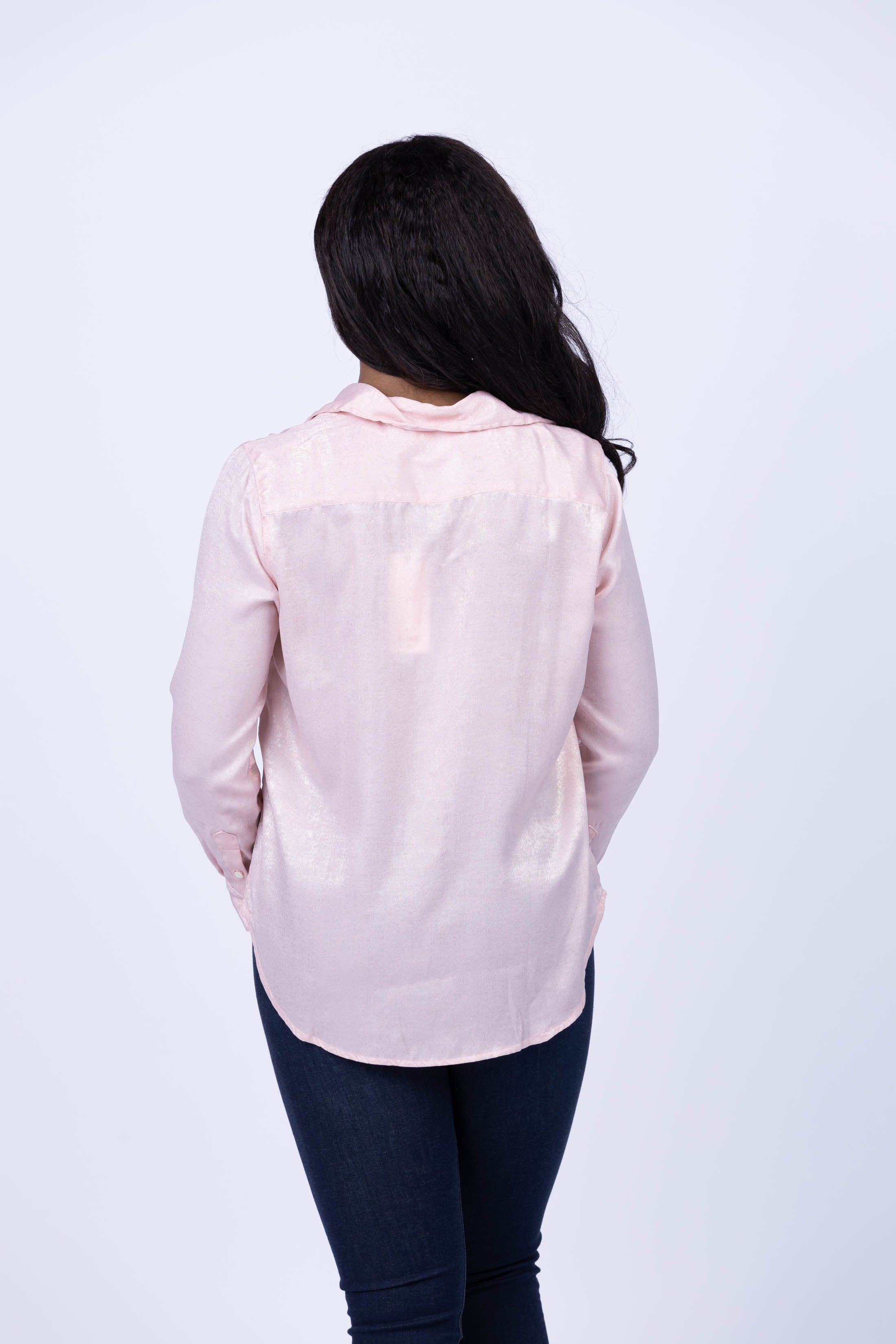 Look polished and professional in our Dylan Siena shirt. Made of 100% polyester, the shimmer material in light pink and gold provides a subtle, feminine touch that pairs perfectly with smart pants or a skirt for the office. The long sleeves, button placket, and open front chest pocket combine for a fitted, tailored look that exudes confidence. So why wait? Show off your style today!