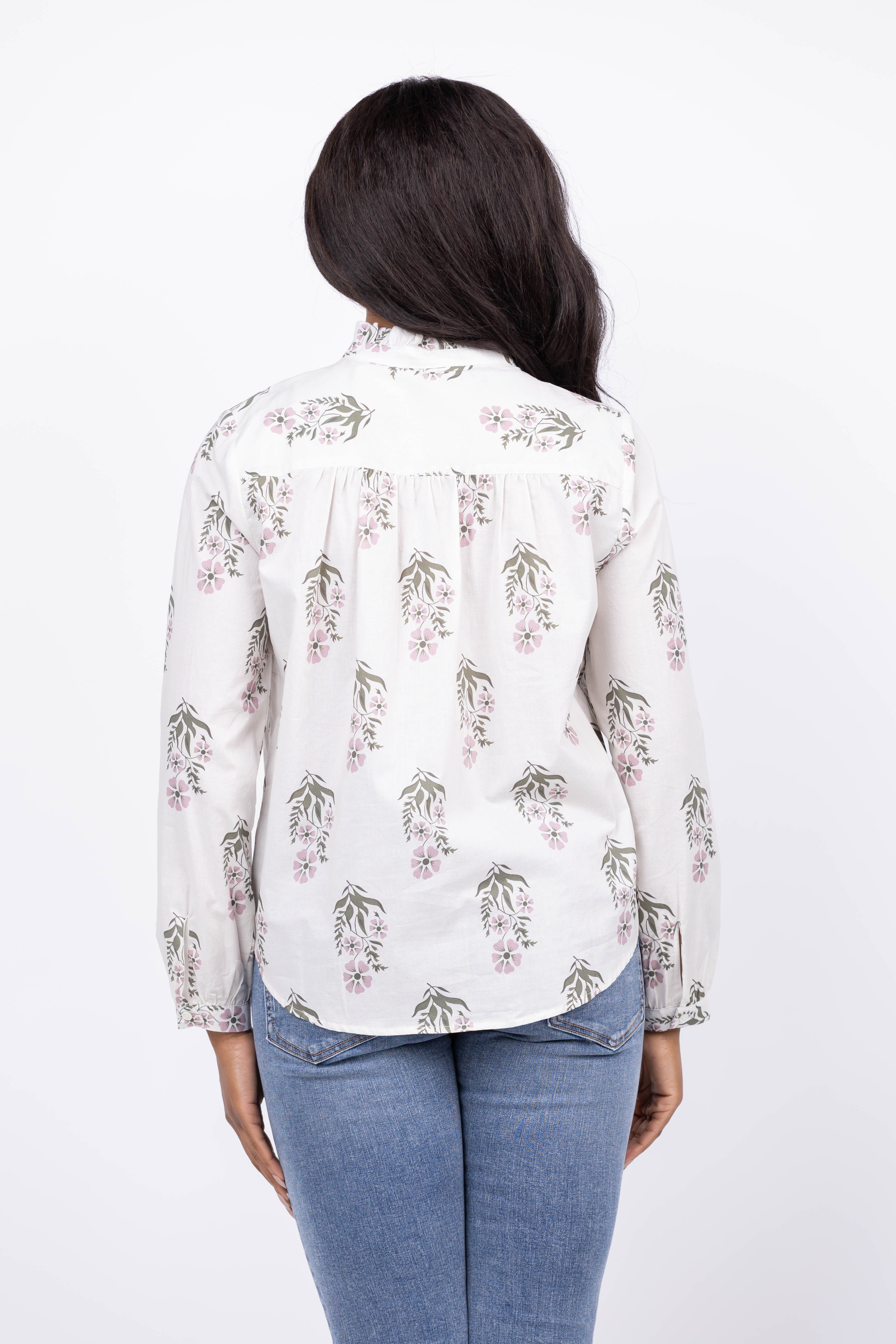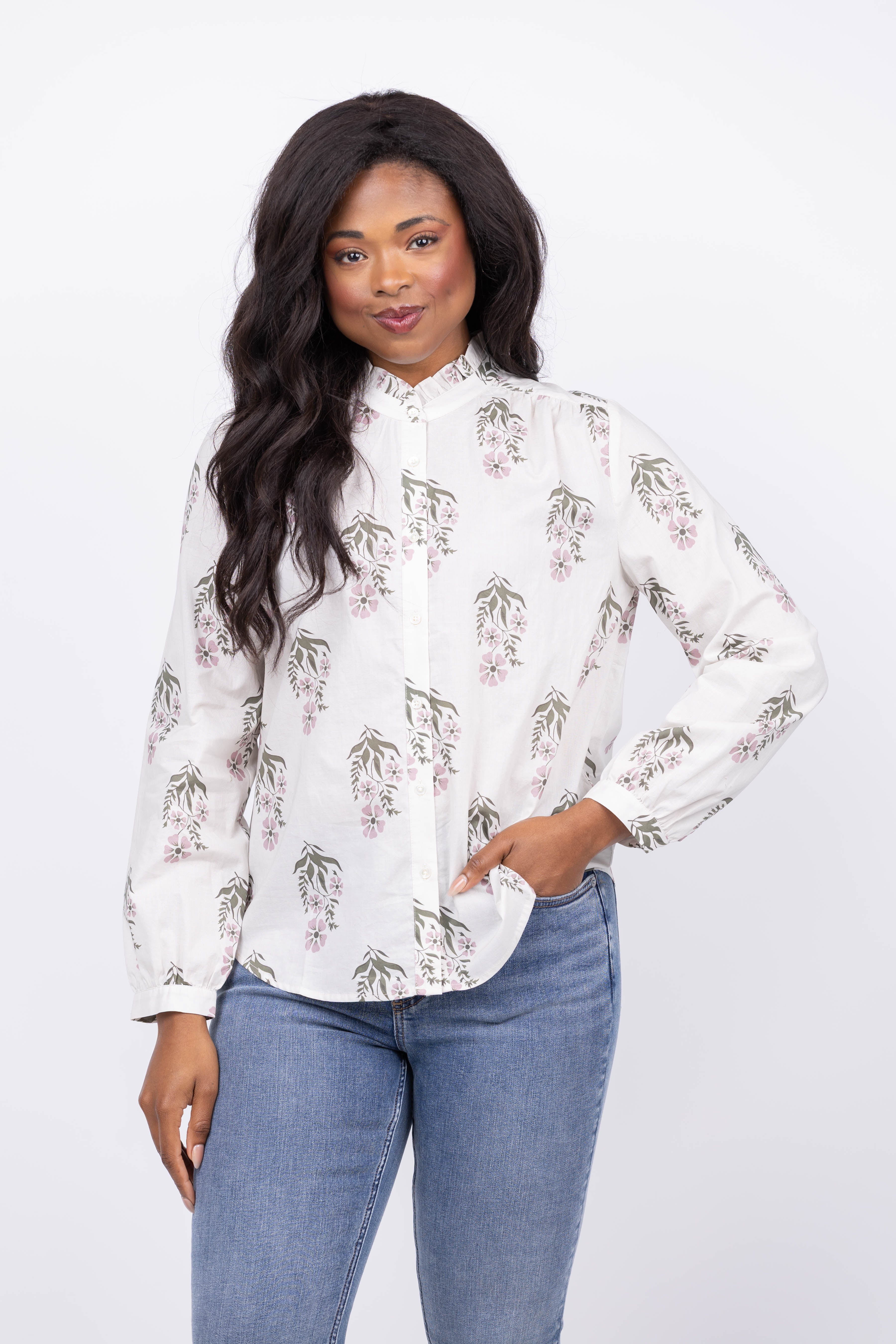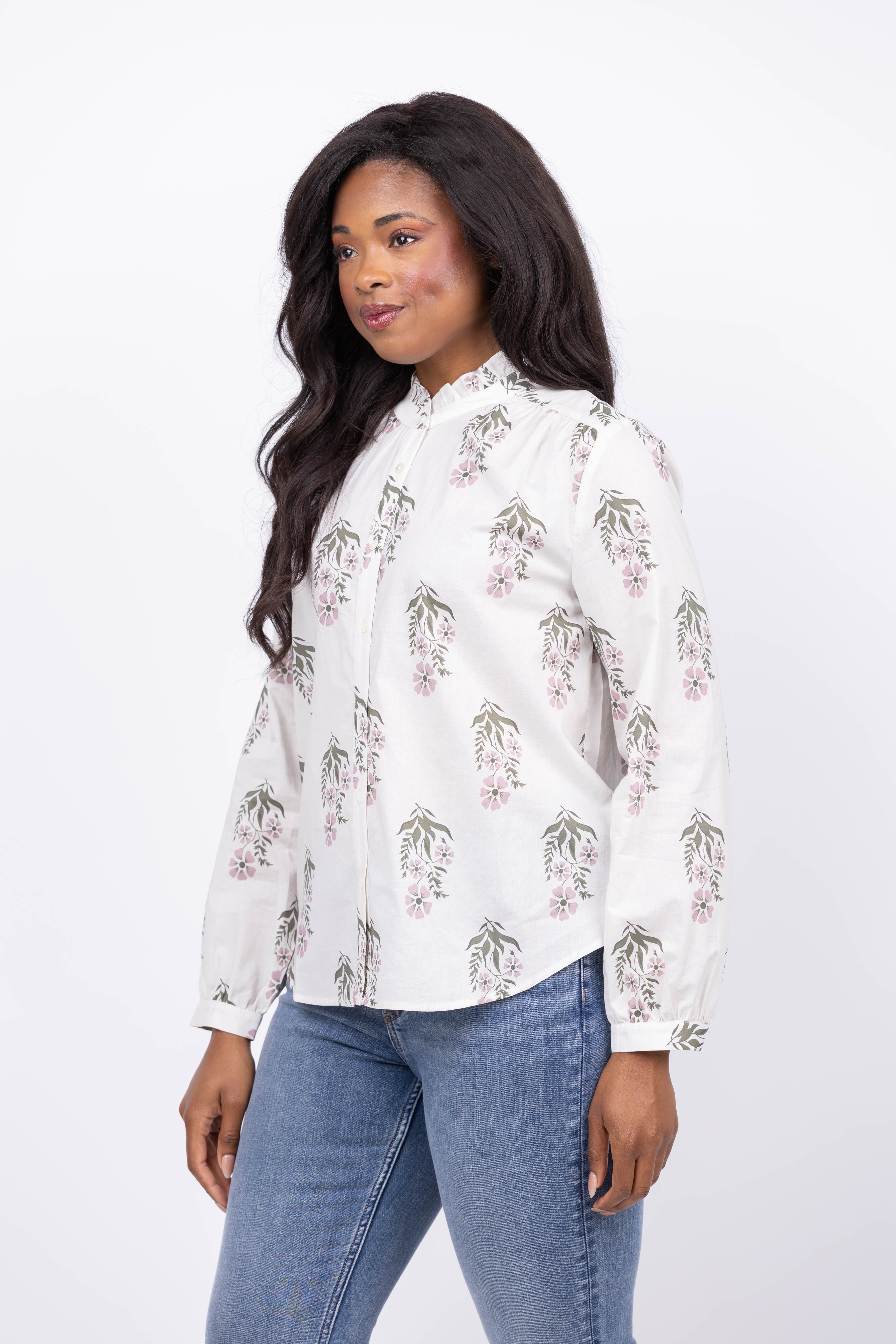 The Dylan Sophia Floral Shirt in Natural features a classic button-up design paired with an elegant block print pattern. Its natural tones create a timeless look that effortlessly complements any outfit. Perfect for adding a touch of refined charm to your wardrobe, this shirt offers both comfort and distinctive style for everyday wear or special occasions.