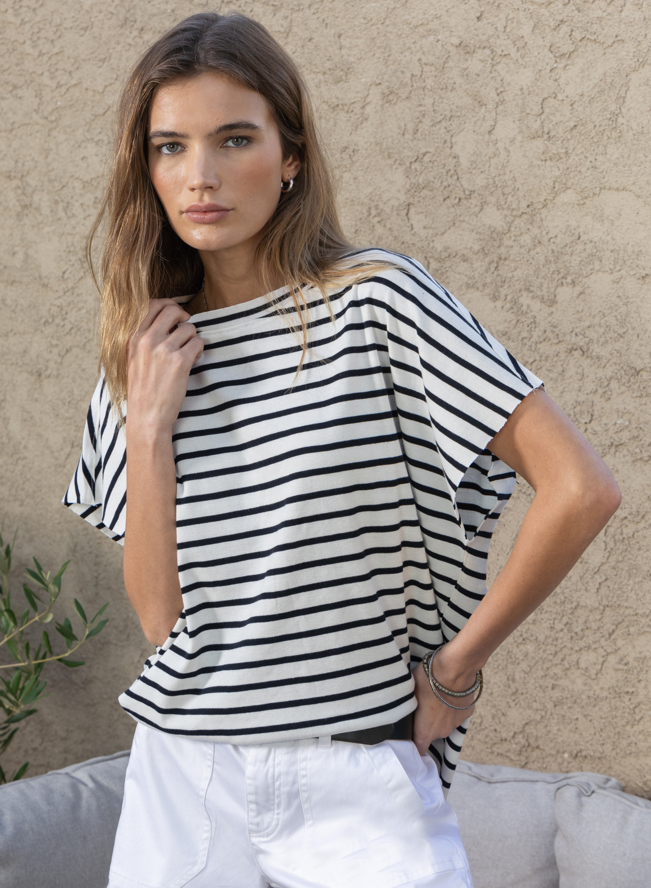 The Dylan Spring Stripe Caplet Top in Black/White features a relaxed fit and a stylish raw edge hem, offering effortless comfort and a modern look. Perfectly paired with white linen shorts, this top creates a fresh, breezy outfit ideal for warm days and casual outings. Elevate your spring wardrobe with this versatile and chic piece.