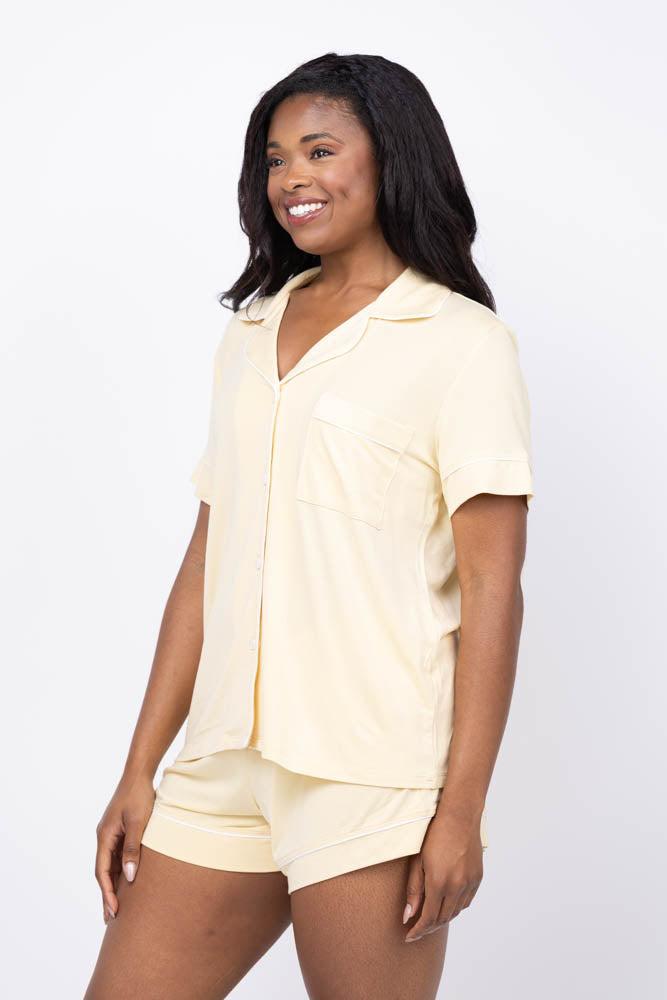 Experience ultimate comfort with the Eberjey Gisele Tencel Modal Relaxed PJ Set in Sunrise/Ivory. Crafted from buttery soft TENCEL™ Modal fibers blended with a touch of elastane, this set offers a relaxed fit with extra coverage for all-day ease. OEKO-TEX® Standard 100 certification ensures safe, non-toxic dyes. The short-sleeve top features a loose silhouette, button front, notch collar, and a functional pocket, perfectly paired with relaxed shorts. Ideal for lounging or gifting, this set pairs beautifully with everyday lingerie for peaceful, blissful nights.