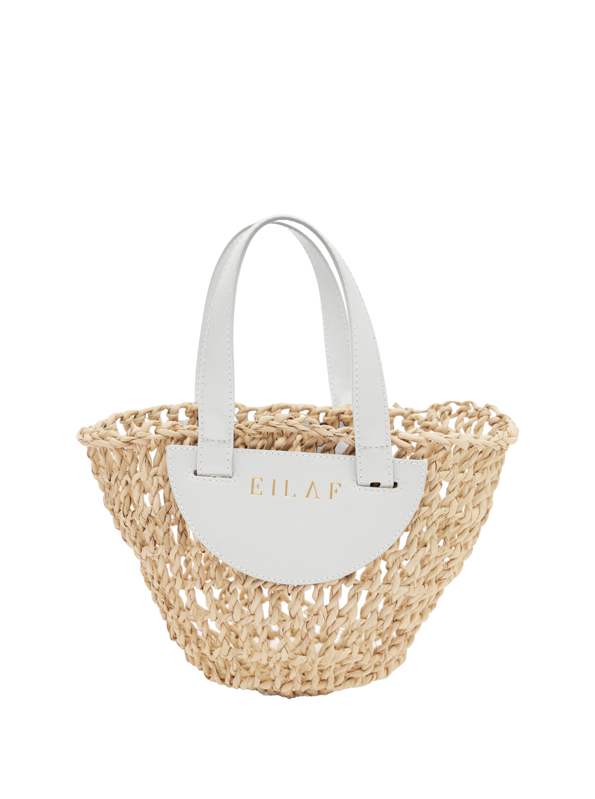 Add a touch of culture to your summer with the Eilaf Dom Mini Bag in Off White. Handwoven with a rare technique from the Brno Tribe in Darfur Sudan, this basket bag is reinforced with Italian leather for durability. Perfect for the beach, city, and market, while preserving a cherished heritage.