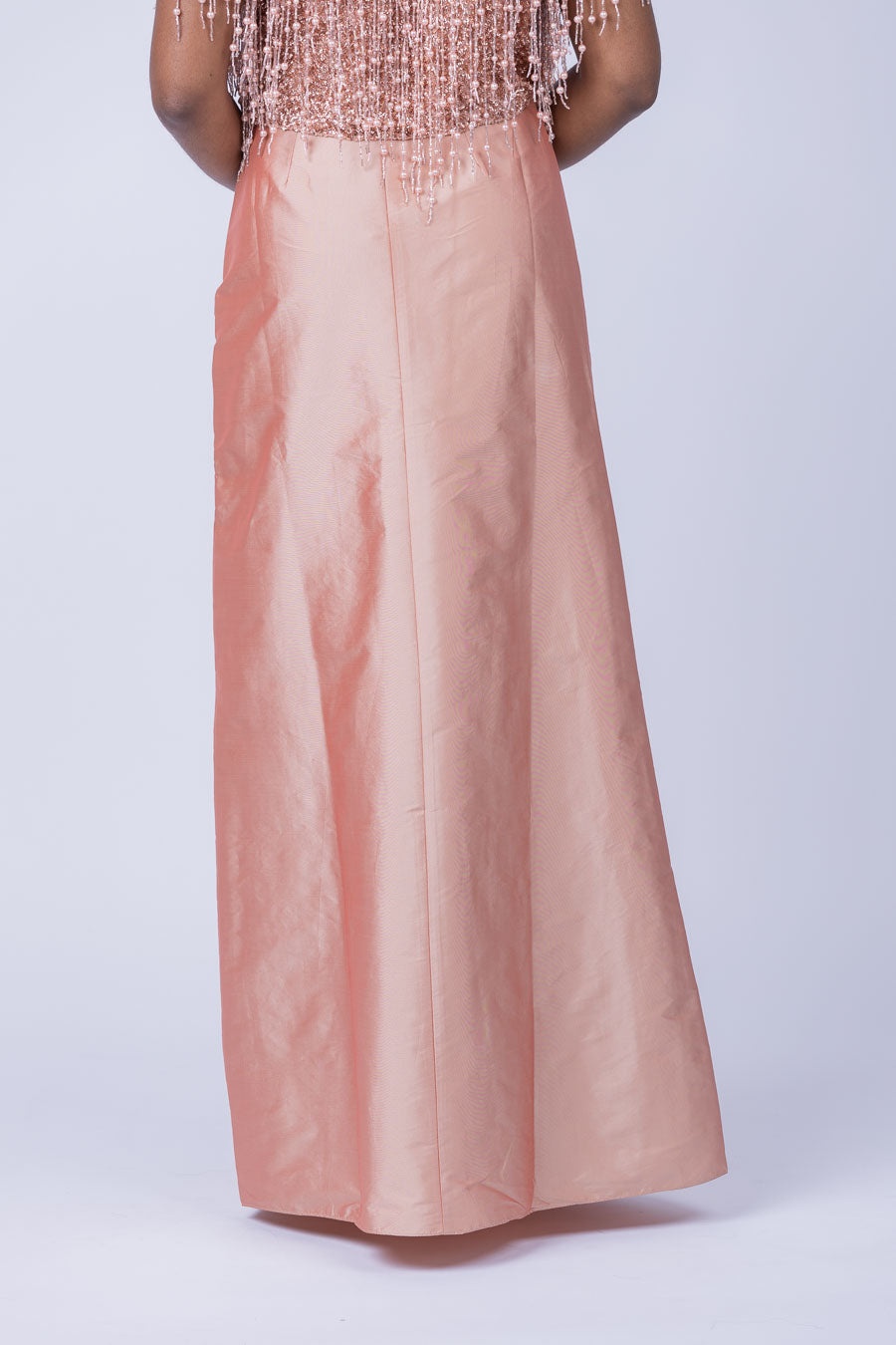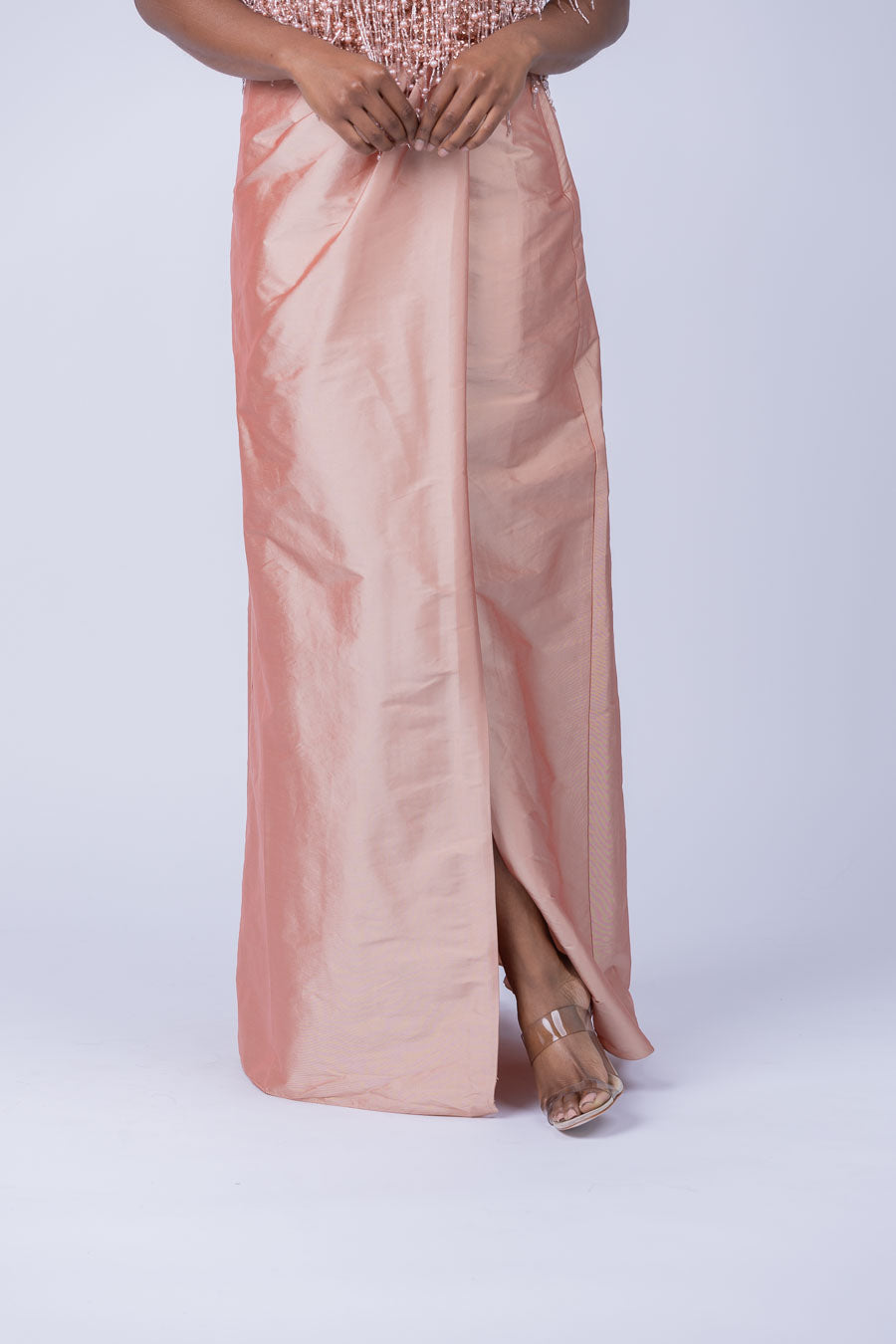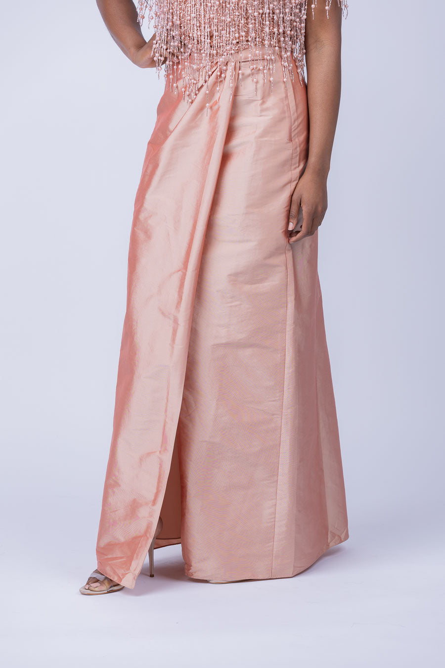 The Emily Shalant Taffeta Slim Wrap Skirt in Apricot is the perfect dress for any evening event. This faux surplice wrap skirt hugs your curves and creates an elegant silhouette. Complete the look with one of our beaded and feathered tops for a statement ensemble. Crafted from premium materials in India. Ready to make a lasting impression?