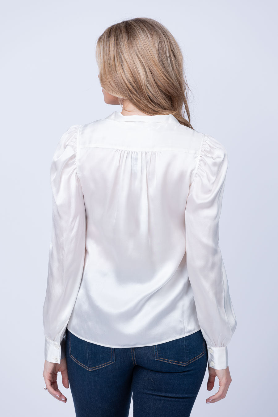 Frame's Gillian top is crafted of luxurious silk and features slightly puffed blouson sleeves. Subtle peated detailing at the shoulders and a concealed button placket complete the look.