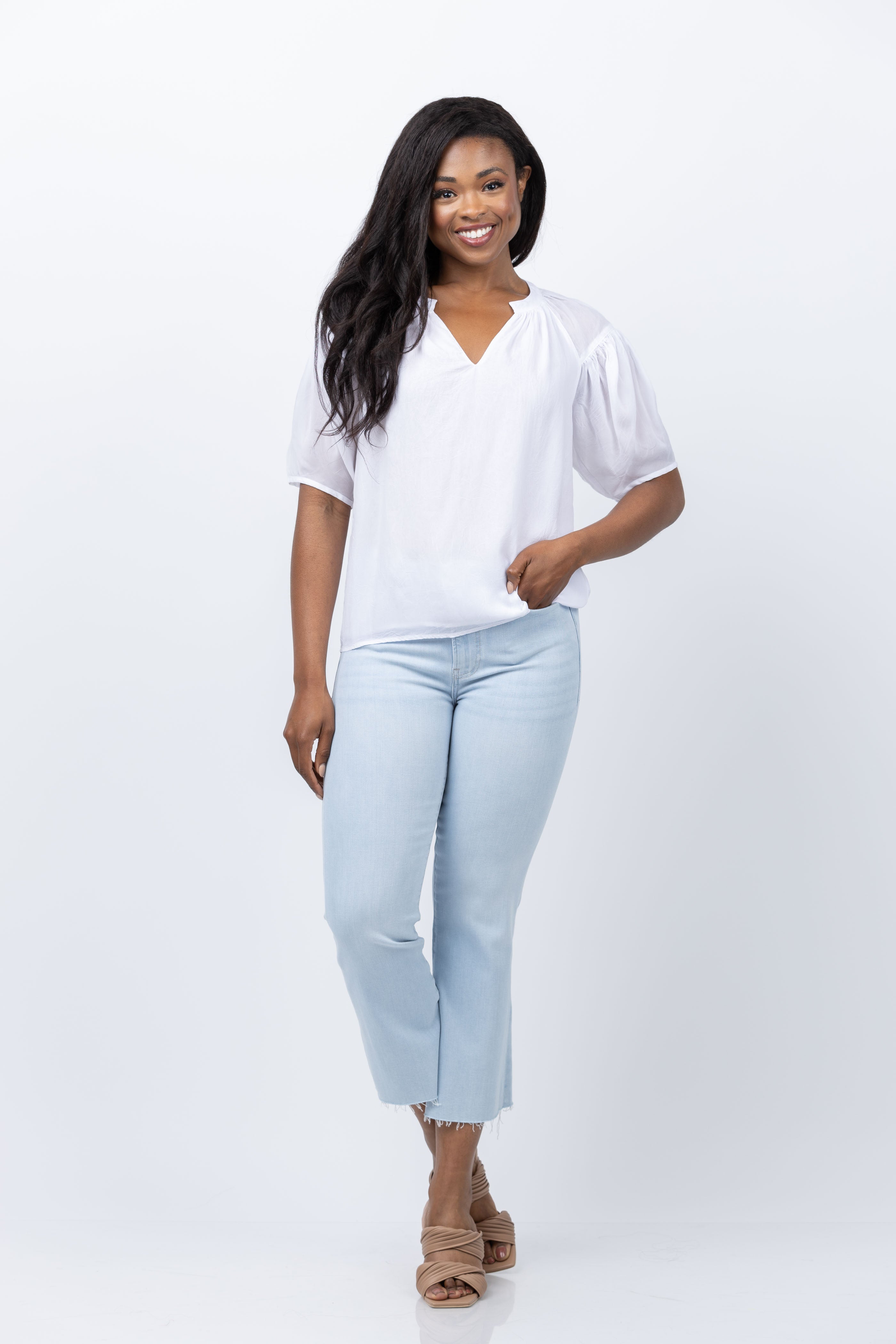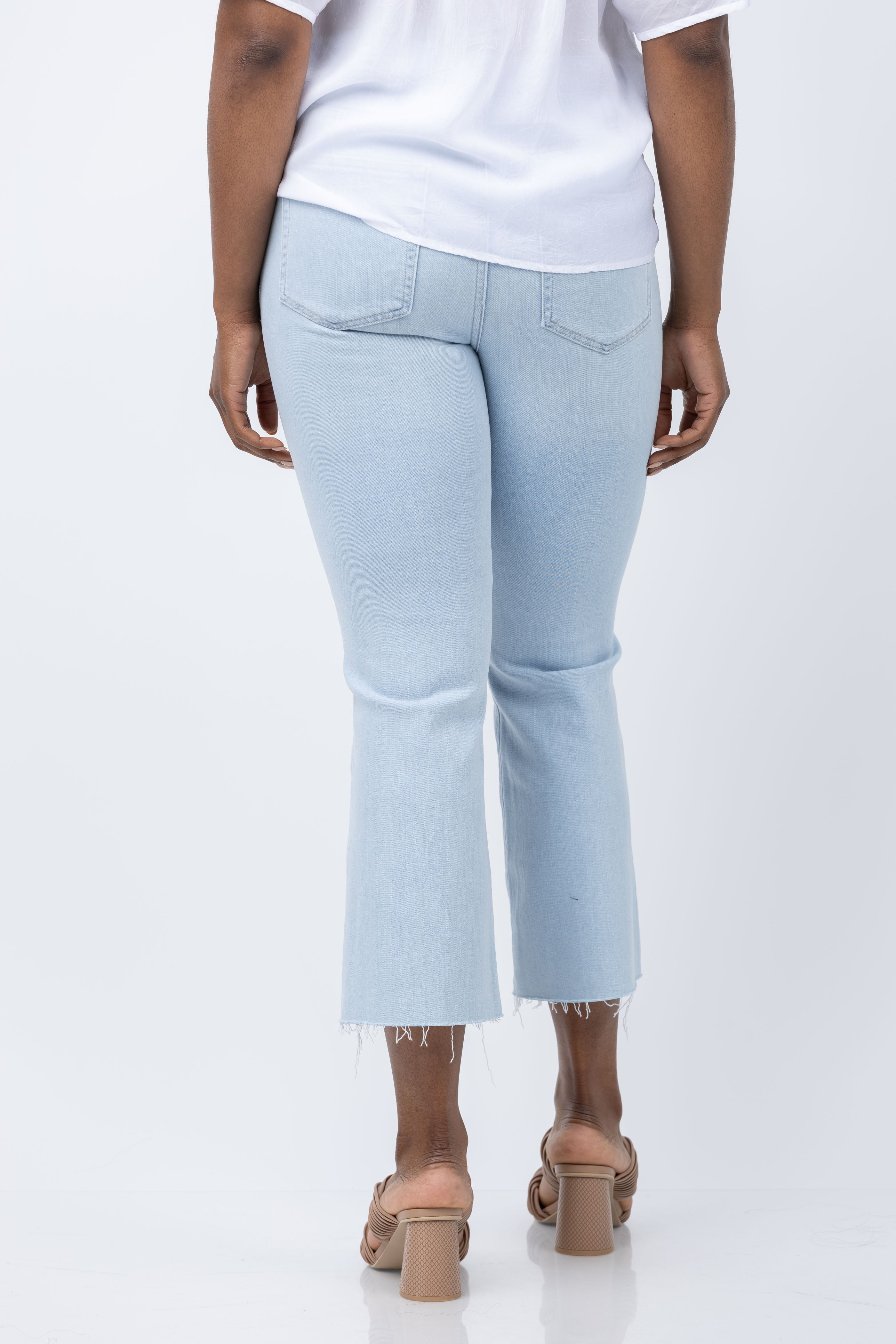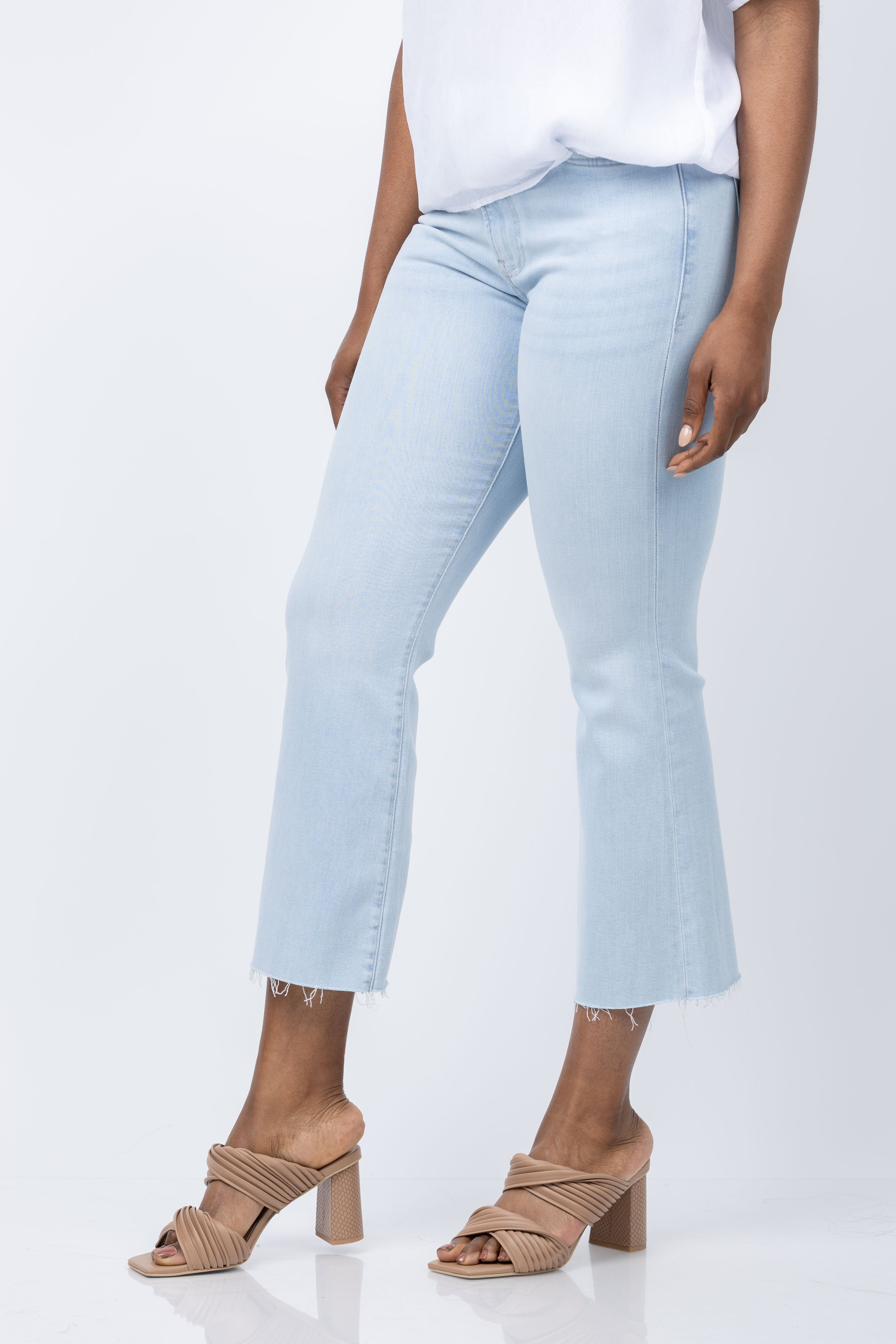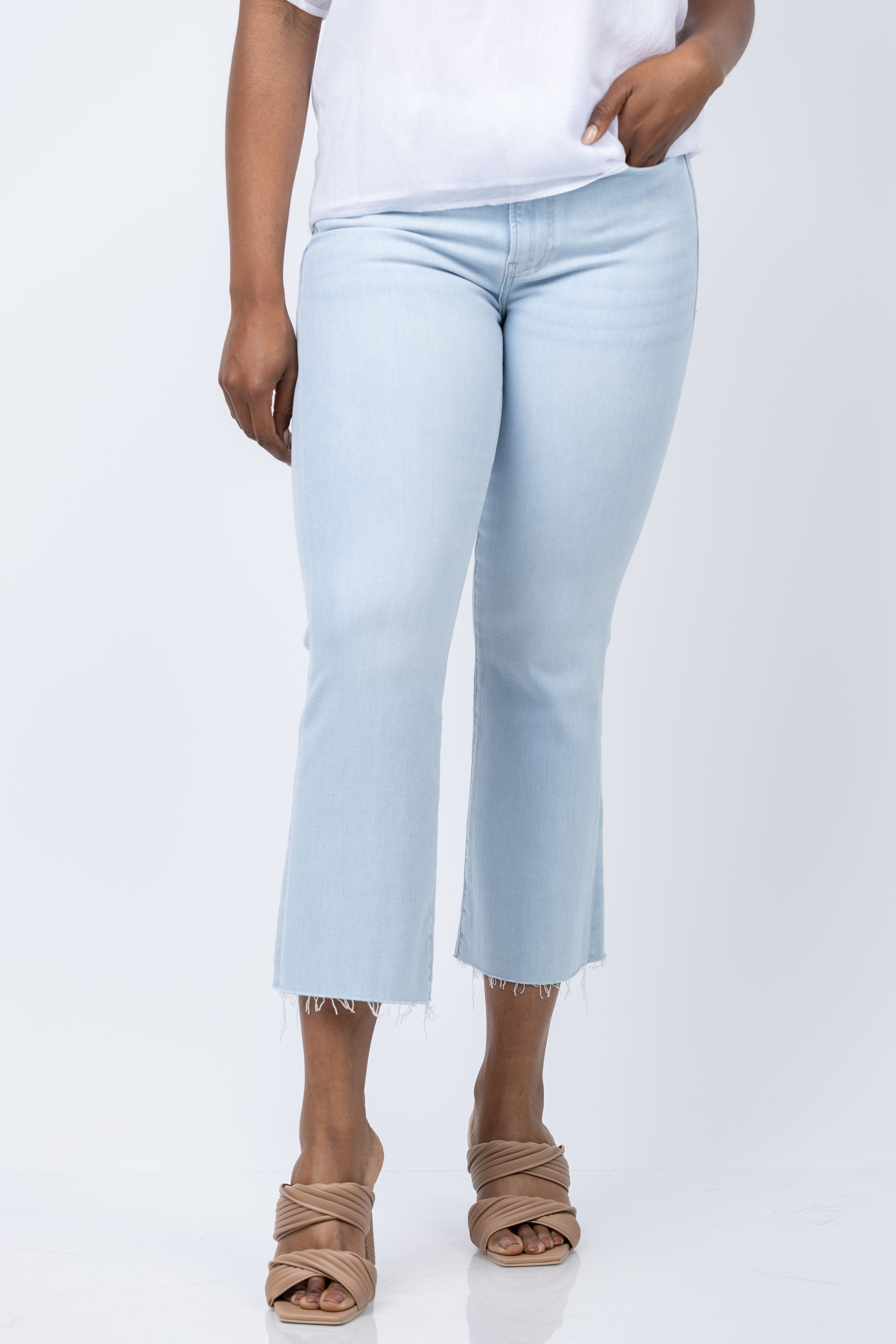 Elevate your denim game with Frame's Le Crop Mini Boot Jean in Clarity. The jagged raw-edge hemline and heavy fraying give an edgy, vintage feel to these cropped jeans. The subtle bootcut silhouette and stretch fabric ensure a flattering fit. Embrace your inner fashionista and make a statement in these must-have jeans.