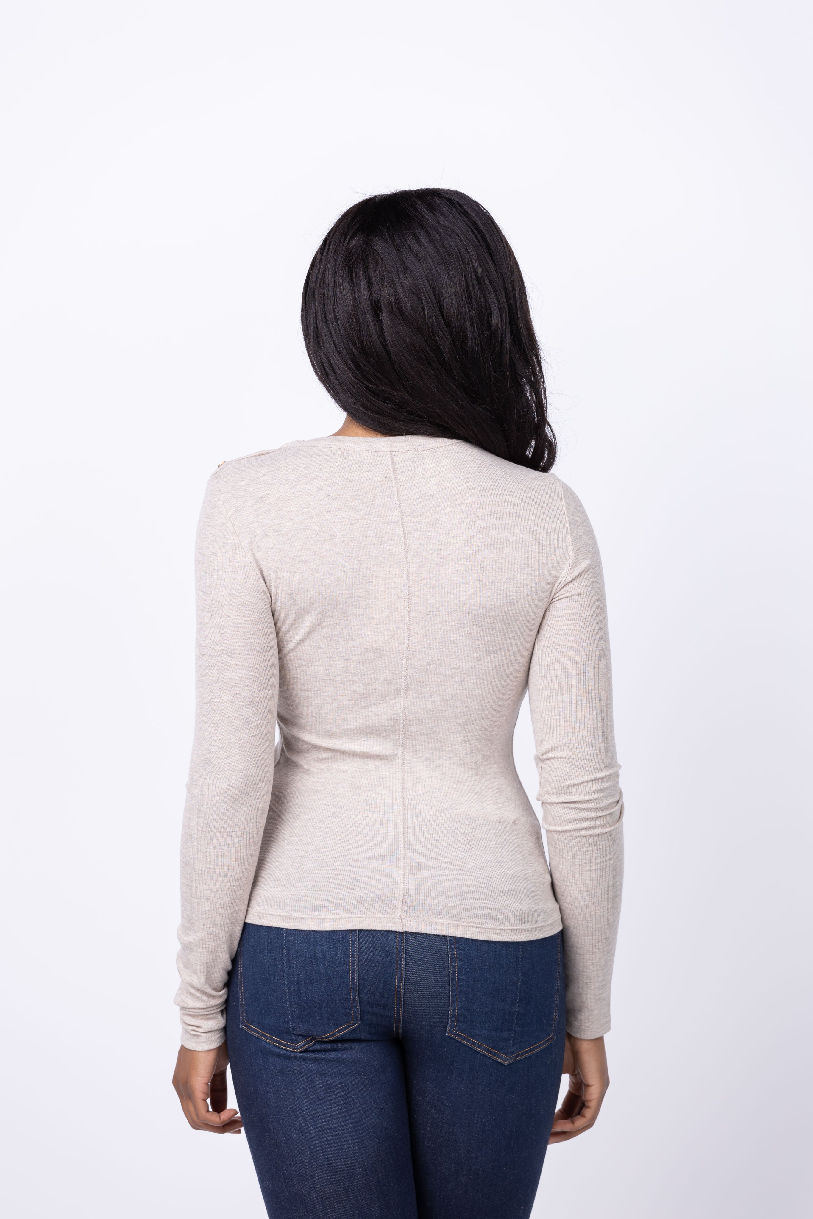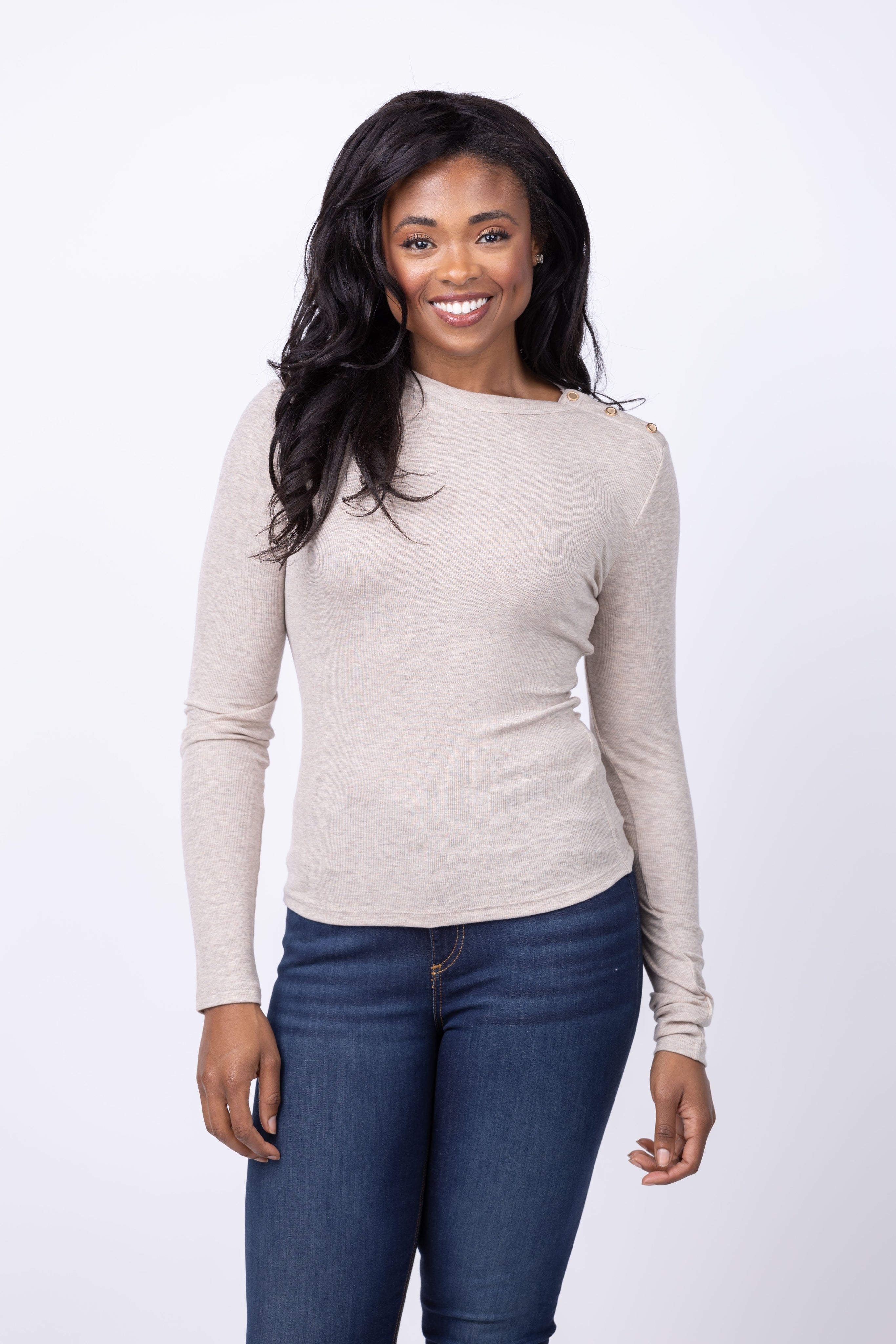This frame long sleeve rib button crew in oatmeal heather is a luxurious seasonal basic that will become a closet staple. The micro-ribbed fabric adds texture, while the gold buttons at the shoulder add a touch of detail that is both classic and timeless. Perfect for layering, this top will smooth and tuck effortlessly into your favorite pair of jeans.