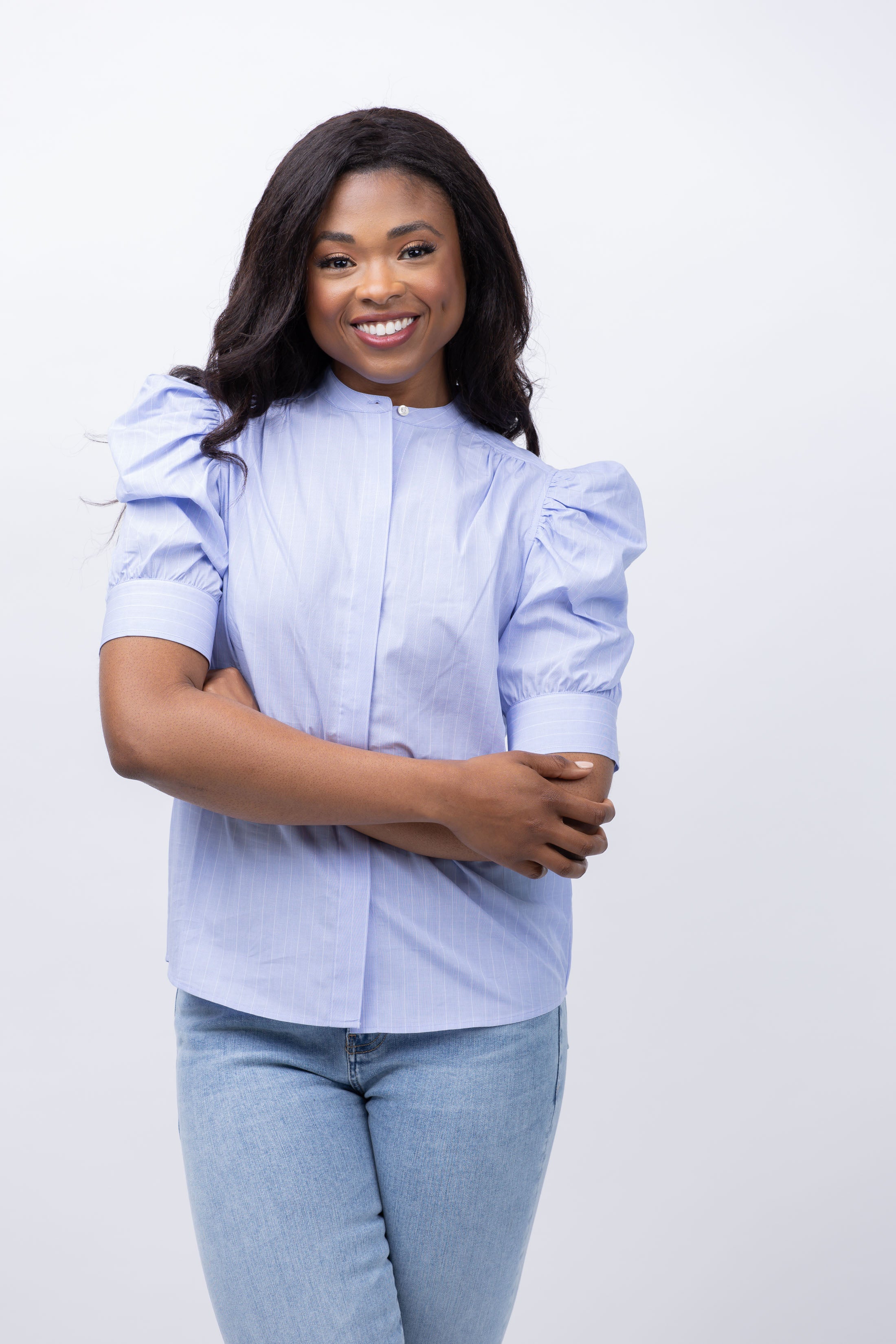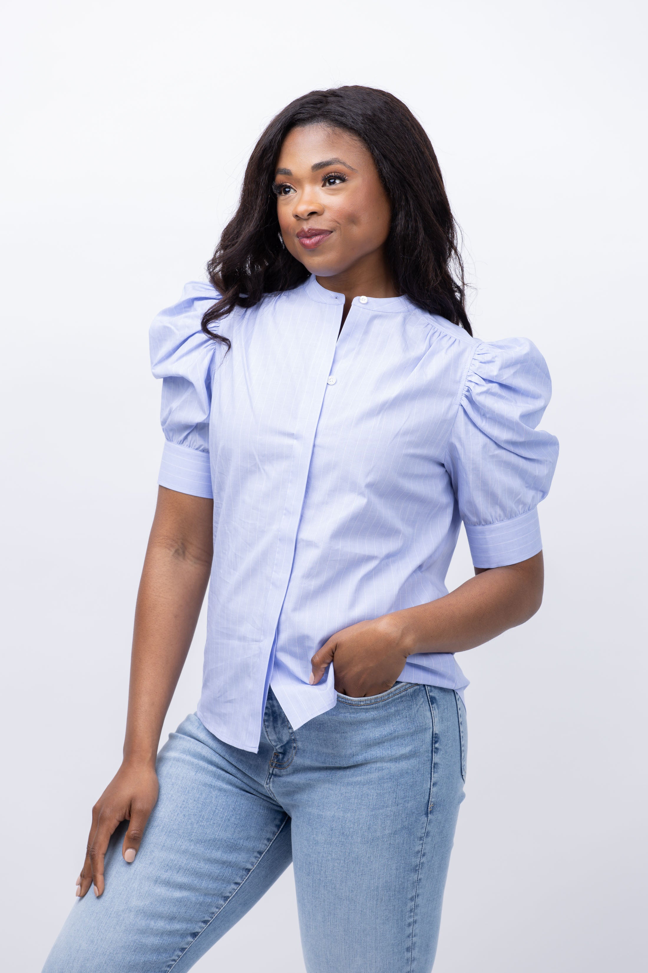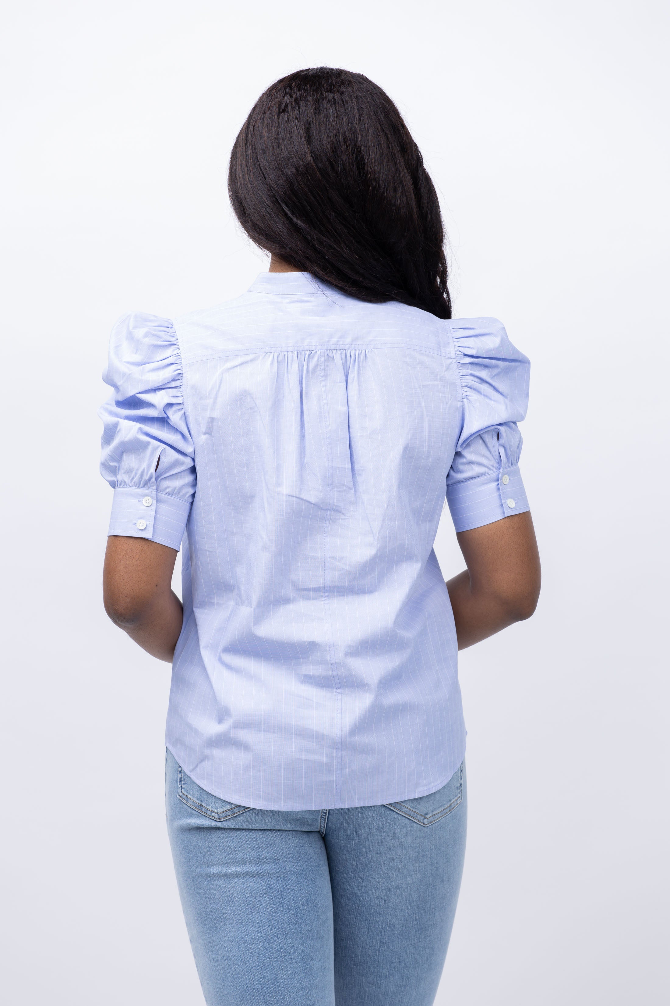Elevate your wardrobe with the FRAME Puff Sleeve Blouse in Chambray Blue. Crafted from crisp cotton, this button-down features sculptural ruched sleeves and a clean placket with mandarin collar for a perfect blend of masculine and feminine energy. Professional with trousers, playful with skirts and shorts - the outfit possibilities are endless!