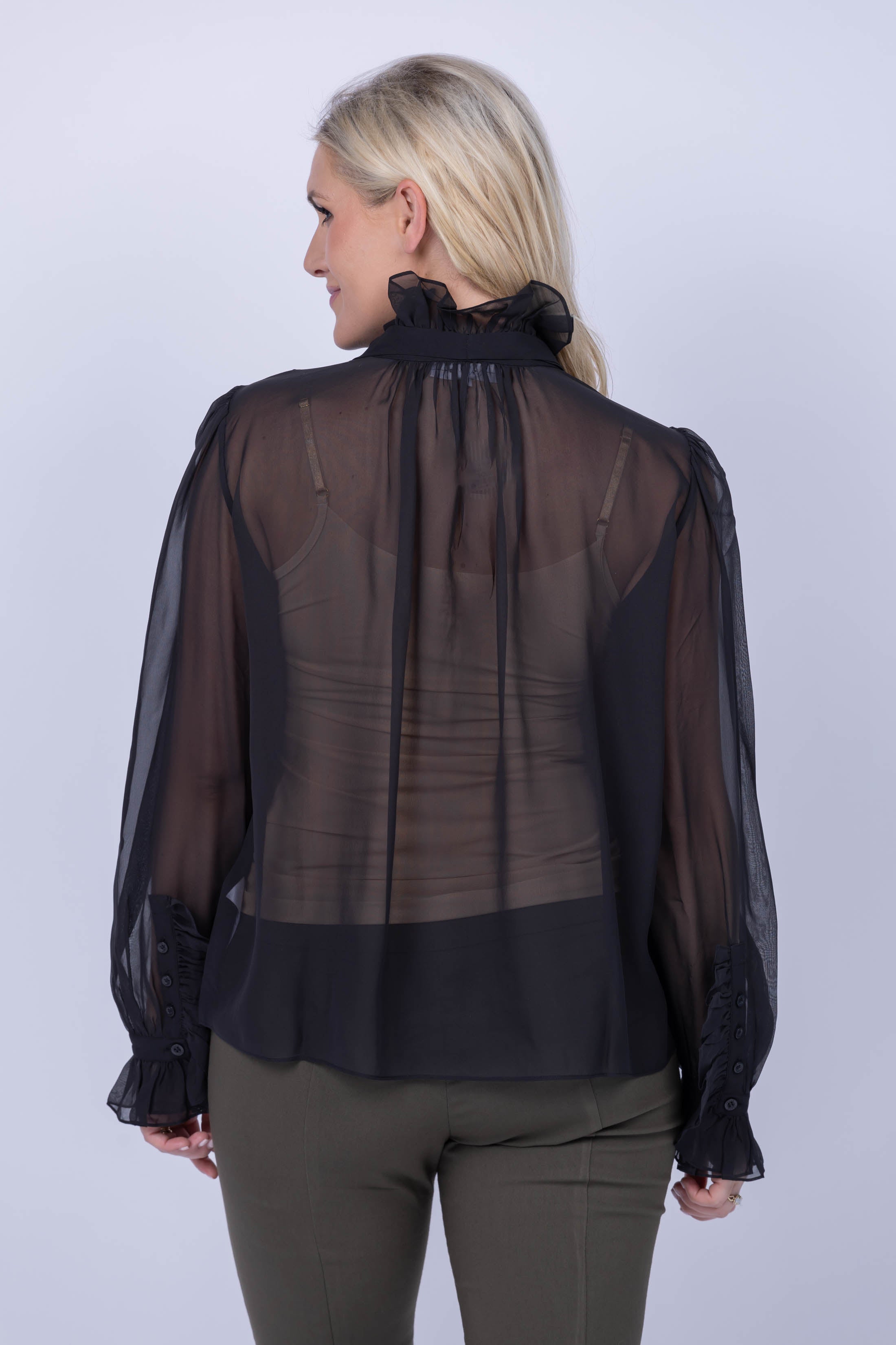 Feel your best in the Frame Ruffle Front Button Up Top in Noir. Crafted with the luxurious 100% silk chiffon, this sheer long sleeve blouse features a ruffled collar with a long ribbon neck tie for an elegant touch. Fall in love with the draped silhouette with shirring, button closure, and luxurious ruffle detailing at the front and cuffs. Make a statement today!