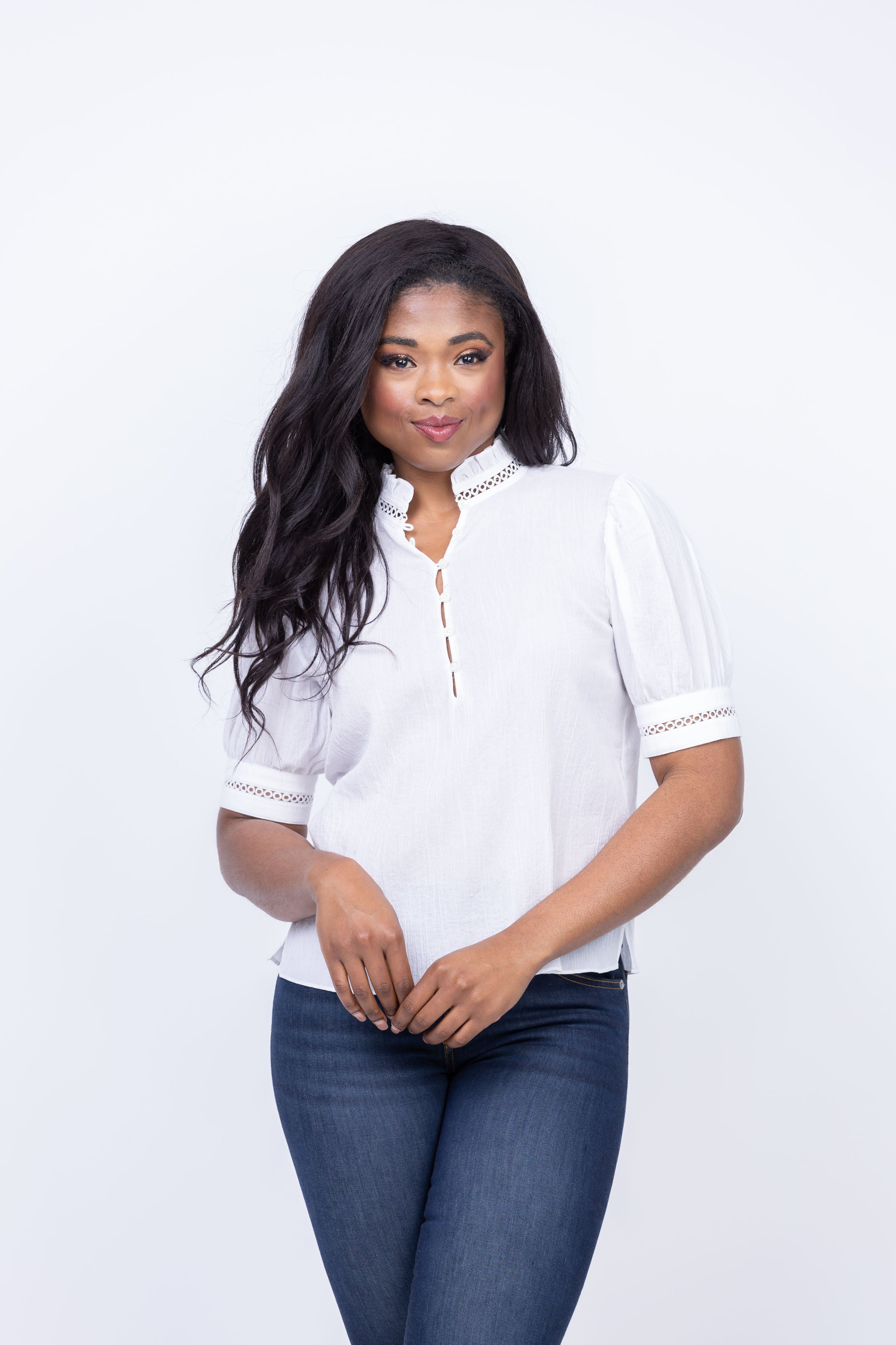 Add a touch of charm to your wardrobe with Frame's Ruffle Collar Top. Crafted of crisp cotton, this top features a delicate ruffled collar and crochet trimming for a romantic feel. The half button-front closure adds a touch of flair to this short-sleeve top. Perfect for any occasion!