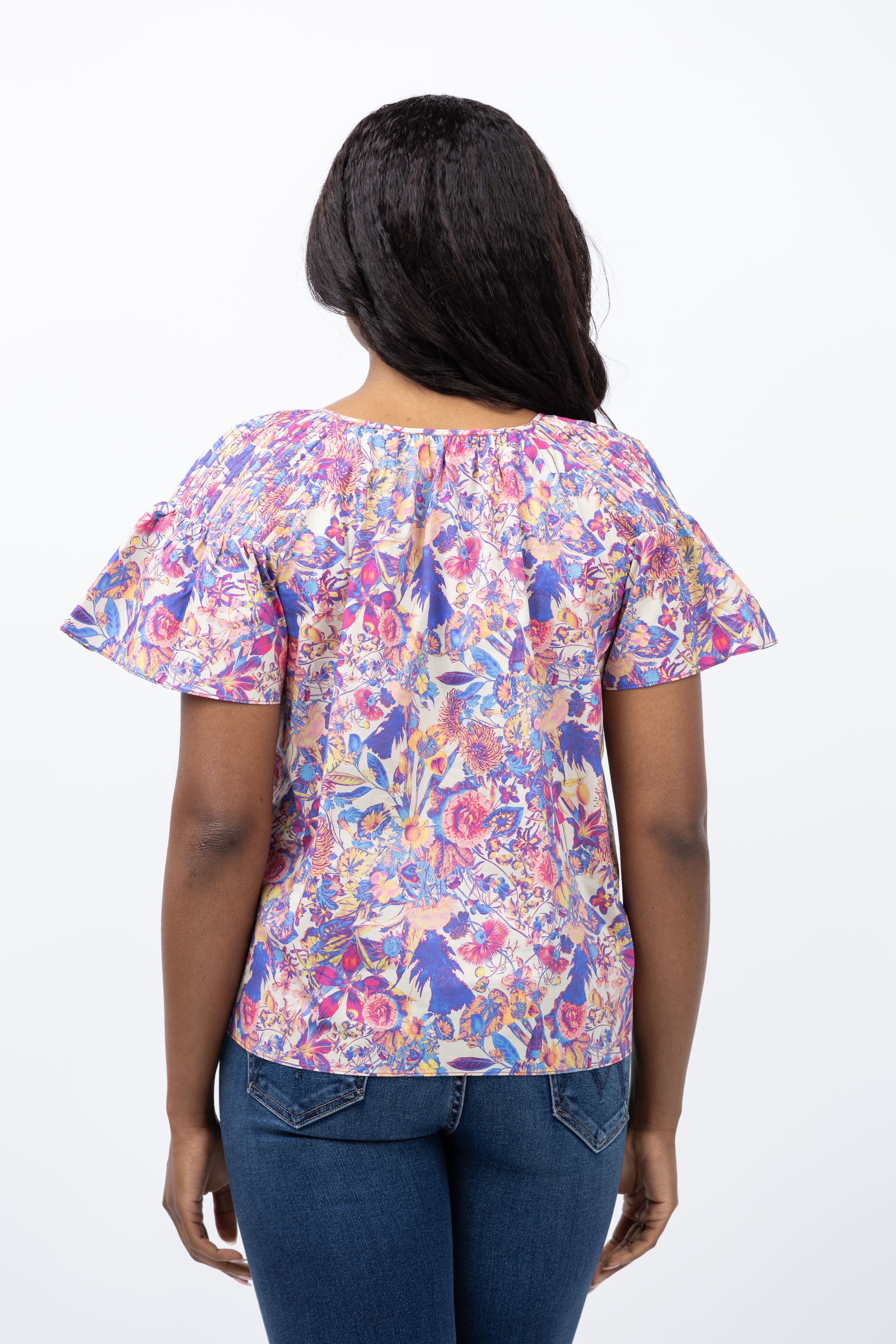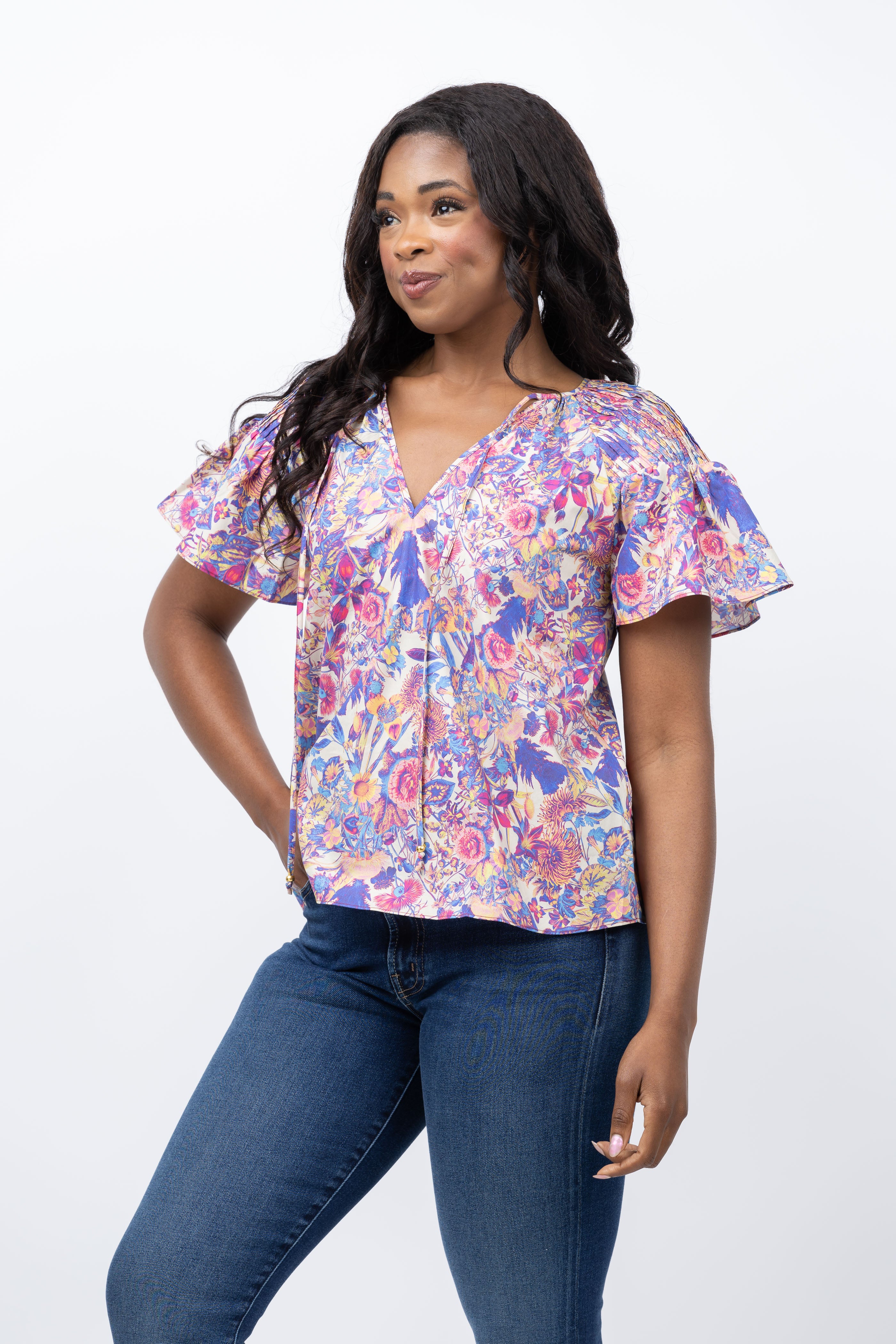 Be enchanted by the Gilner Farrar Aileen Blouse in Loire Valley Print! Its charming floral design and playful ruffle sleeves will add an elegant touch to any outfit. With a flattering v-neck and stylish neck ties, this blouse is the perfect choice for any occasion. Elevate your wardrobe with this beautiful piece today!