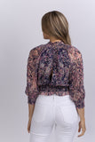 This beautiful sheer-sleeve blouse has a higher neckline, elastic waistband, and open back for an extra touch.