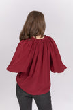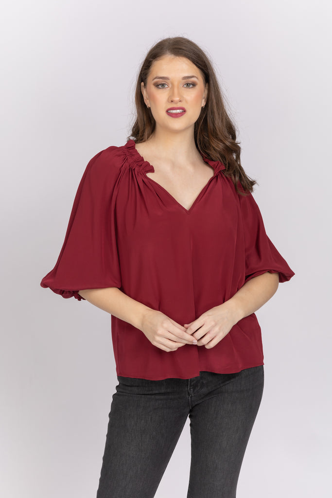 Classic blouse silhouette with ruffle v neck and 3/4 elastic sleeves, in a gorgeous dark red color perfect for fall.Â