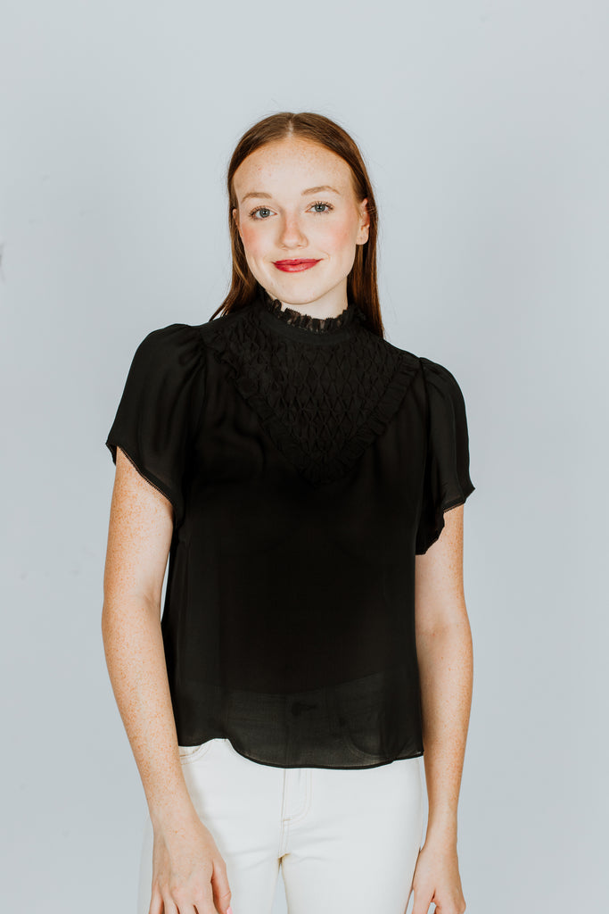With loose cap sleeves and a ruffled mock neck, this piece is perfect for layering or can be worn on its own as shown.