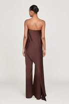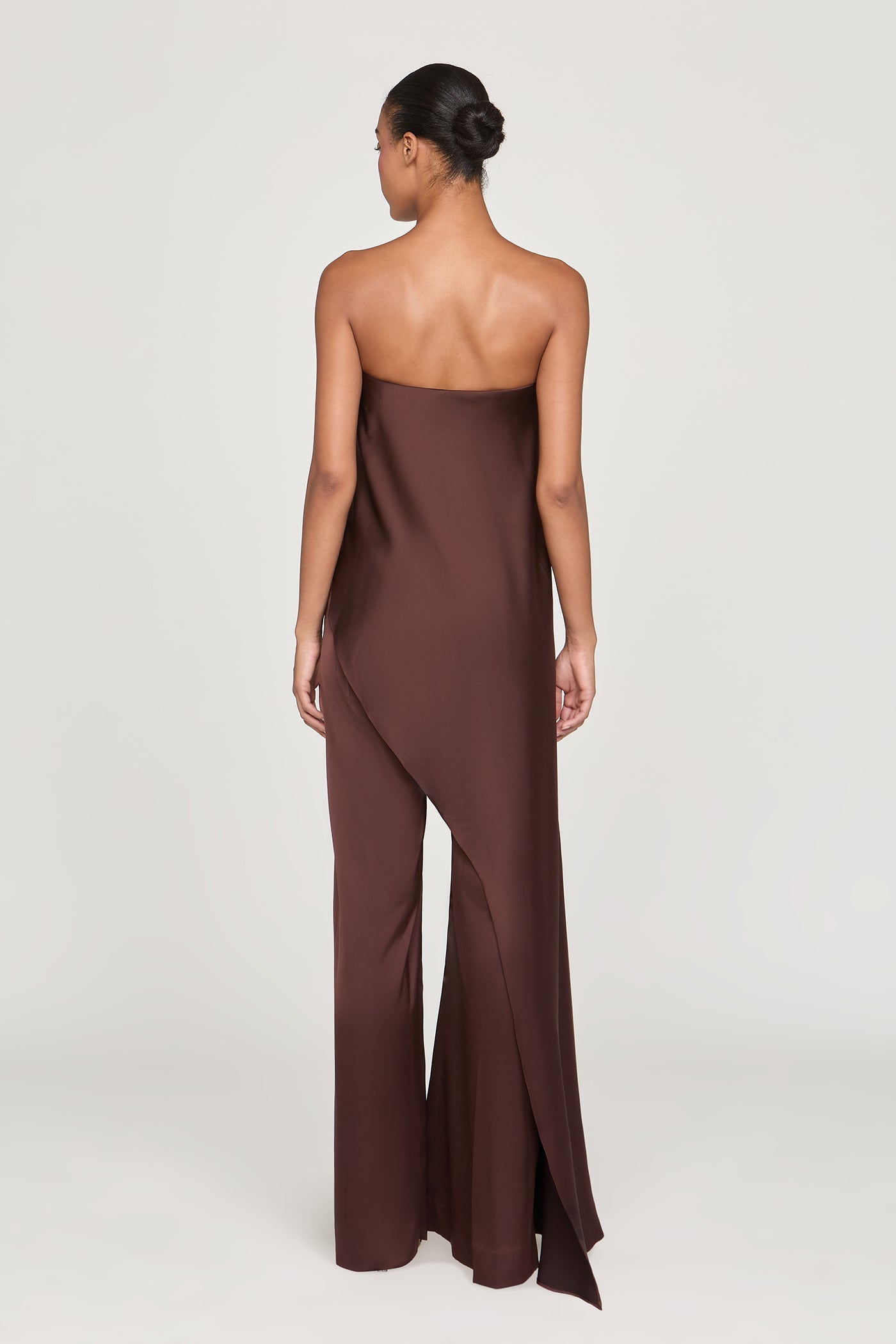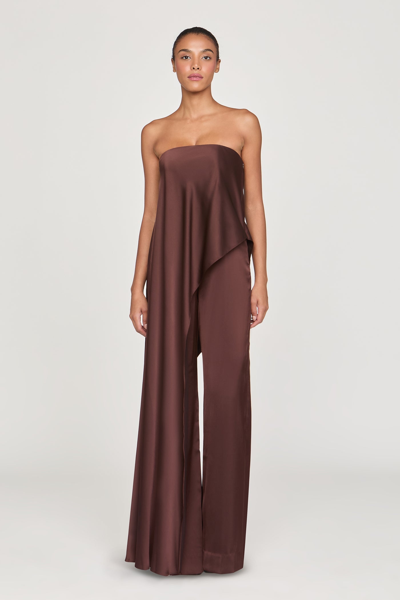 This strapless Halston Sonia Crepe Jumpsuit in Chocolat features an elegant crepe-back satin fabric with a subtle sheen that highlights its sophisticated design. The asymmetric draped overlay adds a striking detail, while the wide-leg cut ensures graceful movement and comfort. Perfect for making a refined statement with minimal effort, this jumpsuit combines modern style with timeless appeal.