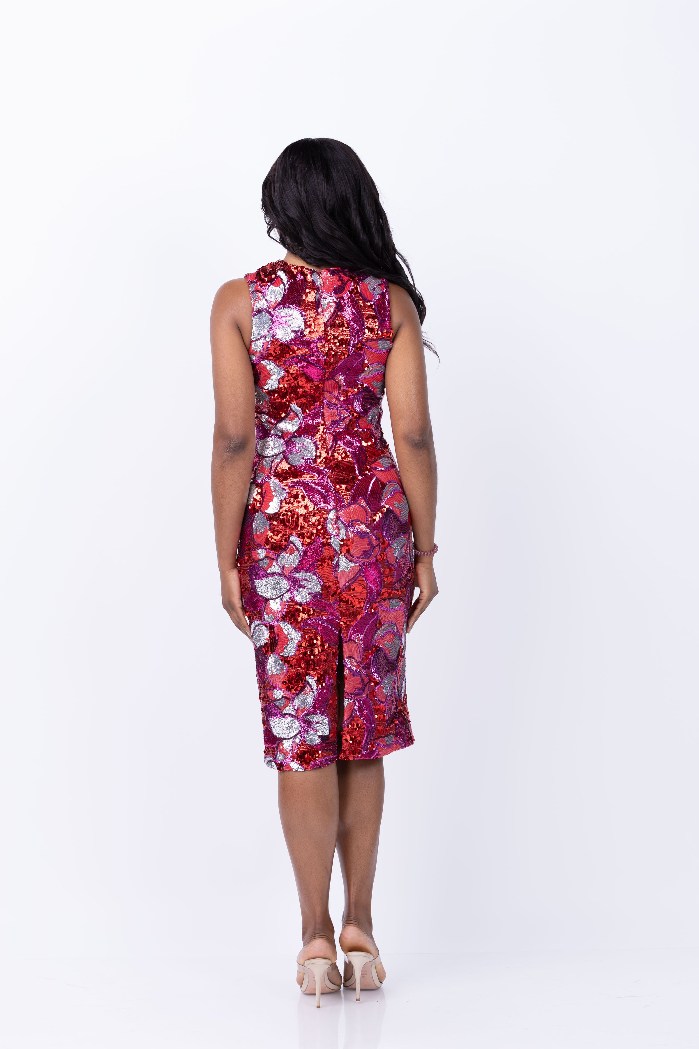 Elevate your style with the Helsi Alex Dress in Fuchsia/Red! This head-turning dress features a fully lined polyester inner lining for comfort and a body-conscious silhouette for a flattering fit. The center back zipper closure and center back slit add a touch of sophistication, while the high neckline and sleeveless midi design create a chic look. The stretch sequin fabric adds a touch of glamour to any occasion.