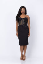 This stunning black midi dress features an eye-catching 3D floral sequin applique that commands attention. The structured bustier bodice with built-in bra cups and underwire provides confident support, while covered boning at the front and back ensures a flattering, body-con silhouette. Fully lined for comfort and finished with a sleek back seam zipper, this dress transitions effortlessly from evening events to special occasions. The intricate beadwork and architectural design make it an unforgettable statement piece.