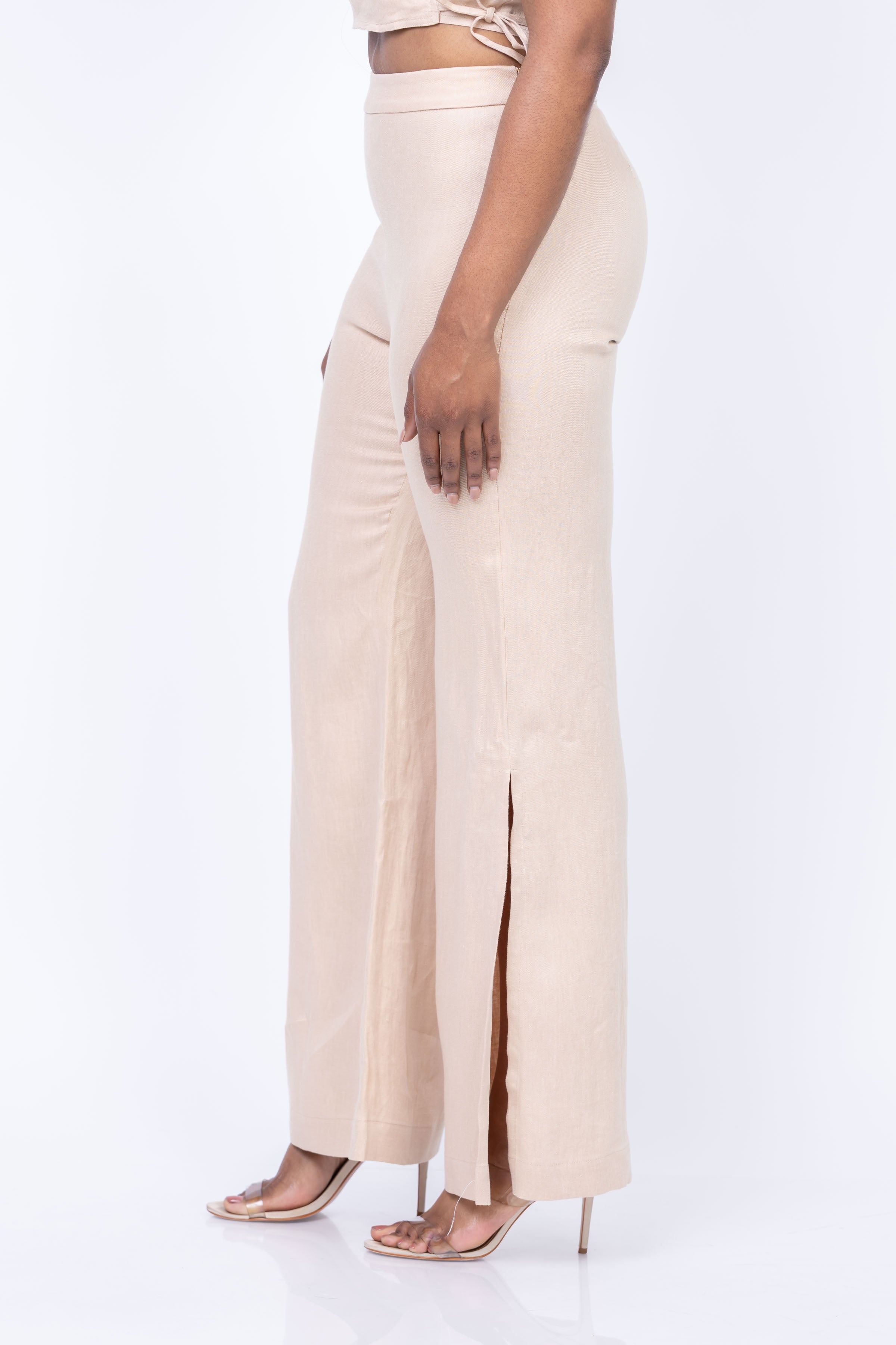 Introducing the Hevron Dara Pant in Wheat! Made from 100% soft-to-touch hemp, this pant boasts a high-rise, fitted waistband and a loose leg for ultimate comfort. Features a floor-length hemline, side slits, and wider-leg silhouette for a flattering and effortlessly stylish look. Elevate your wardrobe with Dara!