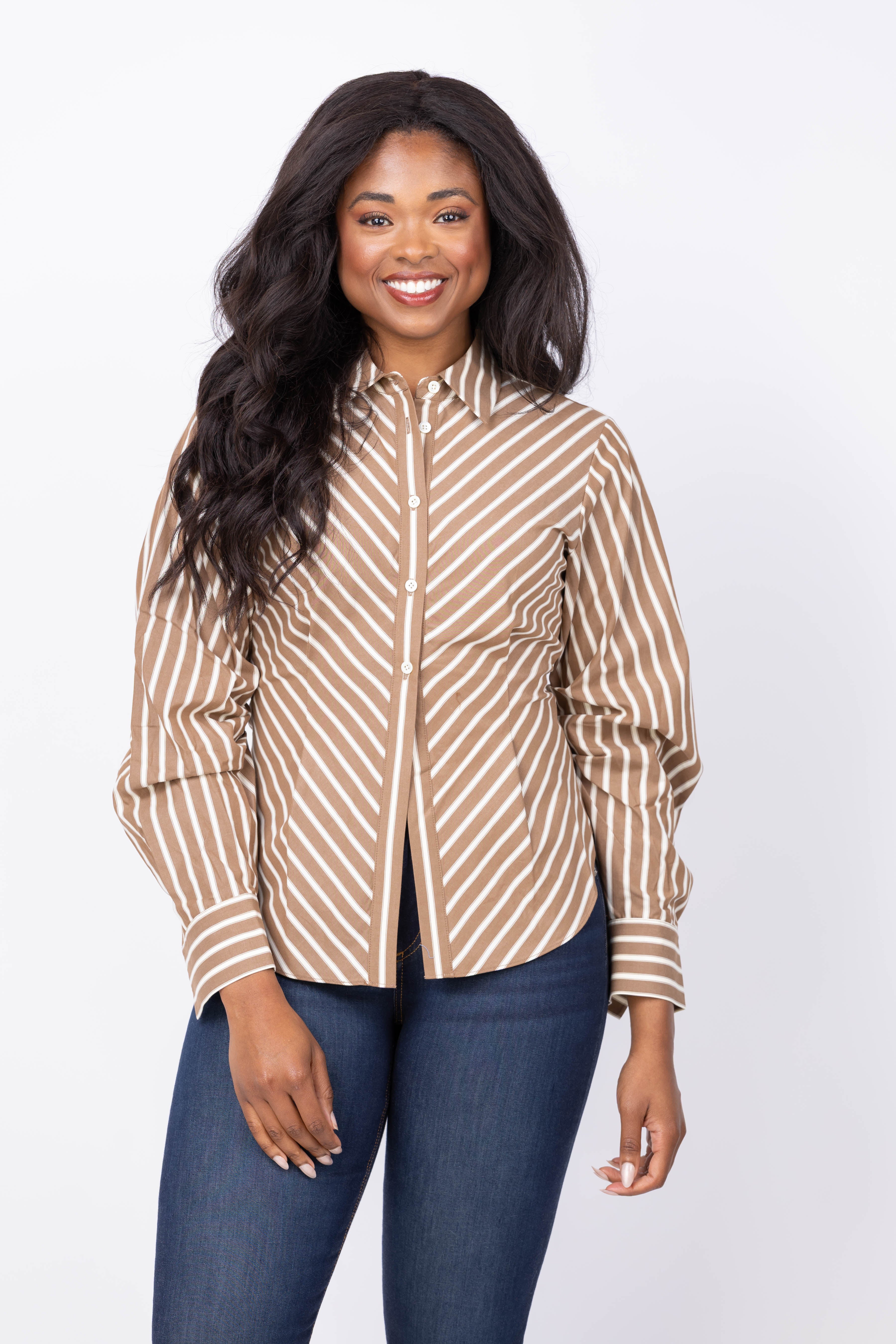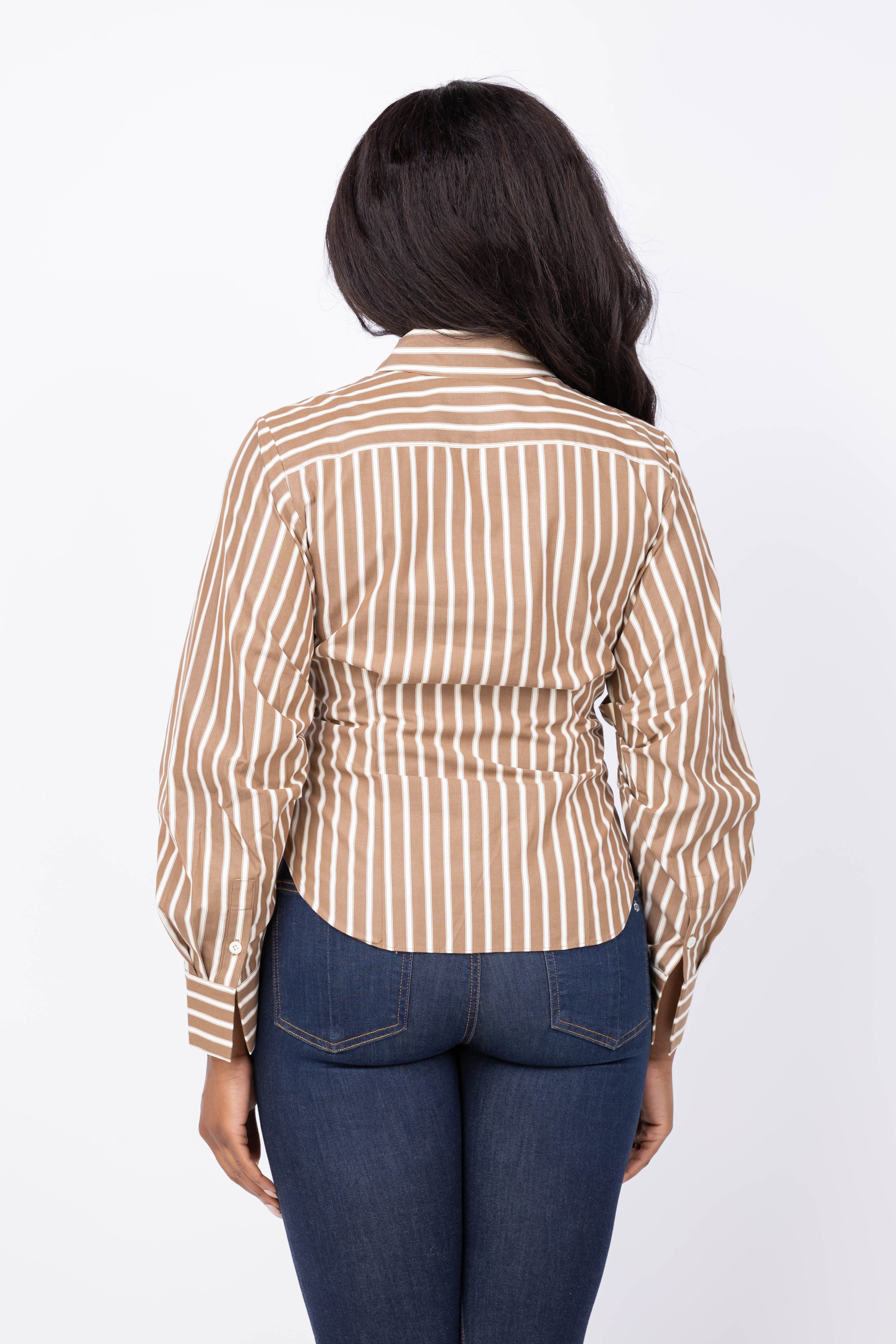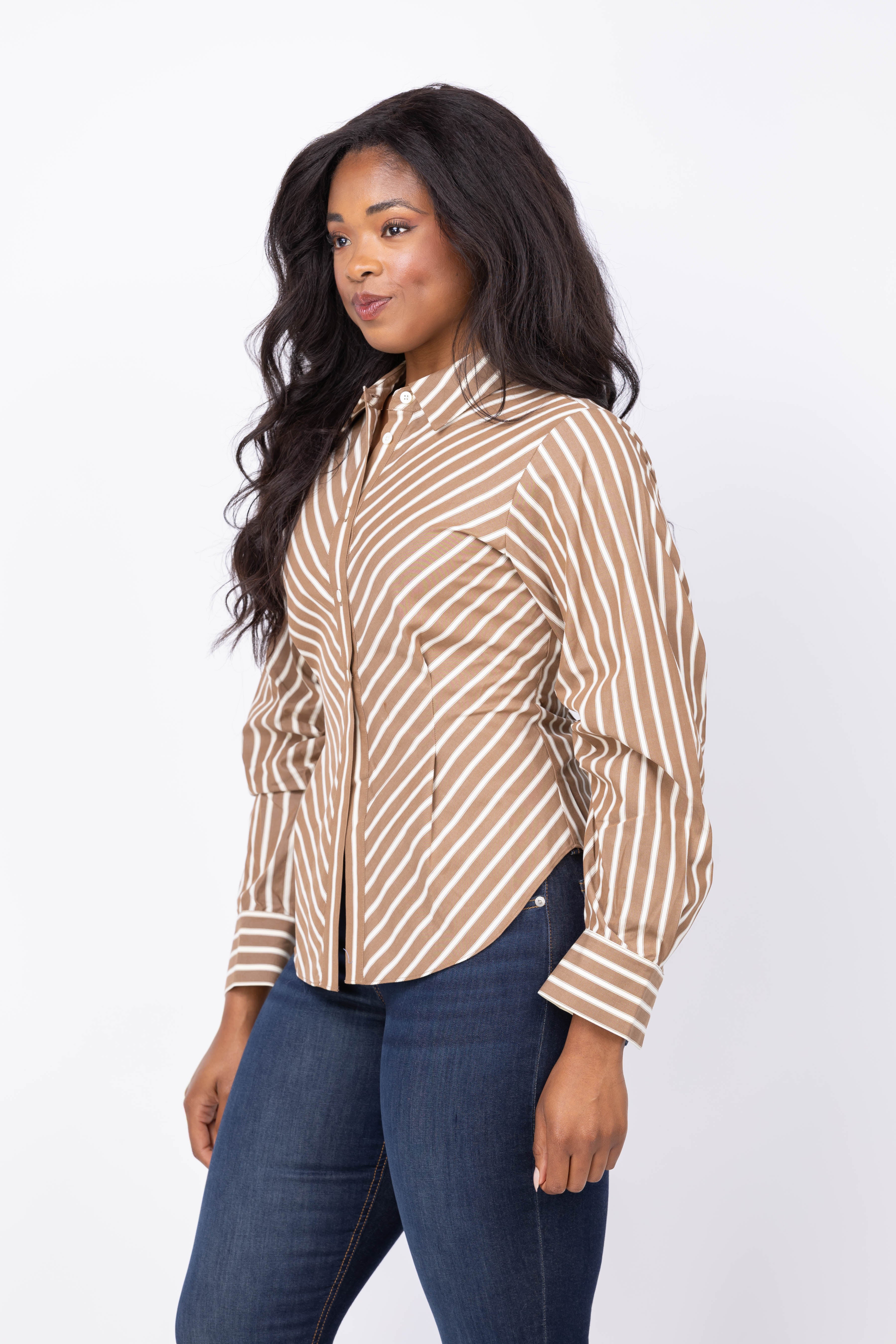 The Hevron Drexel Shirt in Copper Stripe redefines modern style with its unique proportions. Crafted from crisp cotton poplin, it features a clean collar and structured pleats at the elbows for subtle volume. The partially buttoned front opens at the hips, allowing its long-line silhouette to move freely. This shirt perfectly balances tailored sophistication with relaxed ease, making it a versatile piece for both work and casual moments.