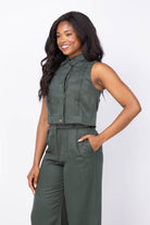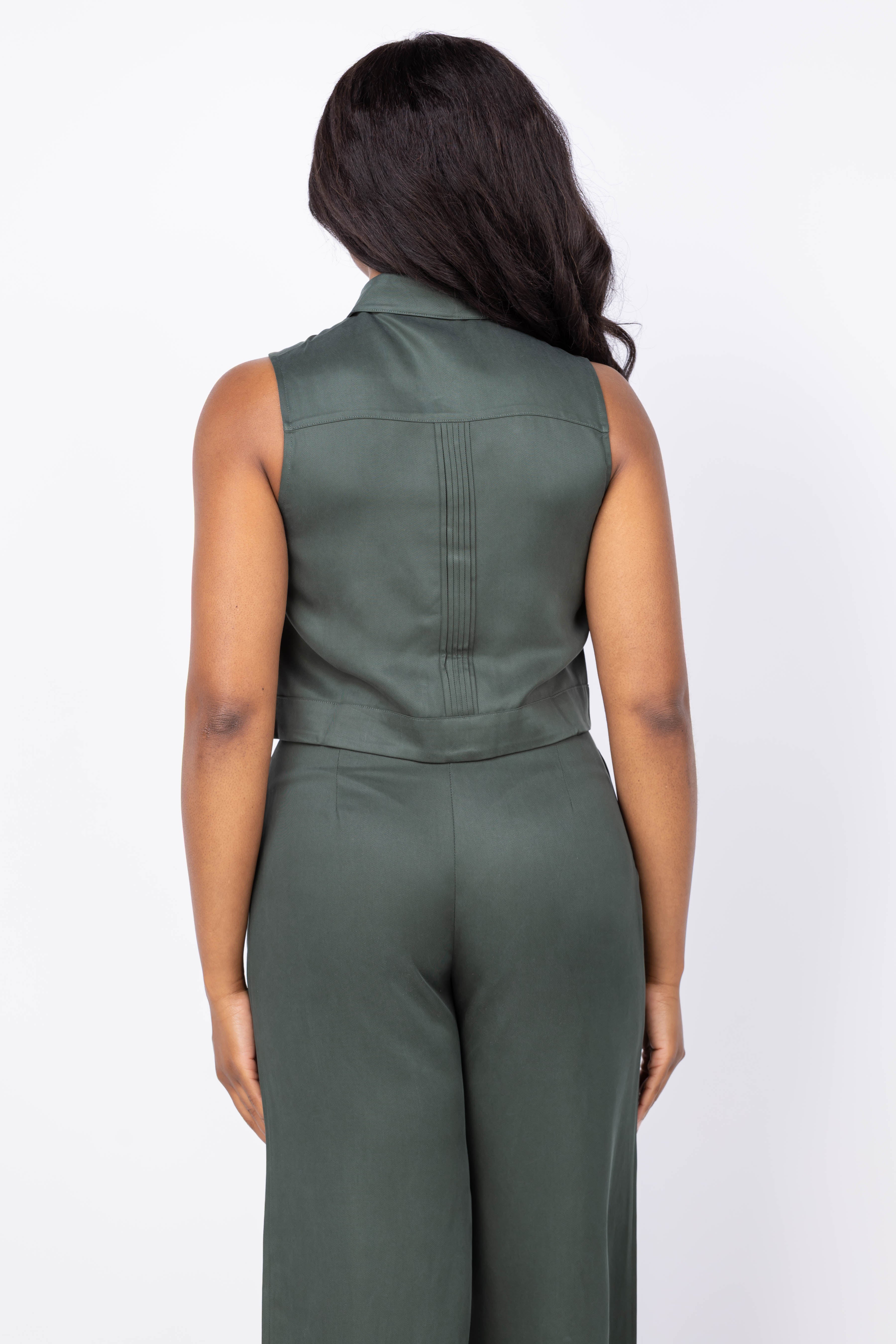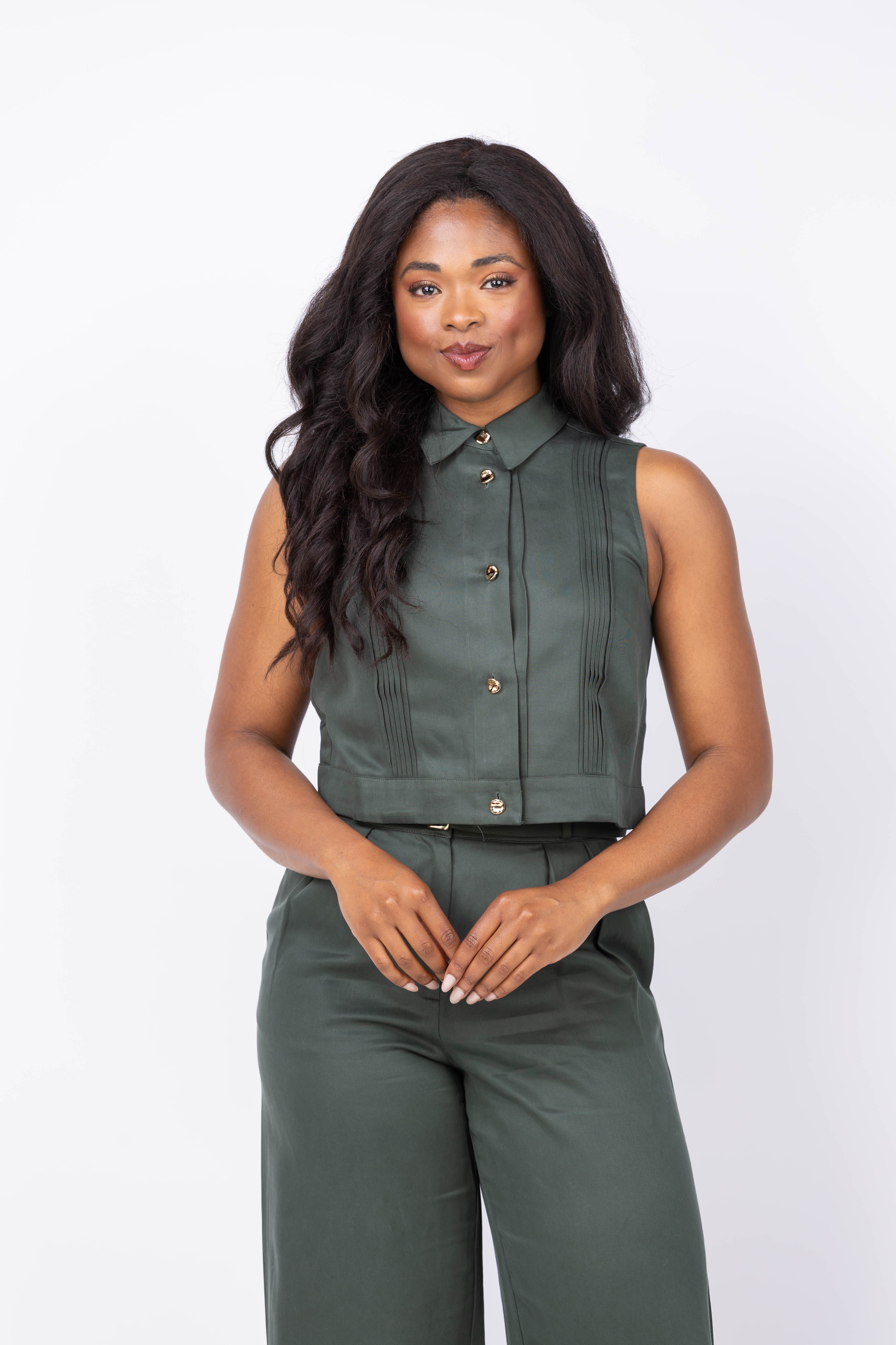 The Hevron Vera Top in Deep Forest offers tailored ease with a refined edge. Crafted from fluid Tencel twill, its boxy, structured fit provides comfort and sophistication. Tuxedo-inspired pleats on the front and back add subtle texture, while a clean collar and delicate buttons create a polished look. This slightly dressier version of the Katja Top pairs effortlessly with the Alina Pant in Tencel or denim, making it a versatile piece for elevated everyday style.