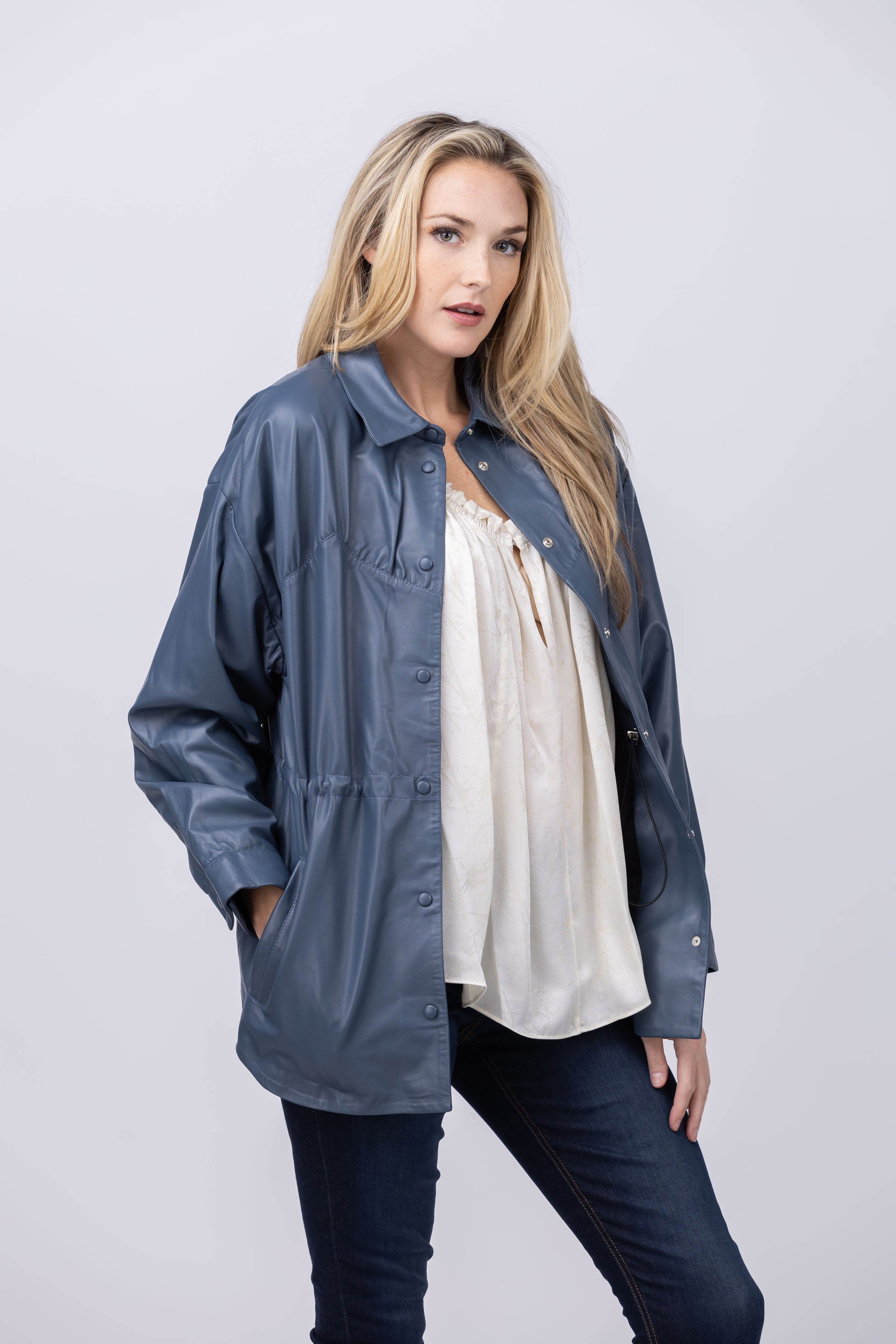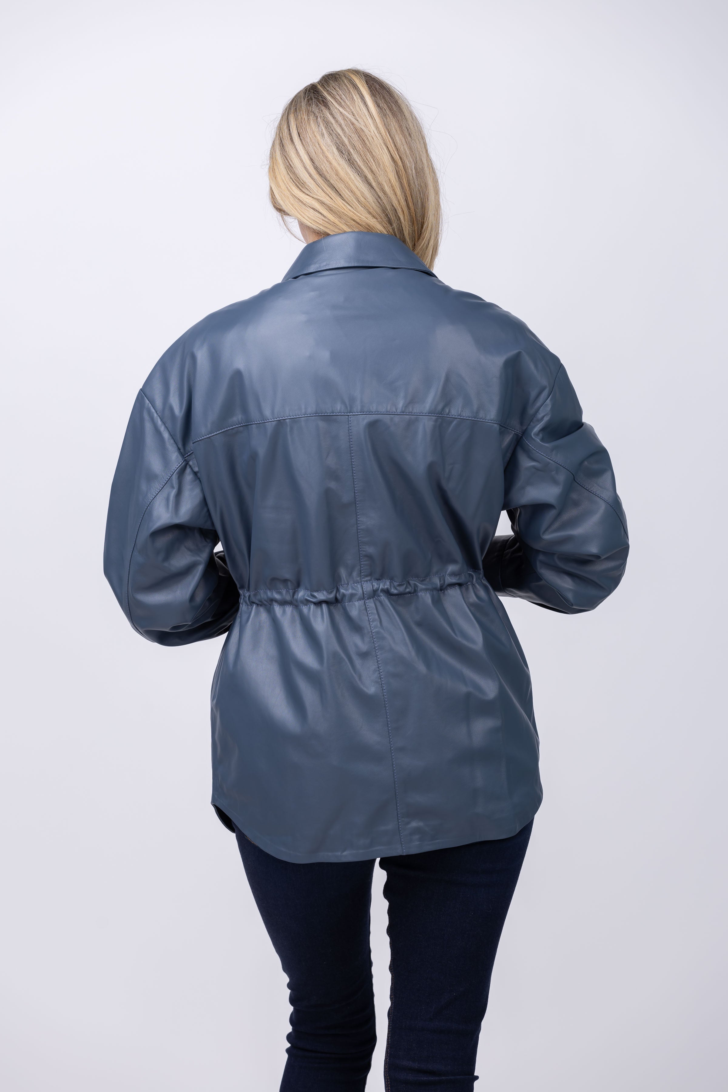 Unleash confident style with the CALISTO leather shirt in Blue Grey. The classic collar and elastic waistband add a touch of sophistication while the fully lined interior keeps you comfortable. Securely fasten with snap closures. A statement piece that merges classic and contemporary for an unforgettable look!